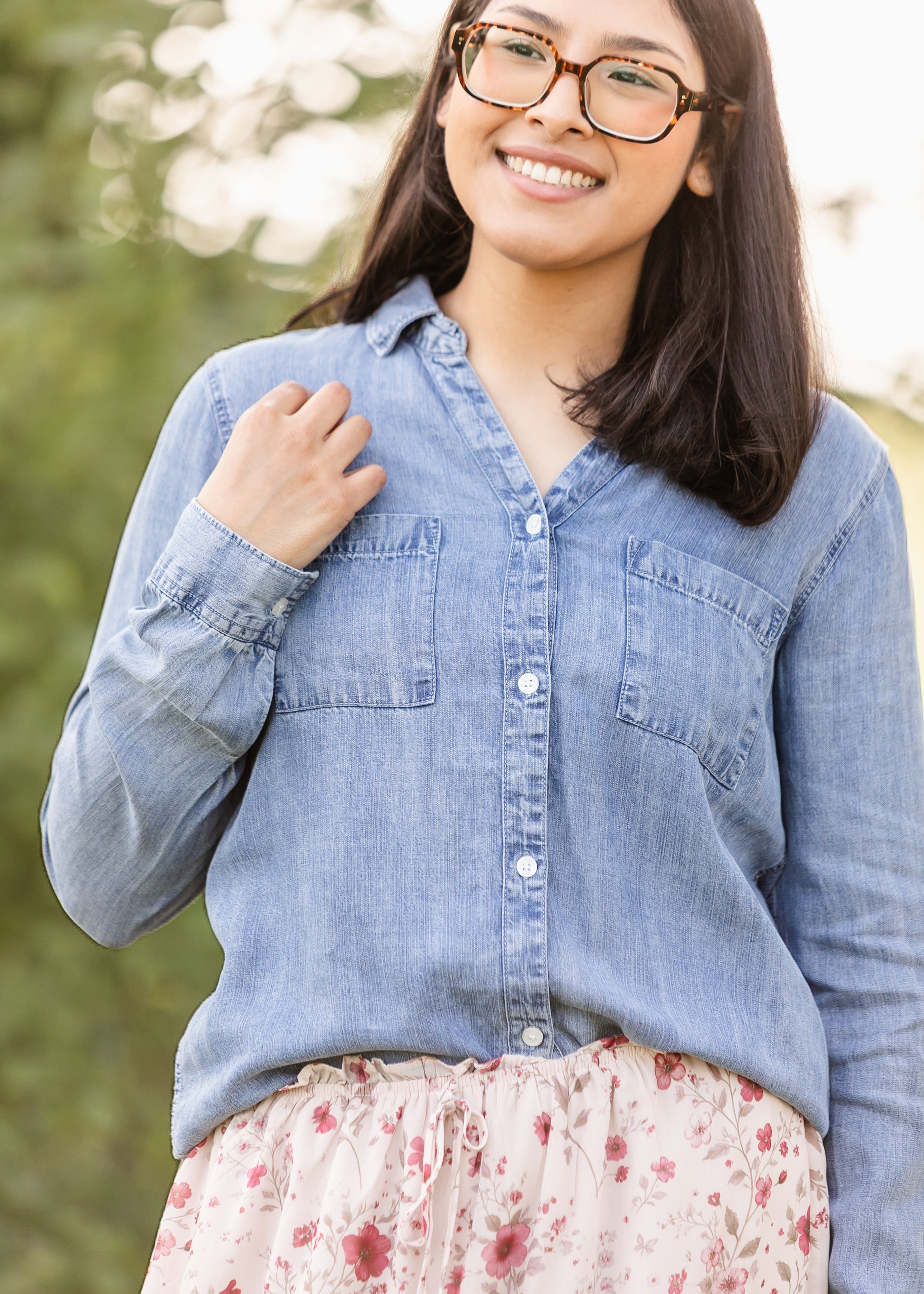 The Thread & Supply® Ginger Top is a soft chambray button-down featuring a flattering V-neckline and double chest pockets. Its lightweight feel makes it perfect for layering or wearing solo, easily pairing with skirts, trousers, or denim for a polished yet relaxed look. A timeless staple, it transitions seamlessly from casual outings to workdays with effortless style!