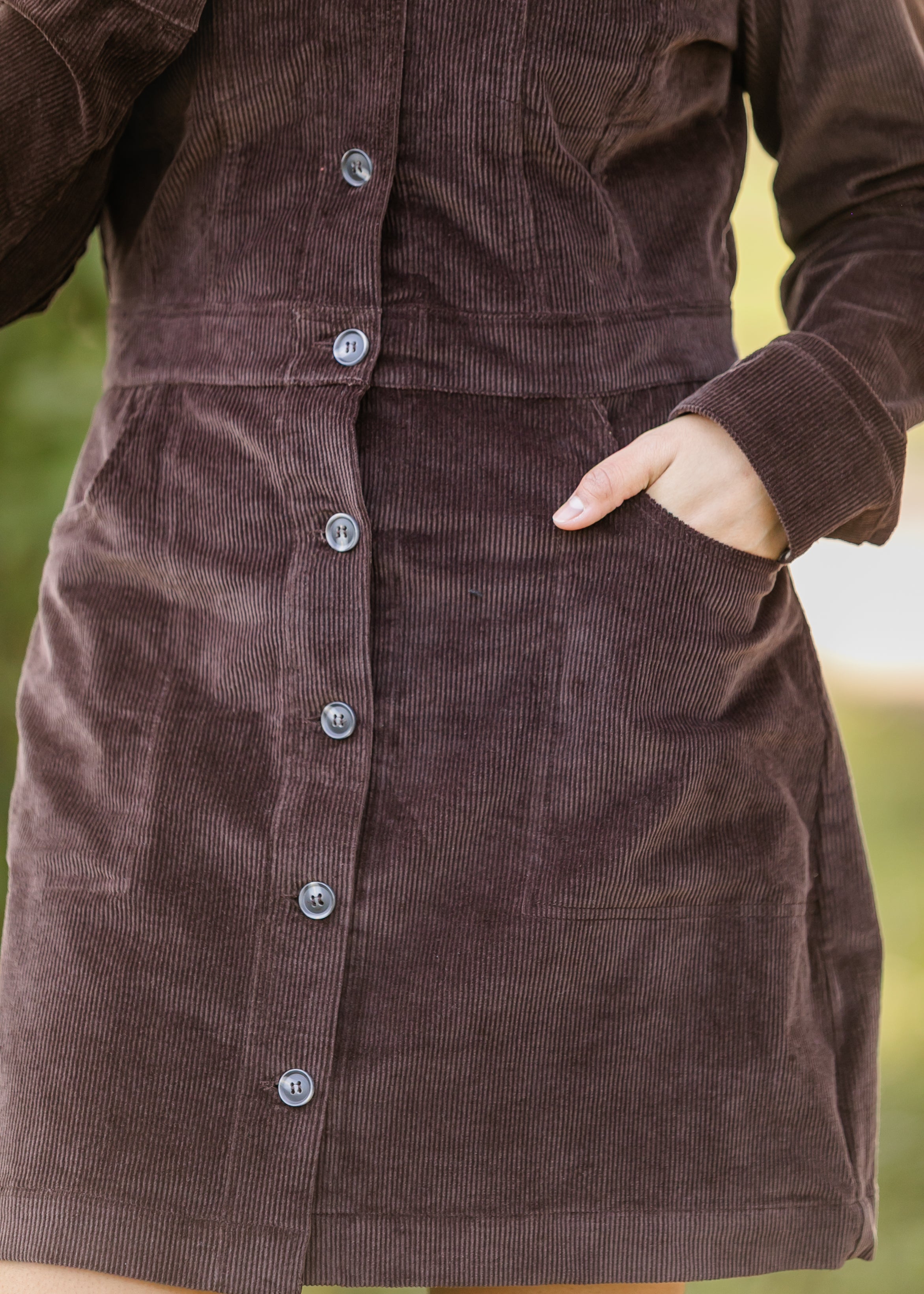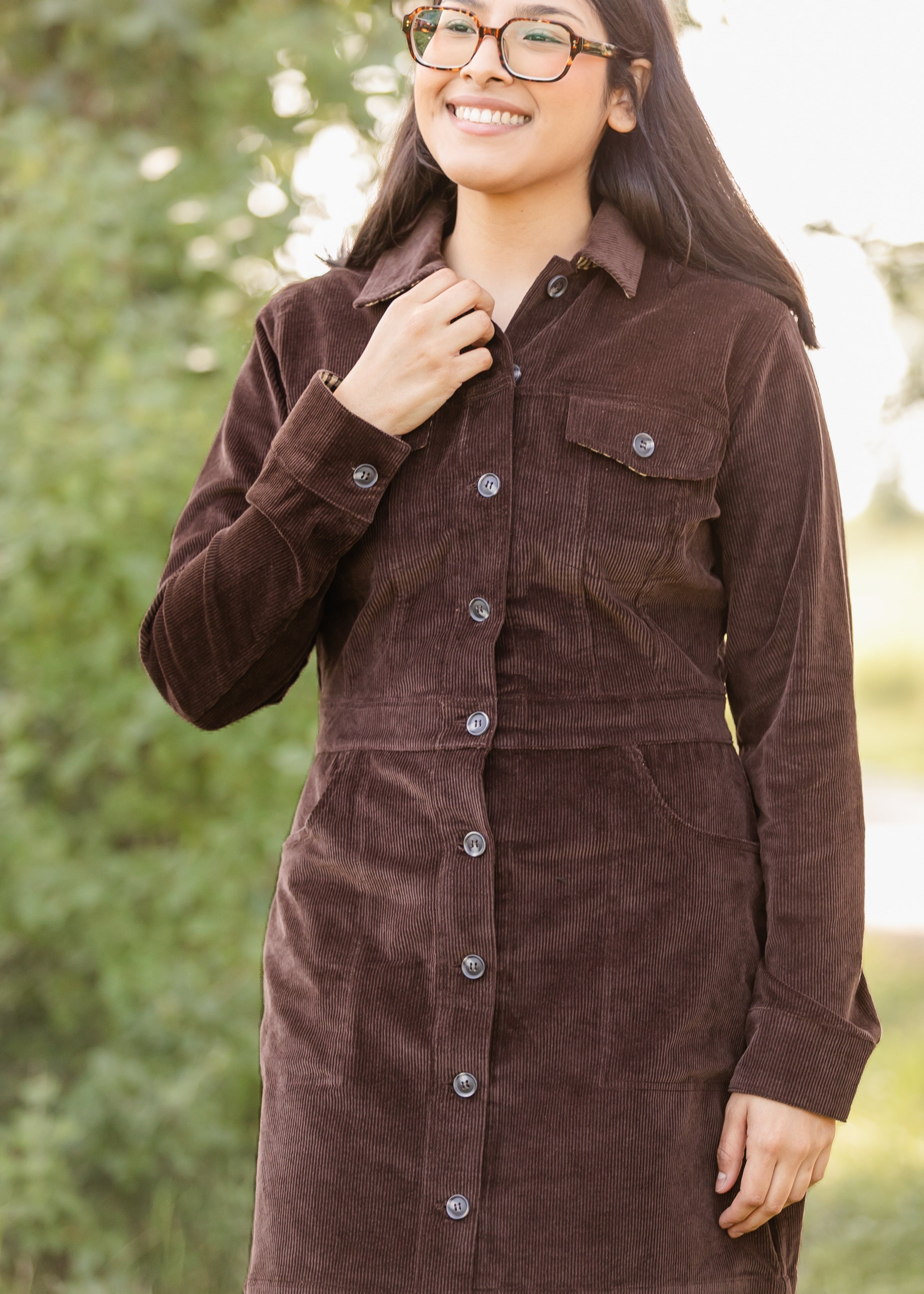 The Thread & Supply® Gladys Cord Dress is a cozy take on a classic, crafted from soft corduroy with a structured button-down front. Featuring long sleeves, chest pockets, and a flattering fit, this dress is perfect for layering with tights or boots as the seasons change. Its timeless chocolate hue makes it an effortless piece for cool-weather styling!