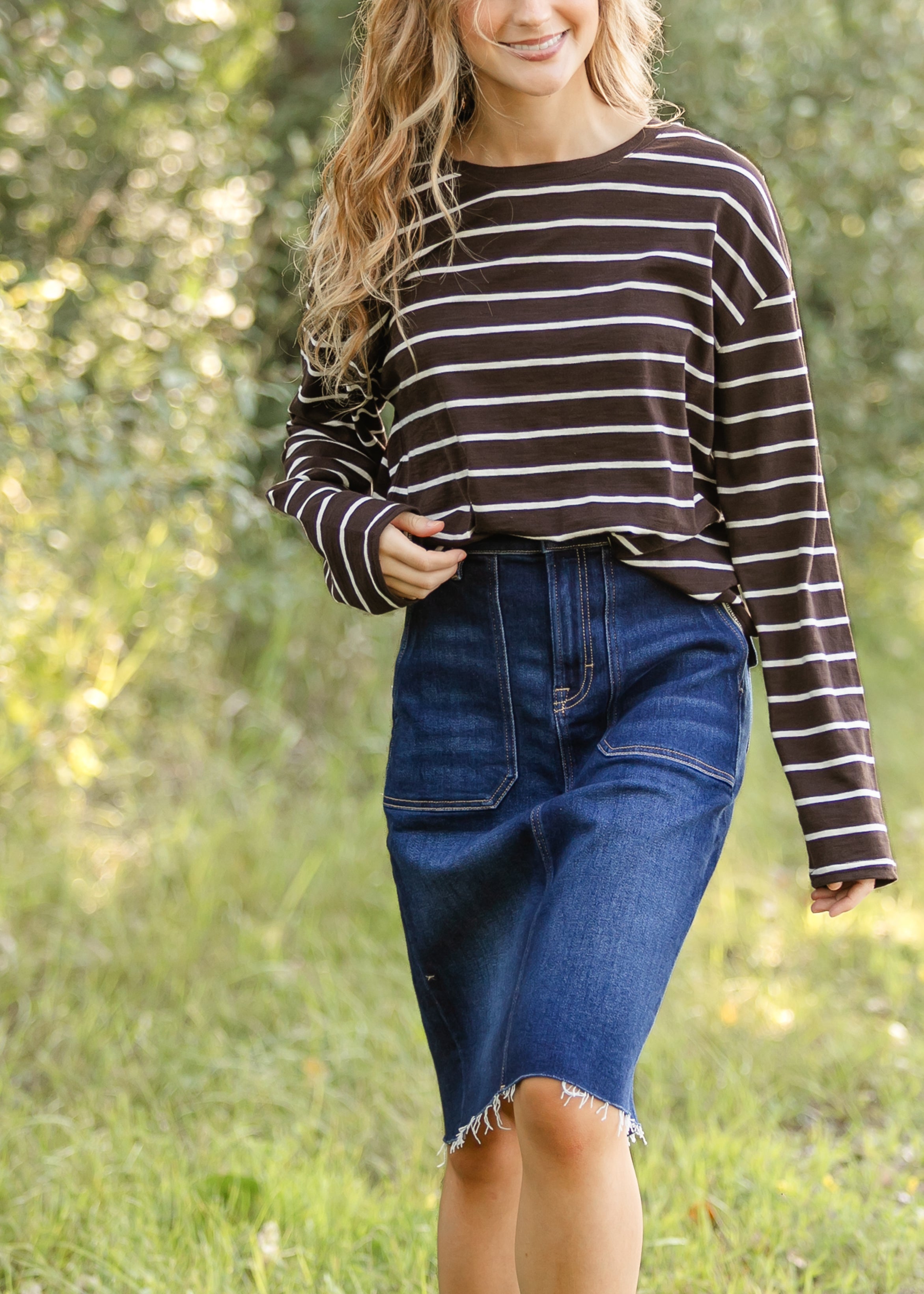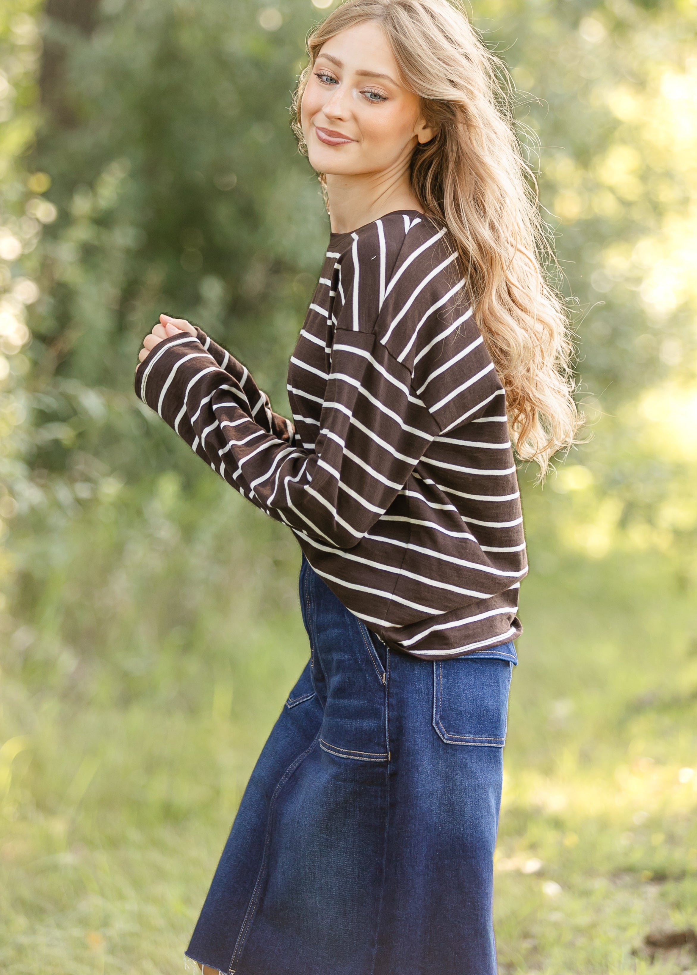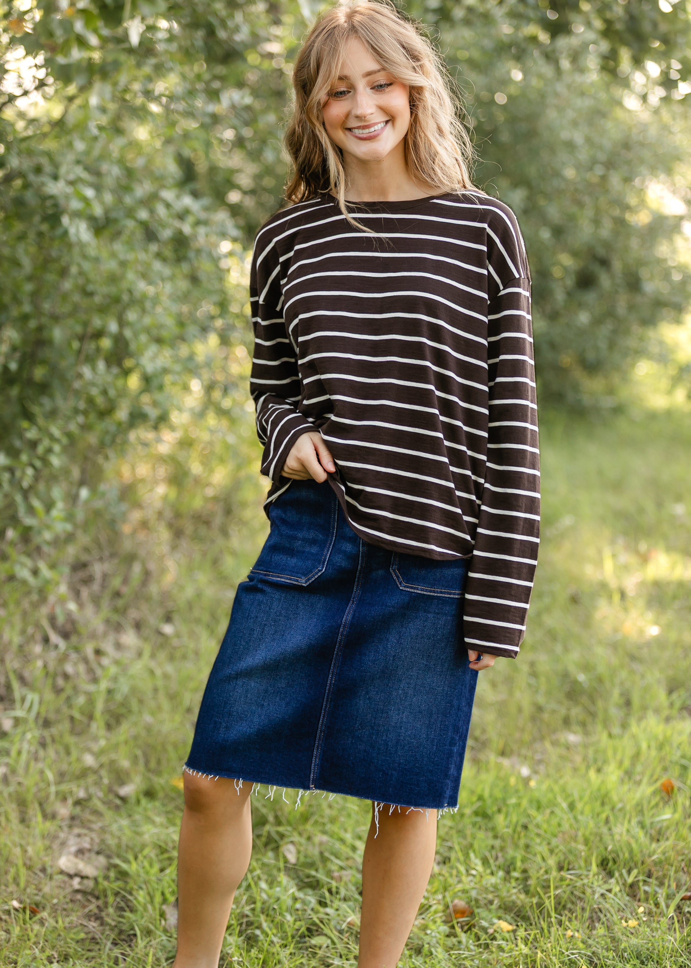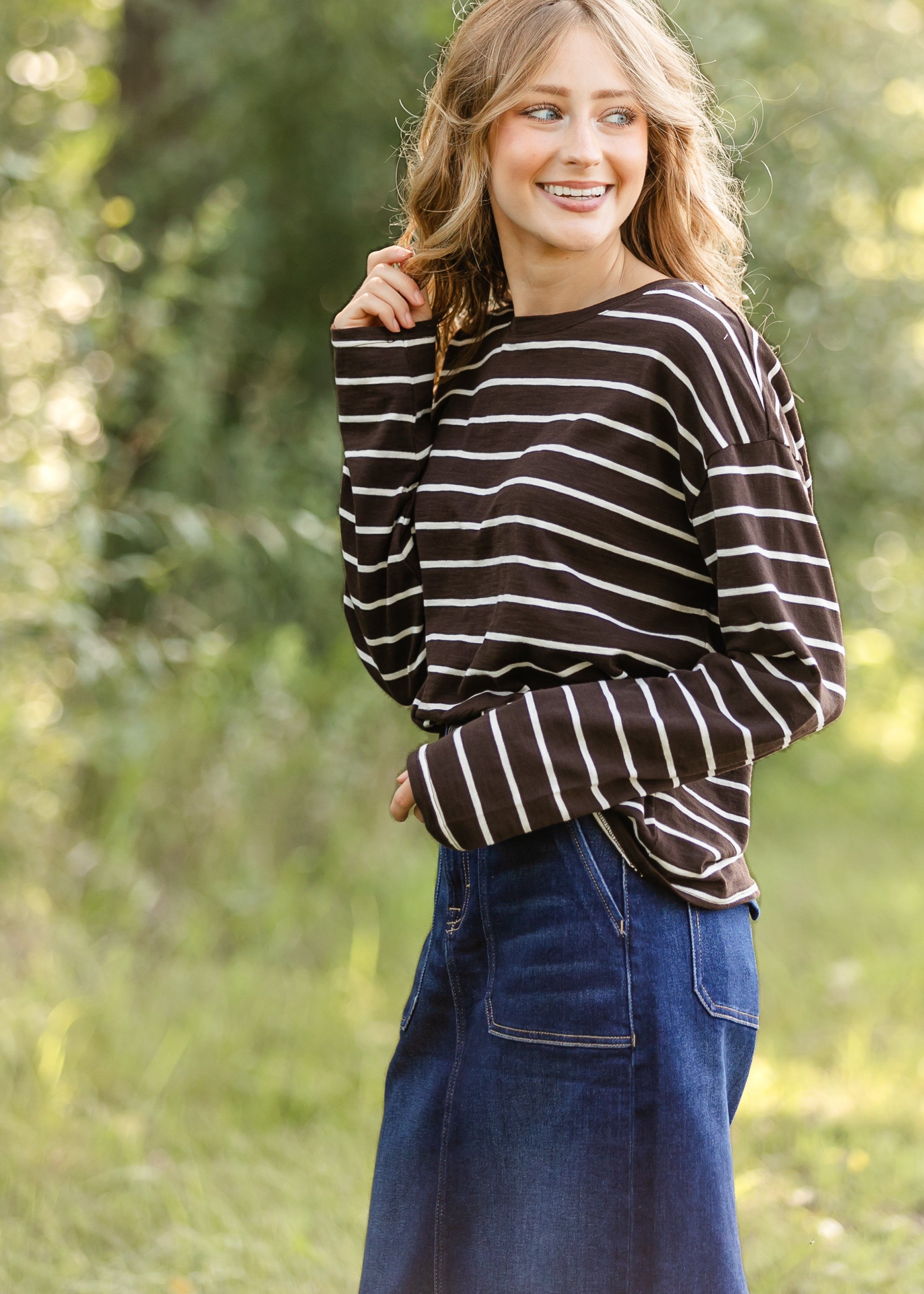 The Thread & Supply® Nellie Striped Top is a laid-back essential featuring soft fabric, a relaxed fit, and classic horizontal stripes. Its slightly oversized silhouette and long sleeves make it perfect for pairing with denim skirts or layering under jackets on cooler days. Comfortable and versatile, this top transitions seamlessly from weekday wear to weekend lounging with timeless ease!