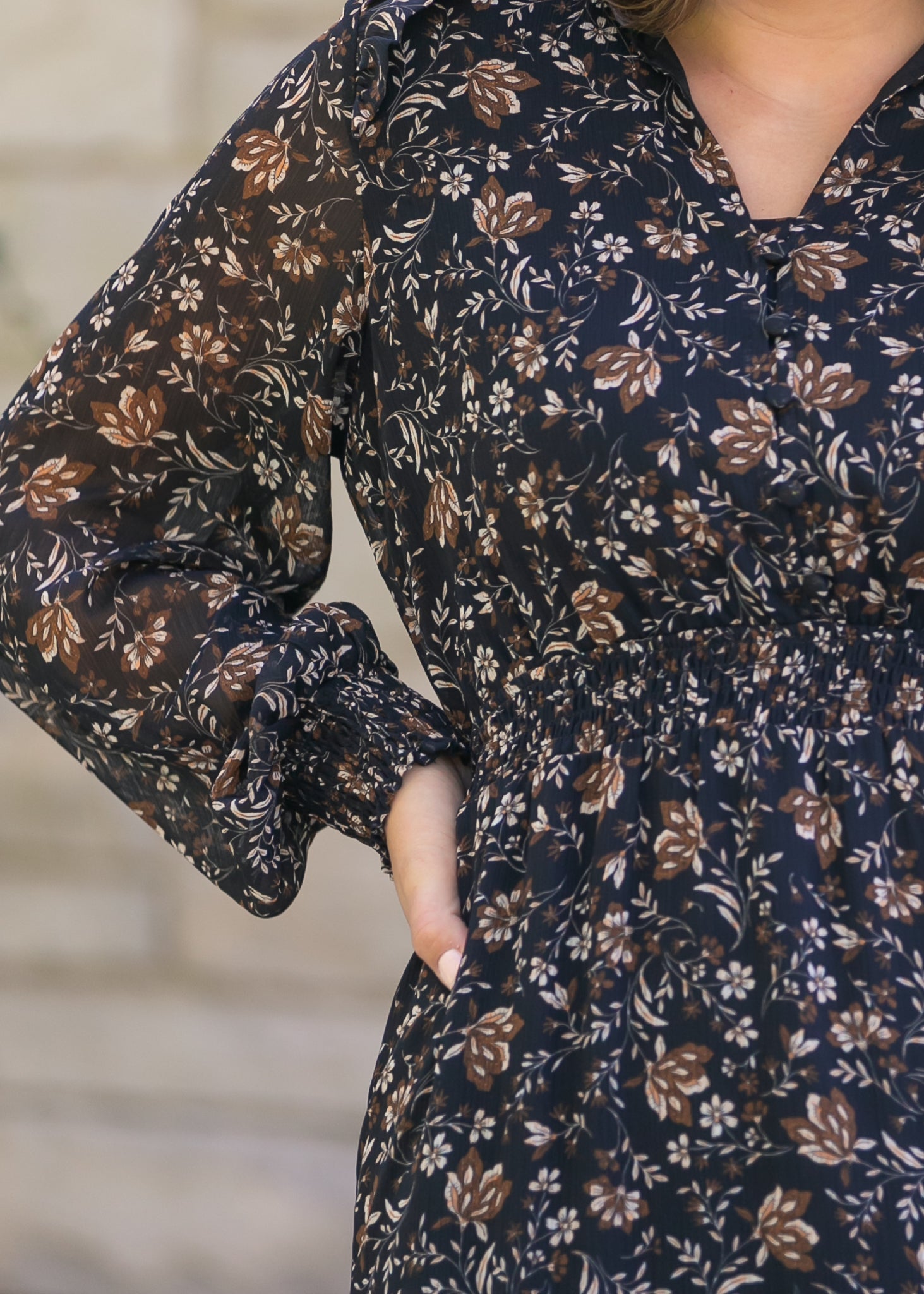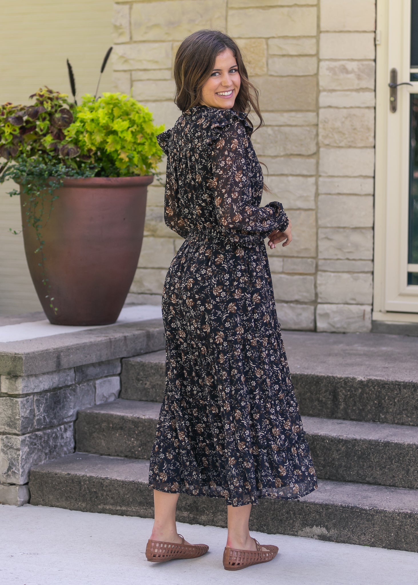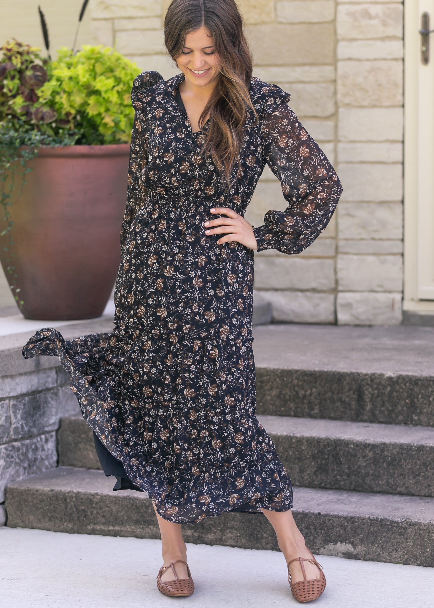 The Timeless Tiered Maxi Dress brings timeless elegance with its soft floral print and flowy silhouette. Featuring a flattering v-neckline, button detail, and smocked waist, it offers both comfort and shape. Sheer sleeves add a delicate touch, while the tiered skirt moves gracefully with each step, making it perfect for pairing with flats or layering under a cozy cardigan.