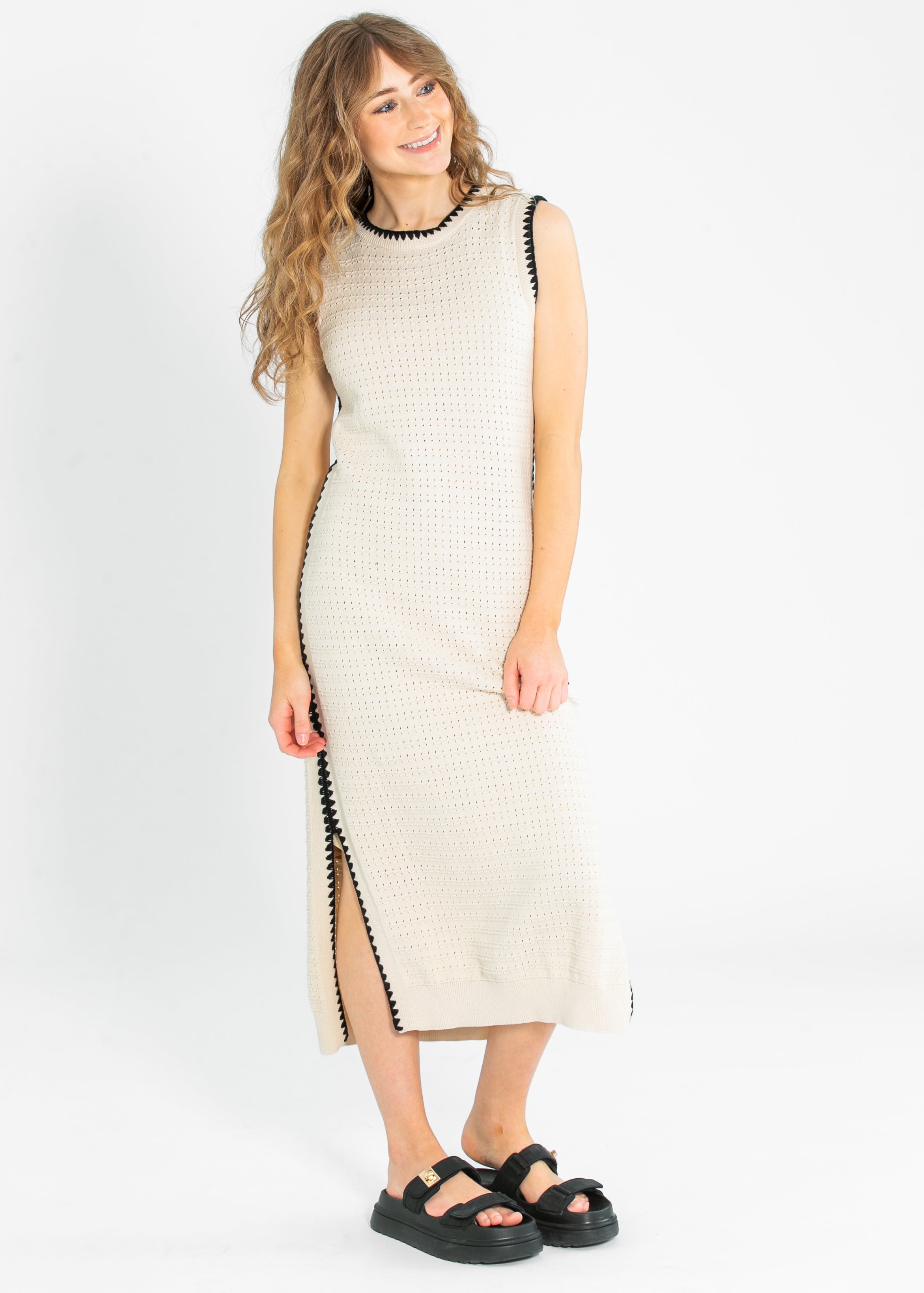The VARLEY Dwight Tank Knit Embroidered Dress blends timeless elegance with effortless ease. Crafted from a breathable pointelle knit with feminine contrast edging, this sleeveless midi dress flows with subtle side slits and a relaxed silhouette. Perfect for day-to-night wear, pair it with sandals or heels for a refined look that’s equal parts polished and comfortable!