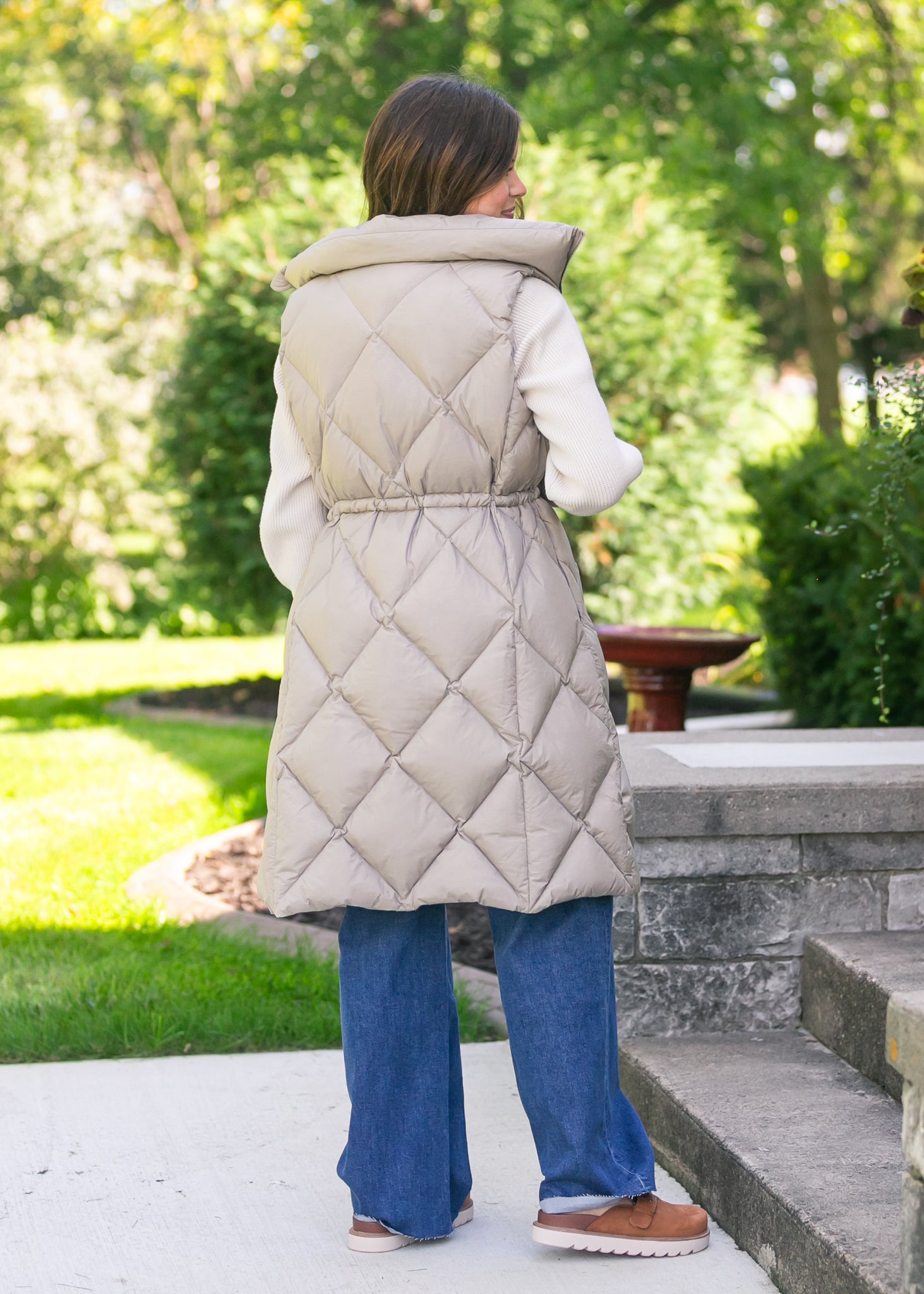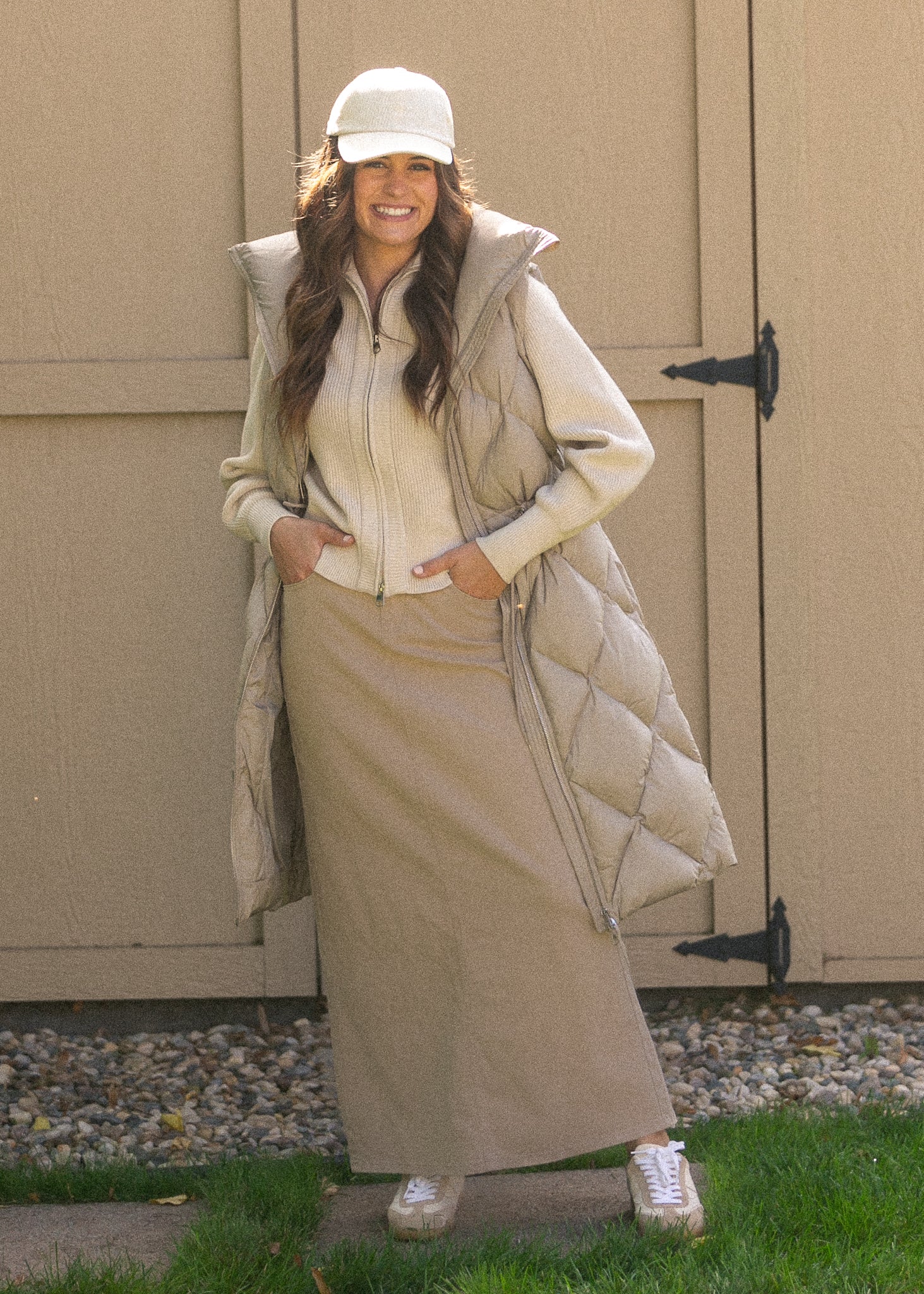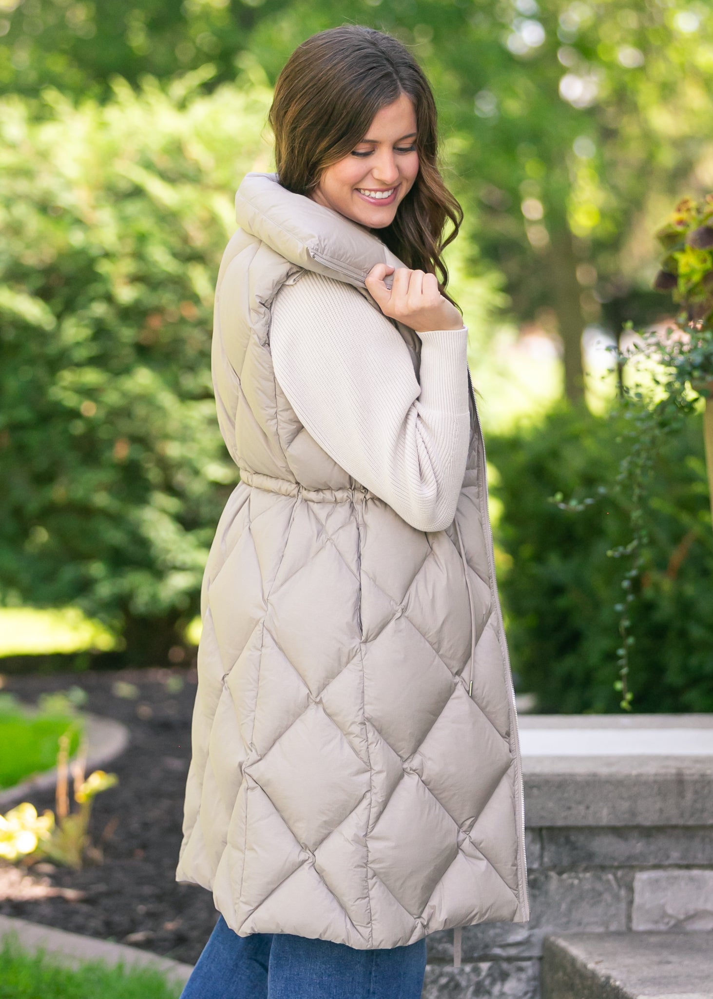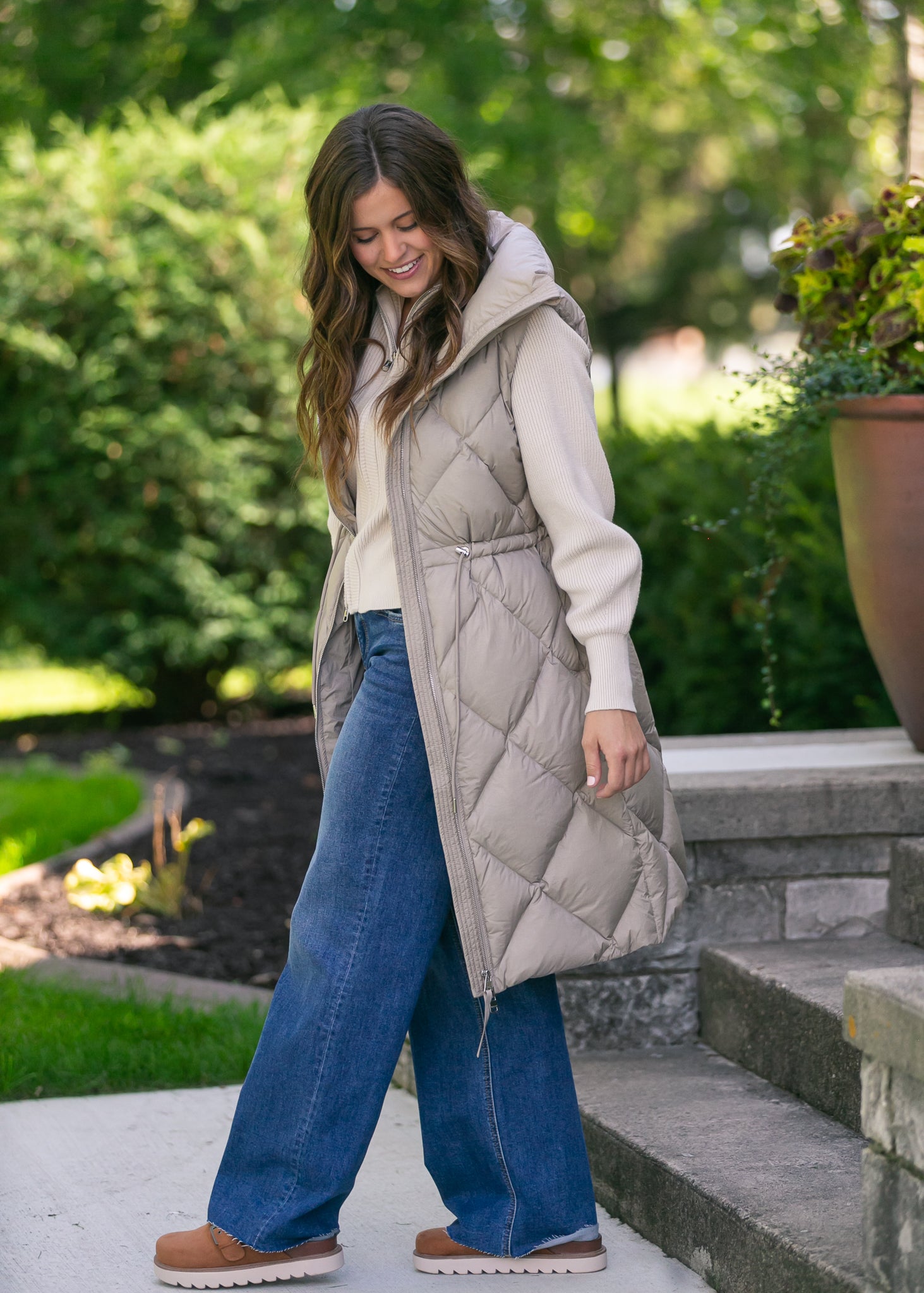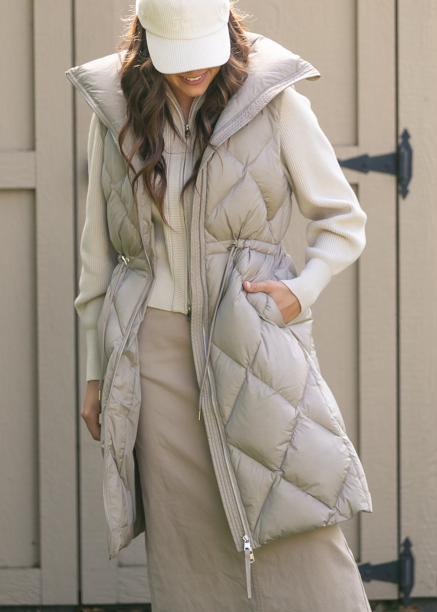 The Varley® Navine Long Down Gilet is crafted for cozy layering with an elegant, elongated silhouette. Featuring a quilted finish, adjustable waist, and high collar, it offers both warmth and refinement for cooler days. Perfect over a knit top with denim or styled with a flowy skirt, this versatile piece makes a modest yet elevated addition to your seasonal wardrobe.