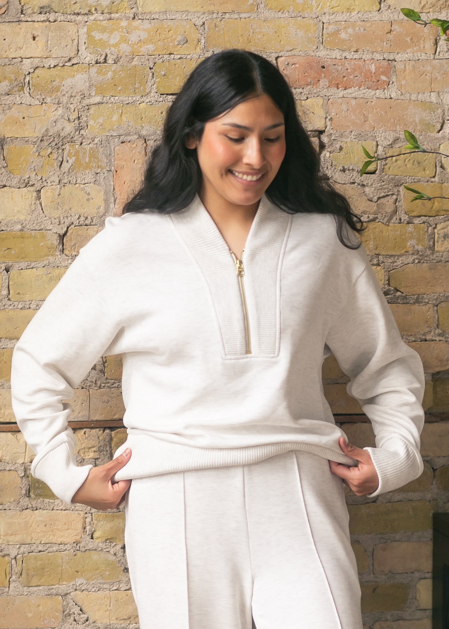 The Varley® Sally Half Zip Sweatshirt is a refined take on a casual classic, crafted from soft fabric with a relaxed fit. Featuring a half-zip neckline framed with wide rib detailing and gently gathered sleeves, it brings comfort with a polished edge. Pair it with Varley® The Wide Leg Pants for effortless everyday style.