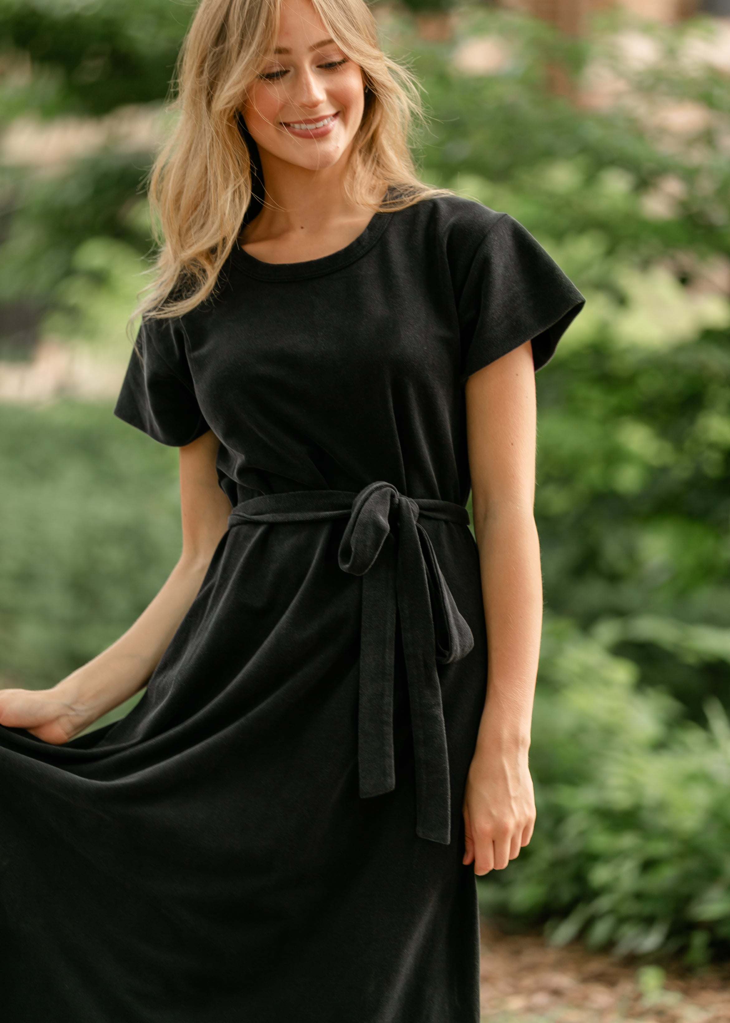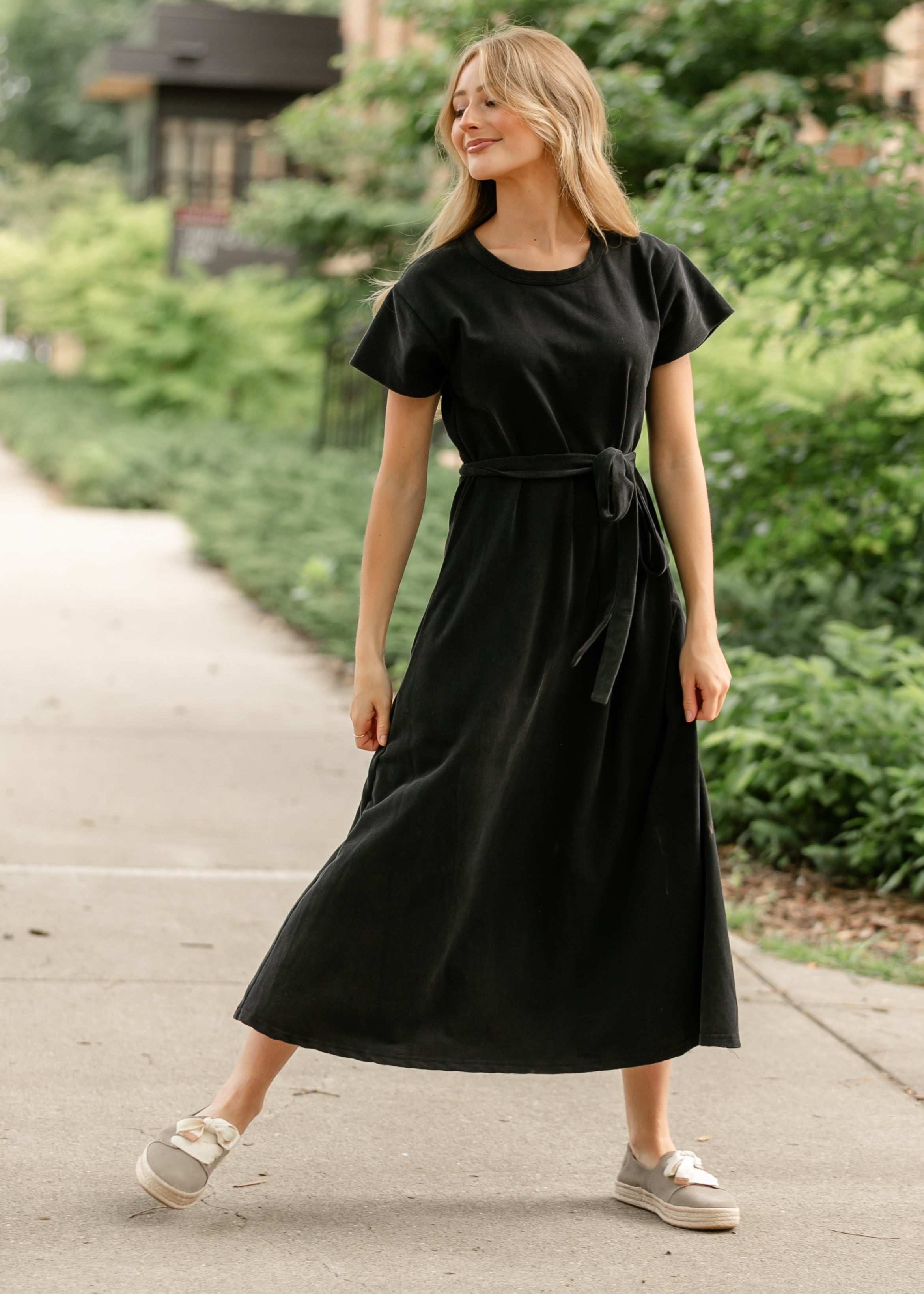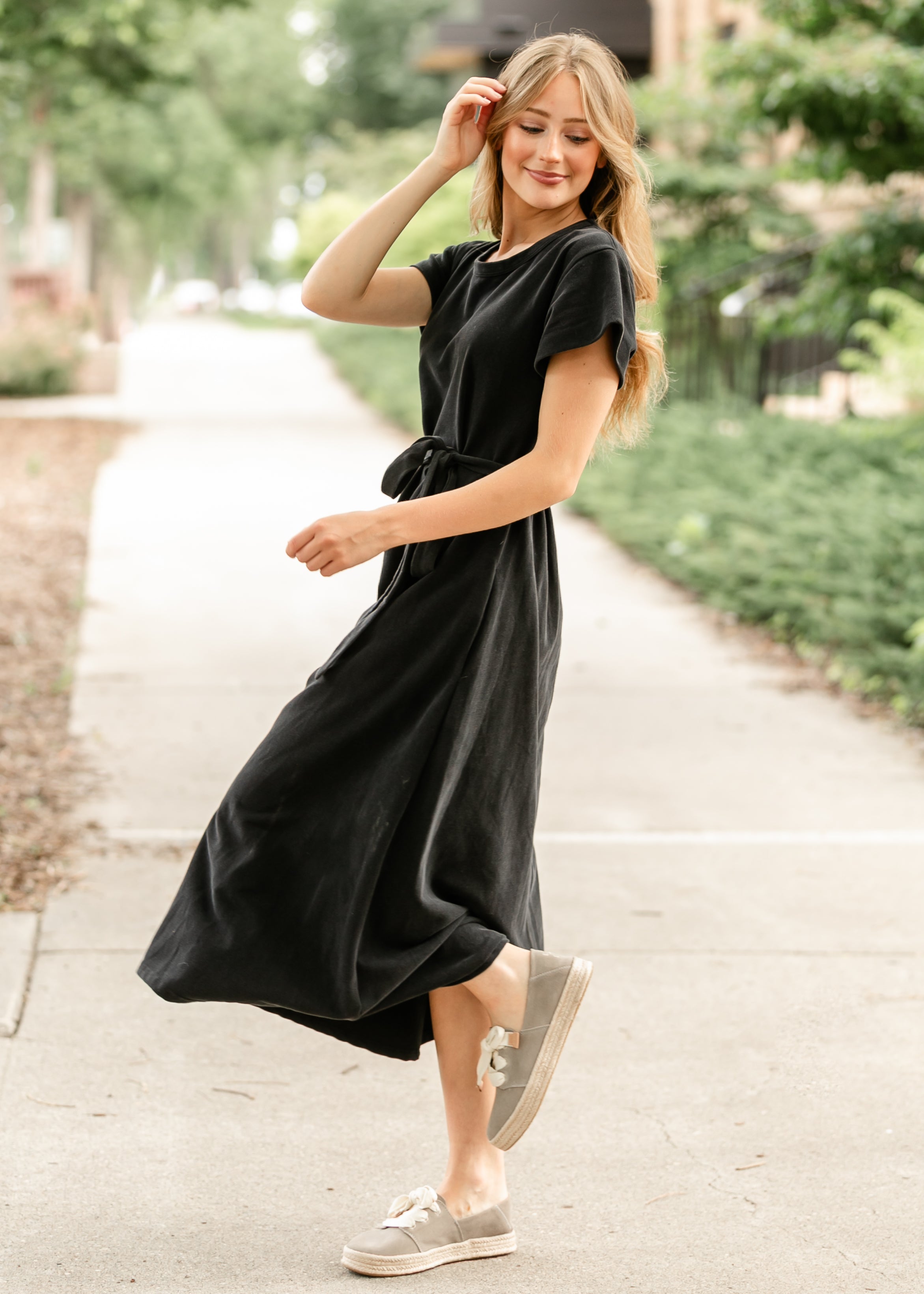 This Washed Knit Waist Tie Midi Dress blends softness with structure in the most effortless way. Made from a lived-in knit with an easy drape, it features cuffed sleeves, a modest neckline, and a self-tie waist to flatter your shape. Finished with hidden pockets, this everyday favorite offers comfort, movement, and just the right amount of polish.
