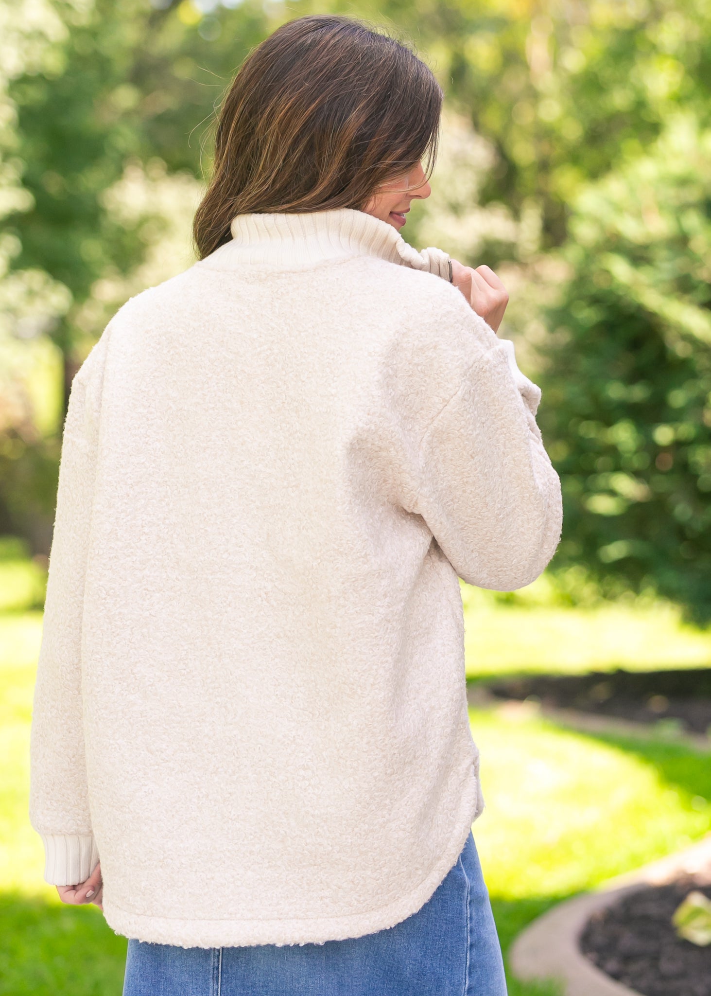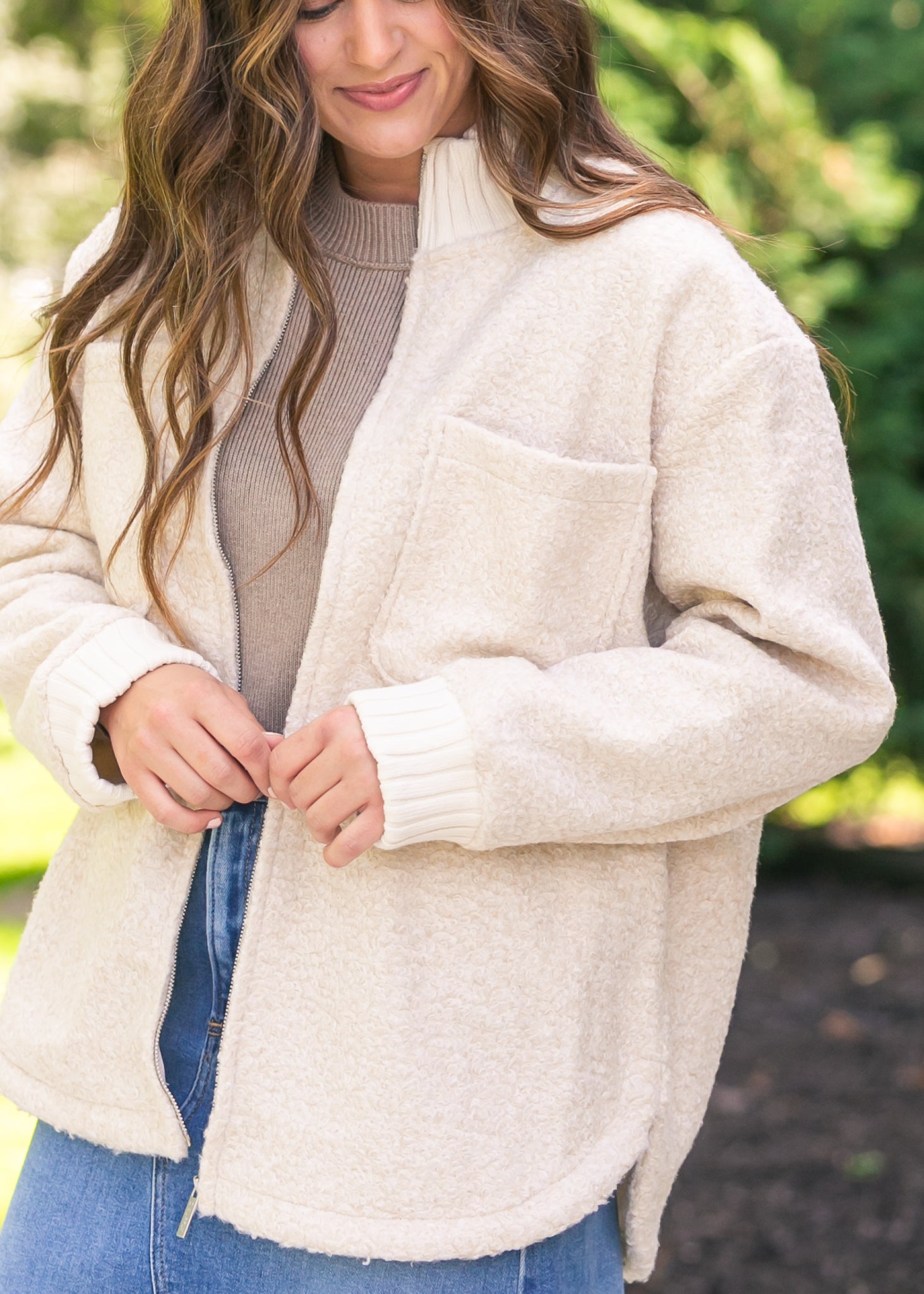 - Product Details | Sherpa-Inspired Fabric, Front Patch Pockets, Zipper Closure, Ribbed Hem