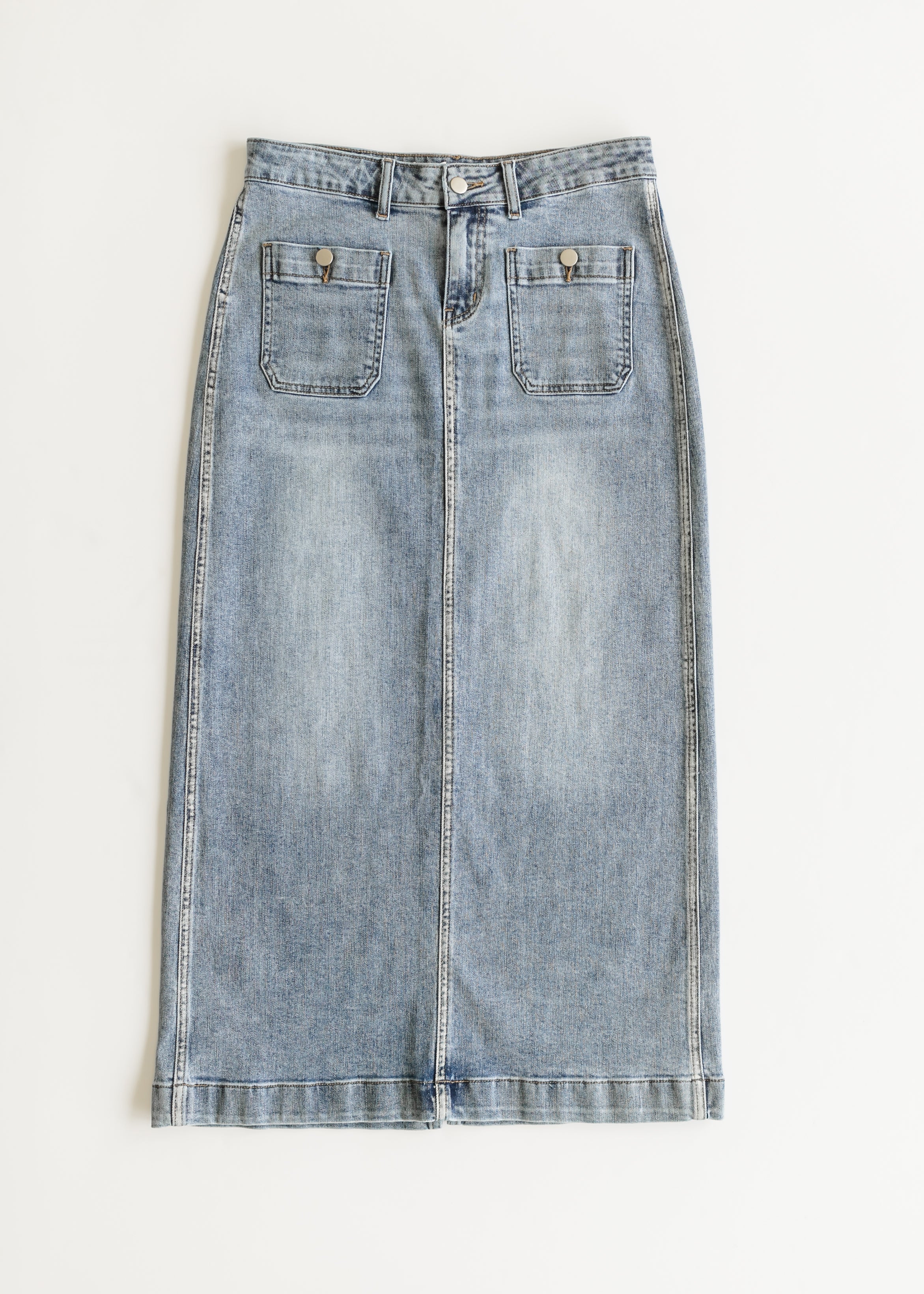 The Elin Front Pocket Midi Skirt is a light wash midi skirt with a classic look. It is versatile, comfortable, and the essence of elevated. With comfortable stretch and modest length, it truly is the “wear it anywhere” skirt.