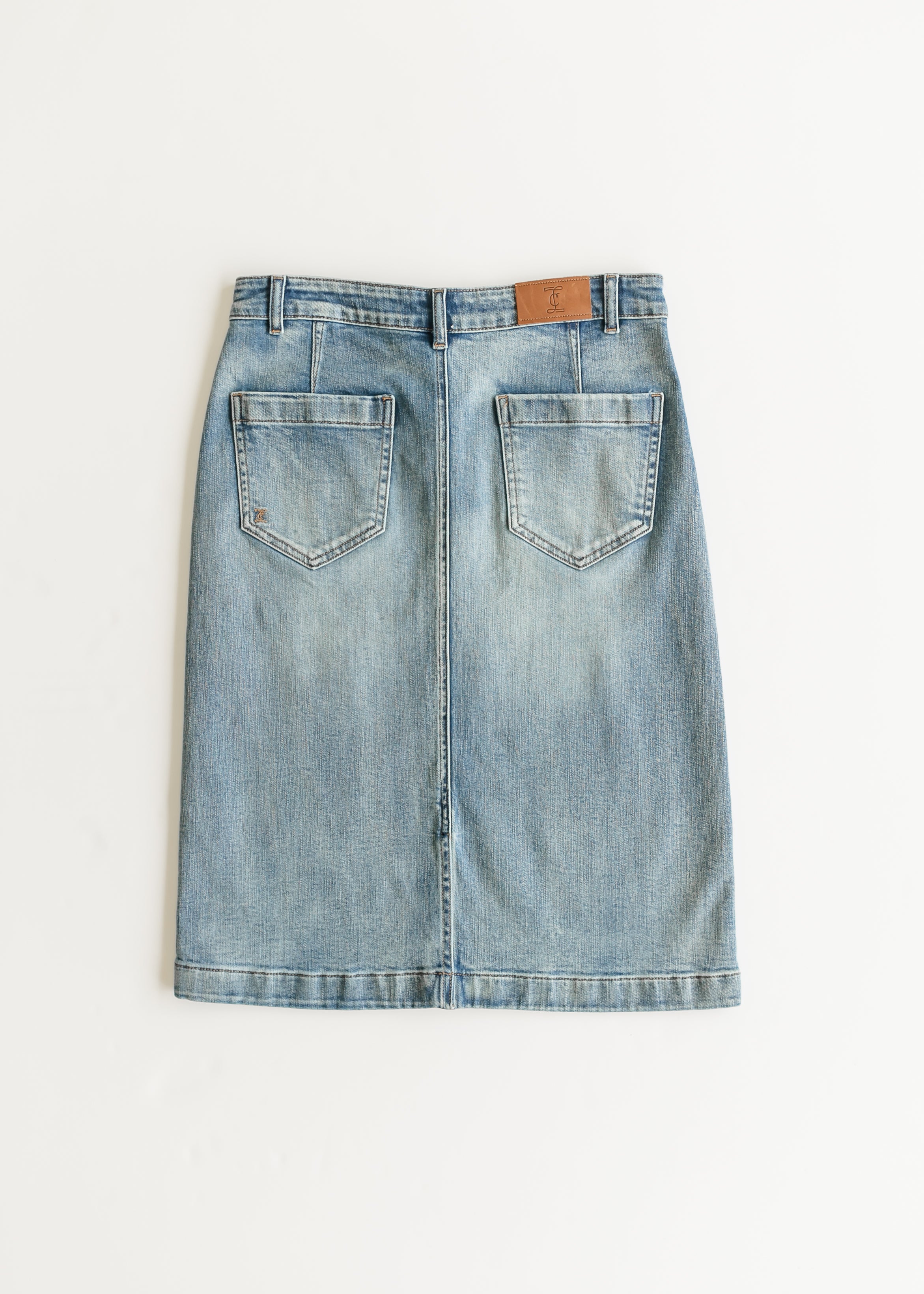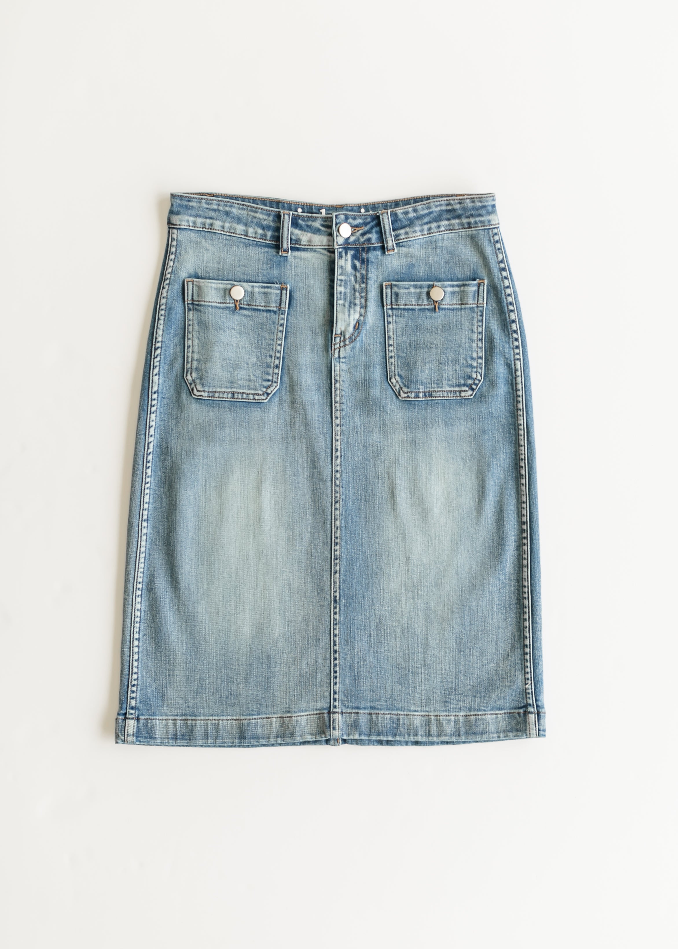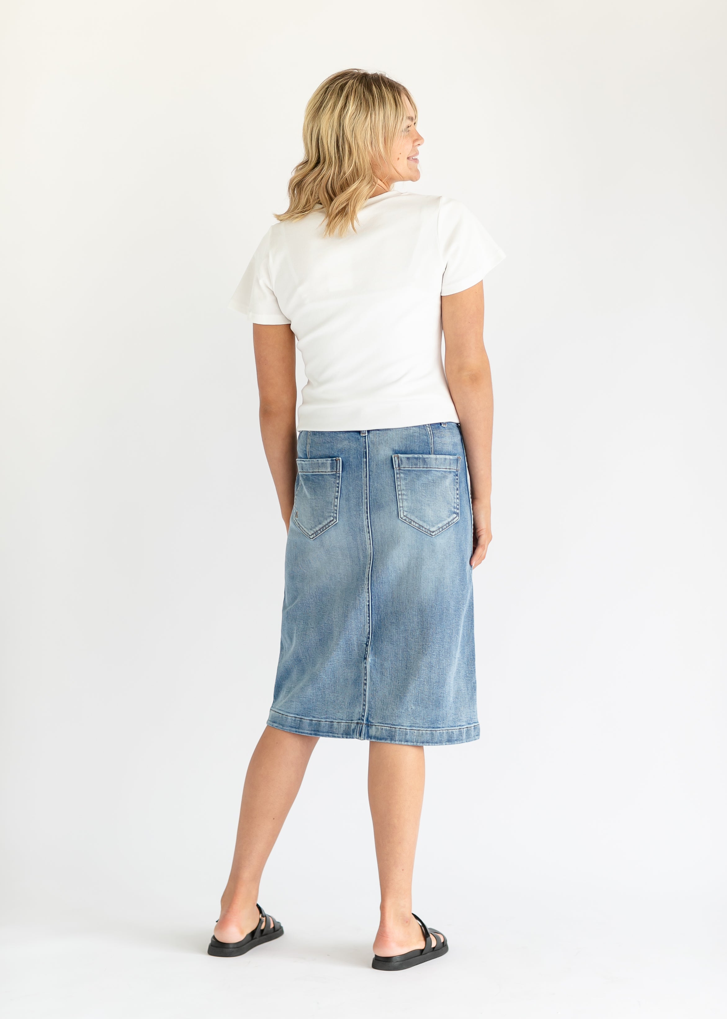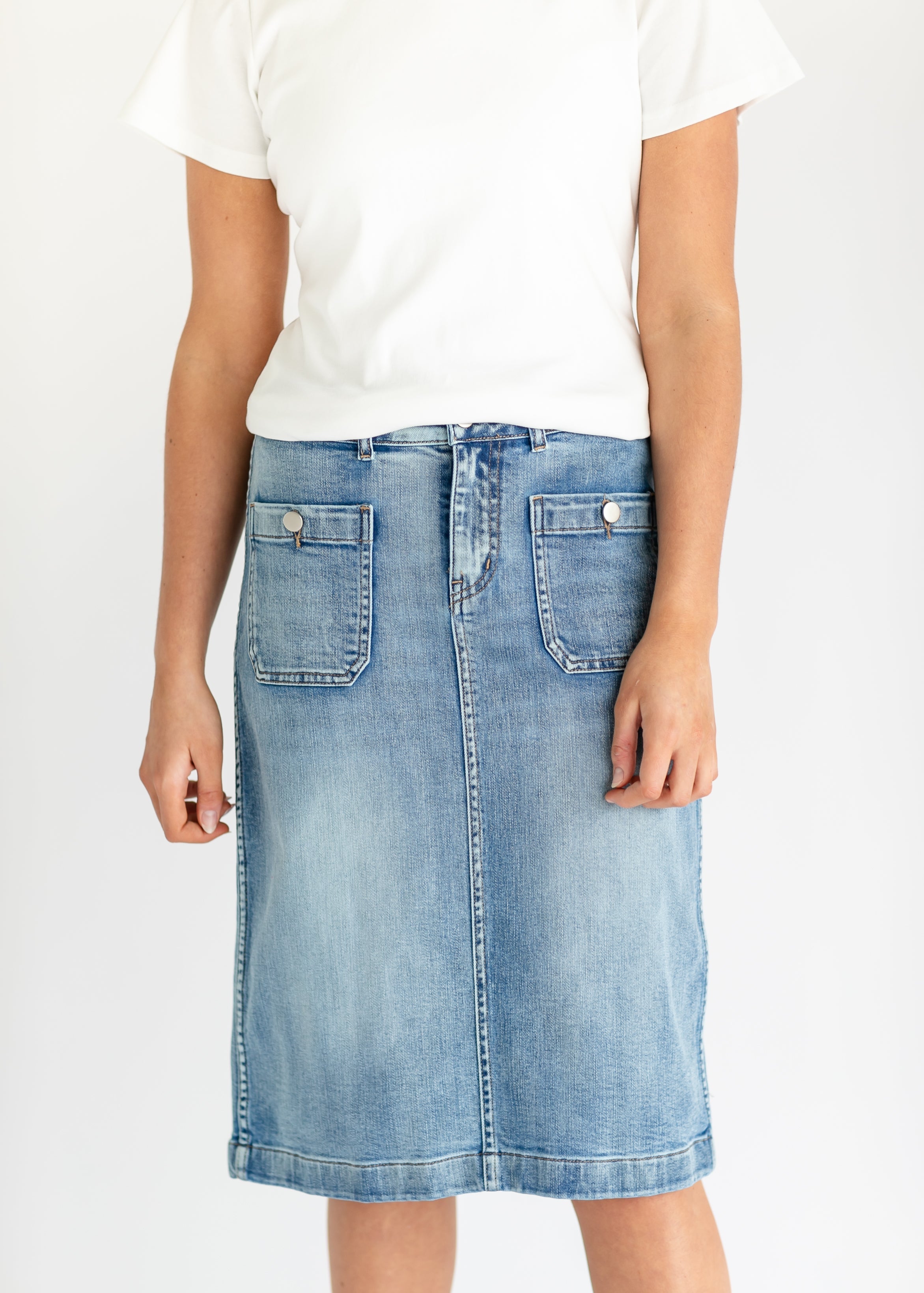 The Elin Front Pocket Midi Skirt is a light wash midi skirt with a classic look. It is versatile, comfortable, and the essence of elevated. With comfortable stretch and modest length, it truly is the “wear it anywhere” skirt.