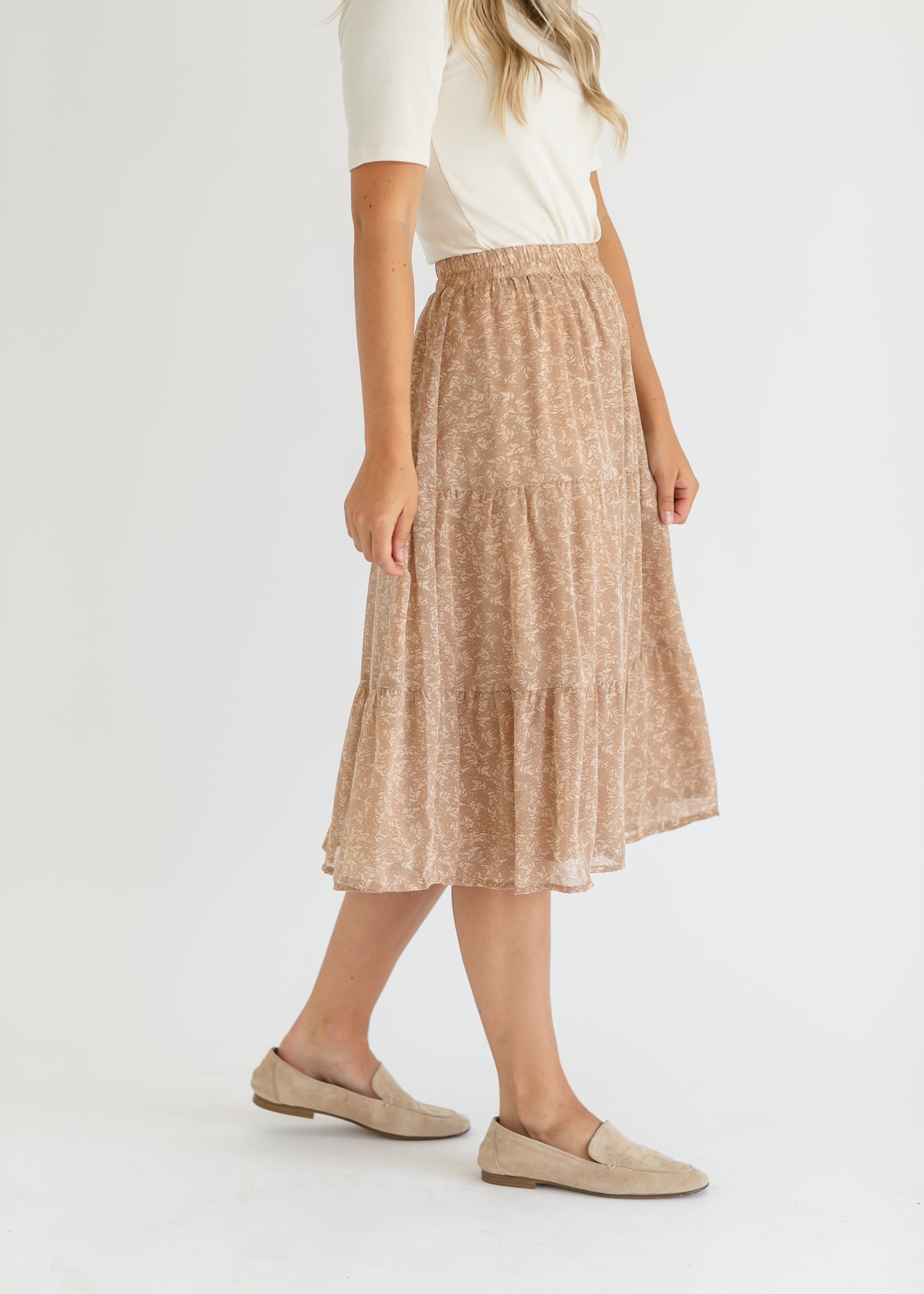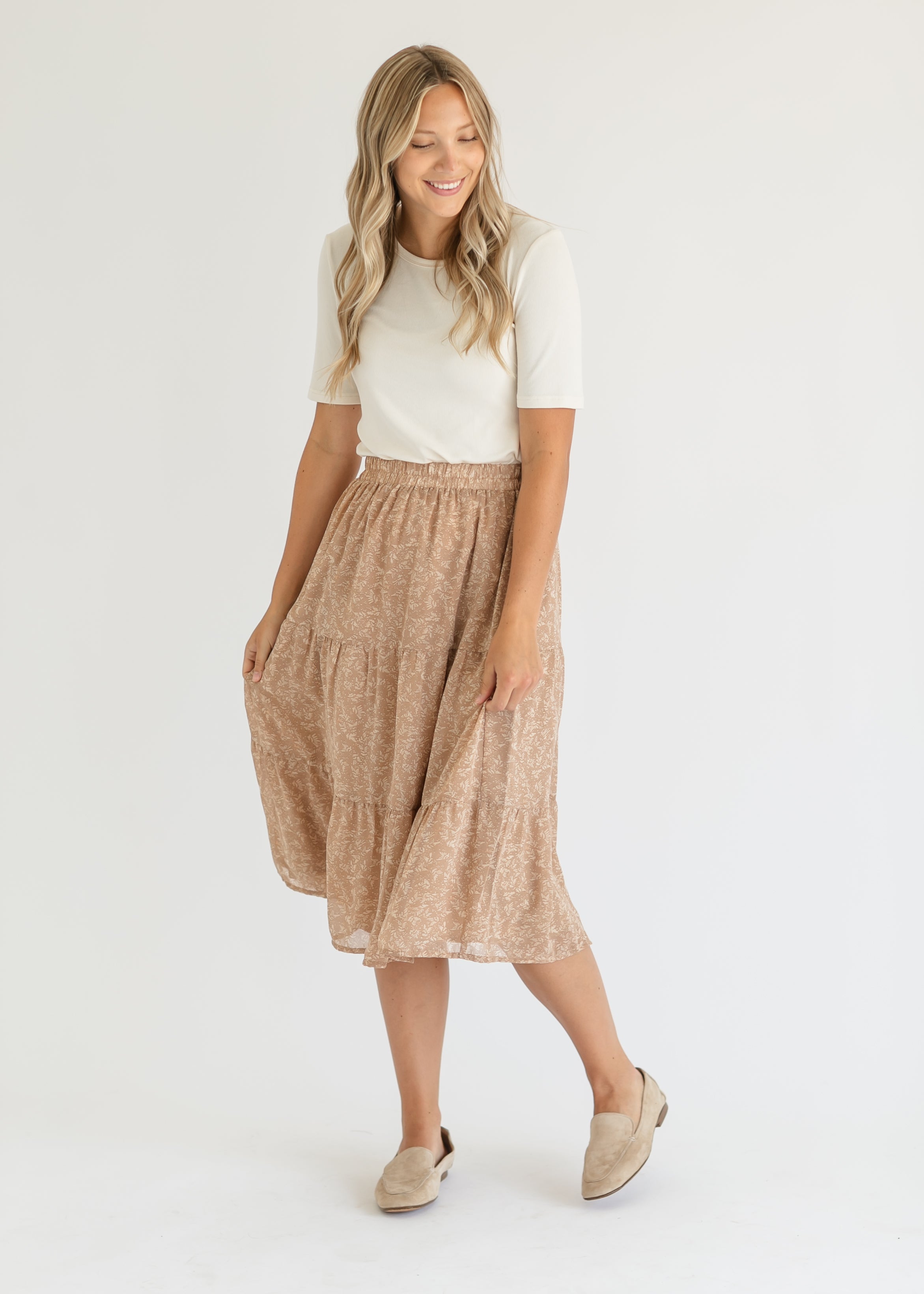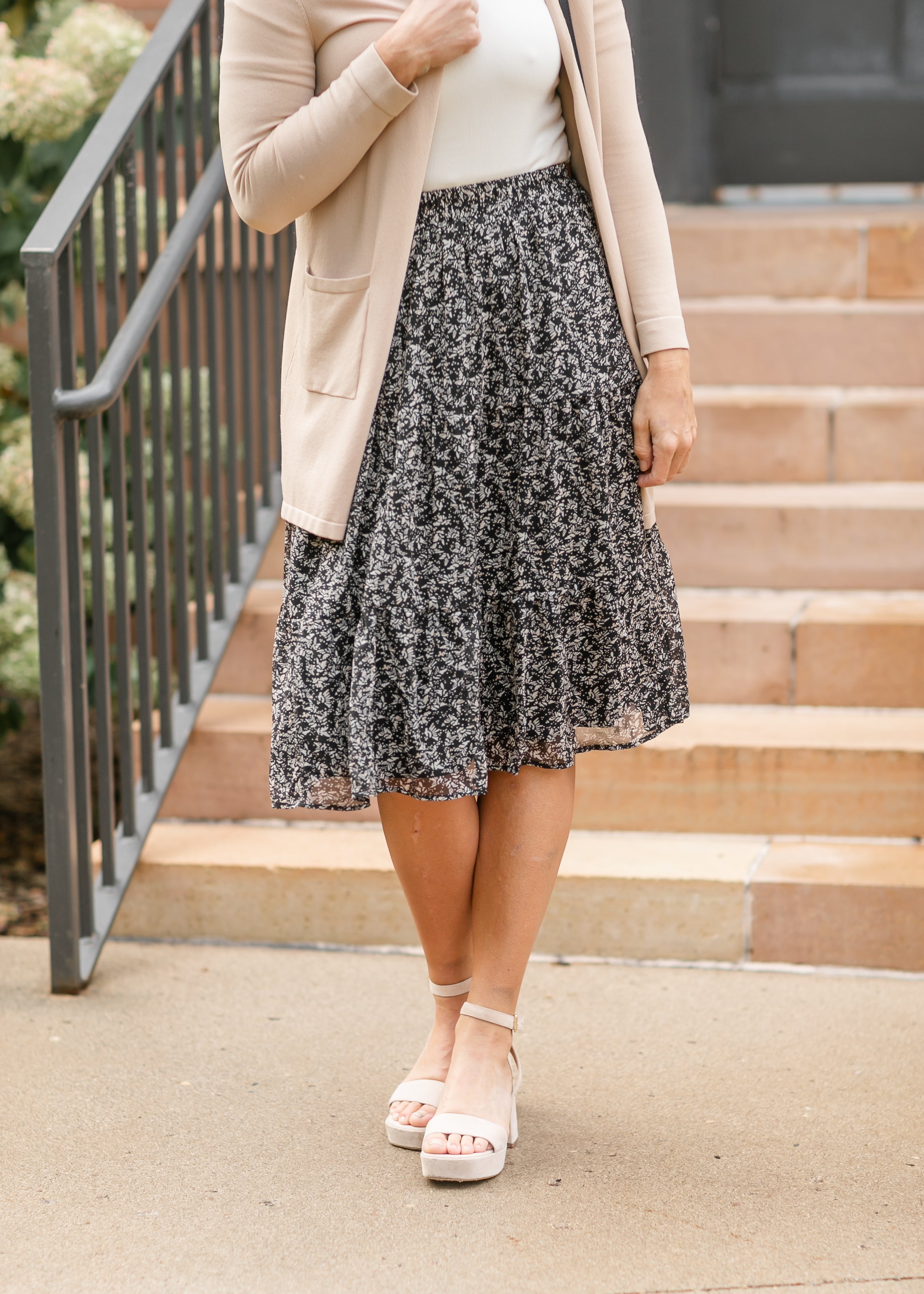 There is just something so fun about floral! The Harlow Abstract Floral Tiered Midi Skirt is perfect for pairing with sneakers, sandals, or boots! This modest midi skirt was designed to make movement comfortable and effortless all while looking put together and feeling fabulous! This floral skirt has enough room for biking and enough elegance for church. This skirt has fresh fall colors that look perfect paired with a denim jacket or graphic tee and is a look every girl needs in her closet!