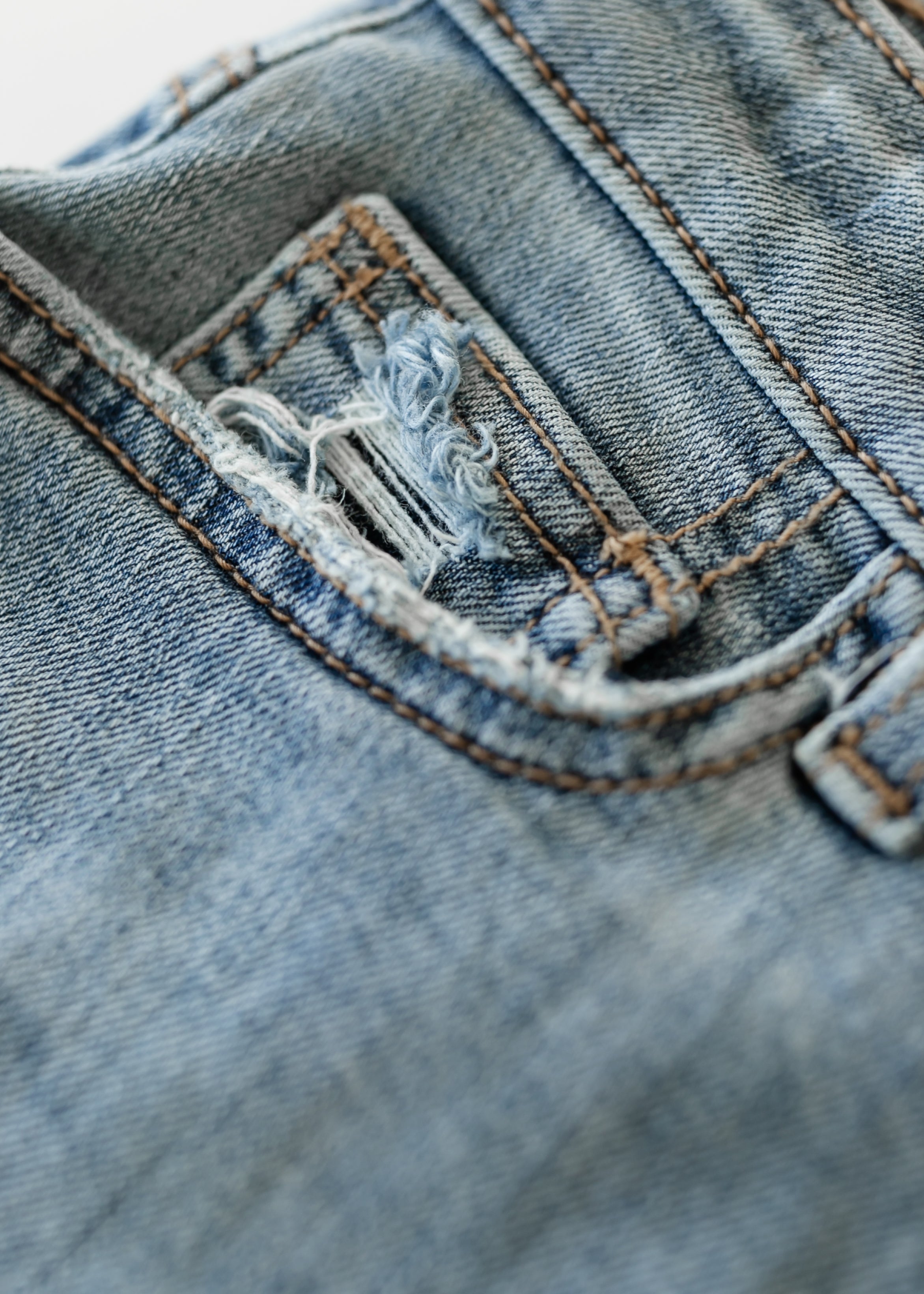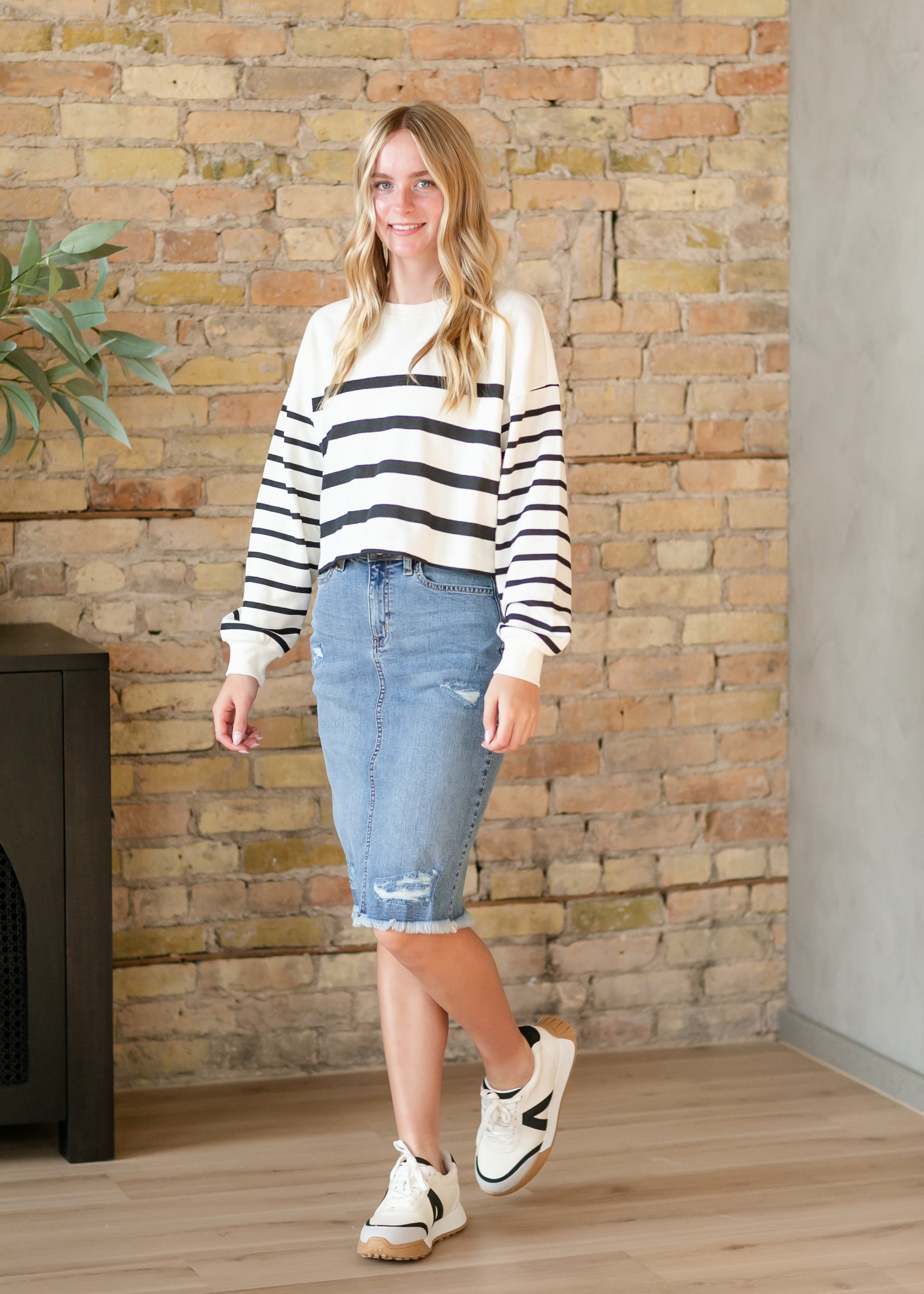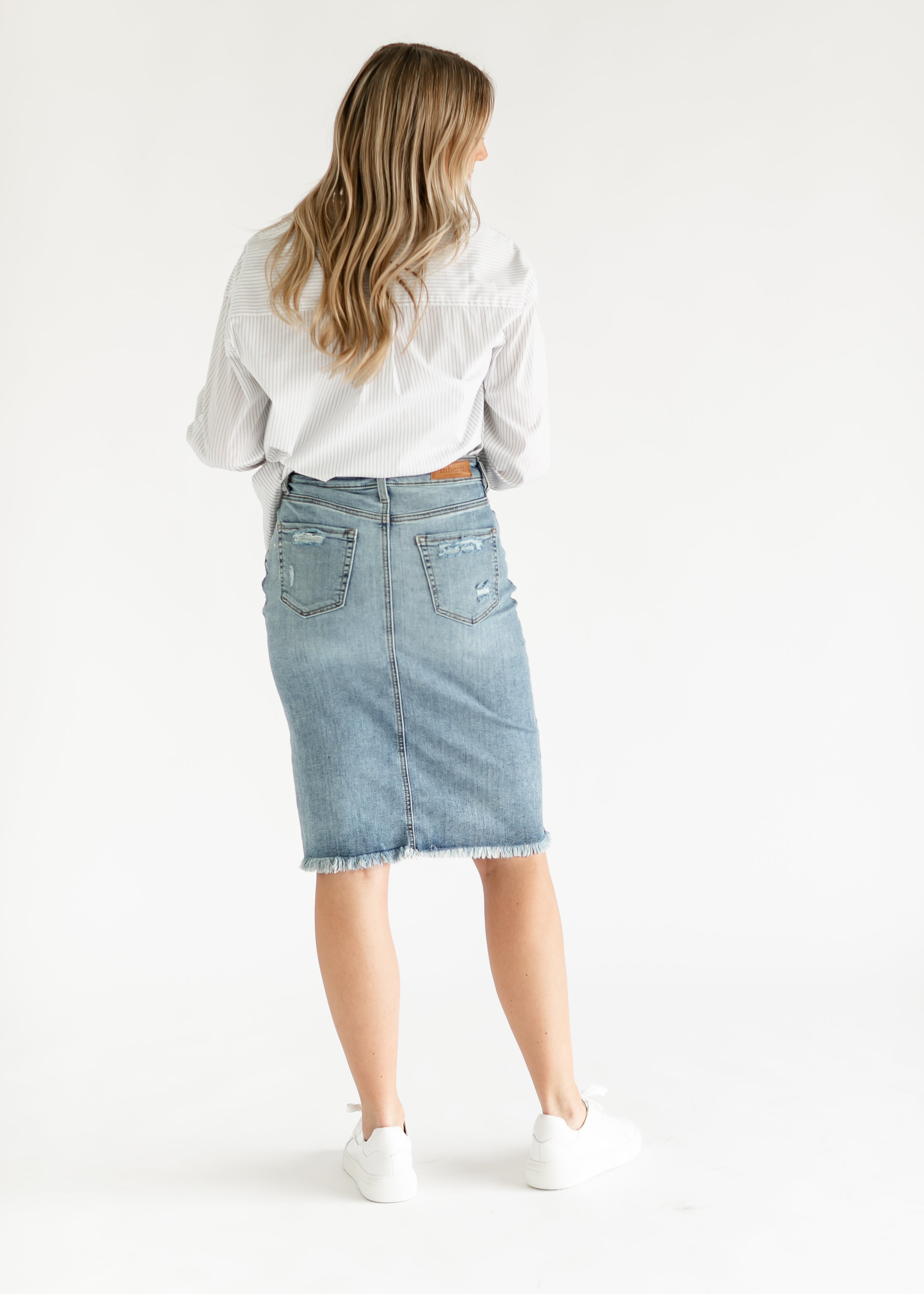 The Presley Distressed Denim Midi Skirt is a 25" denim midi skirt comes in a medium wash. It features distressing with black fabric backing. Designed with a modest straight fit, and functioning front and back pockets for holding all the things! What makes this skirt sustainable? Well, it is threaded with purpose with natural garment dying which reduces water usage and energy consumption. Pair the Presley with your favorite top and sneakers every day for years to come!