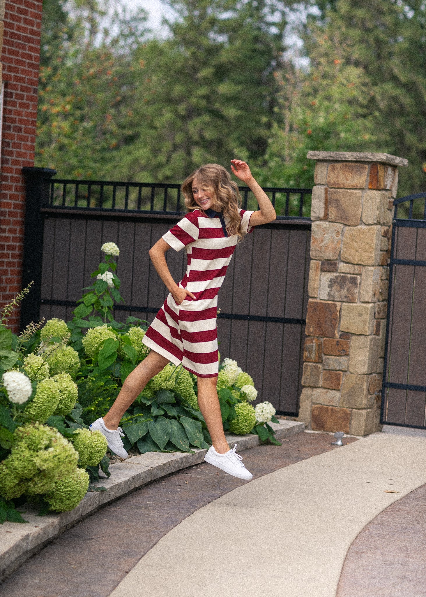 The Big Stripe Collar Midi Dress blends sporty ease with a polished, modest silhouette. Featuring bold red and cream stripes, this short-sleeve style is finished with a classic navy collar and button placket. Its straight, midi-length cut offers comfortable coverage, making it an effortless choice for casual days while keeping your look timeless and put-together.
