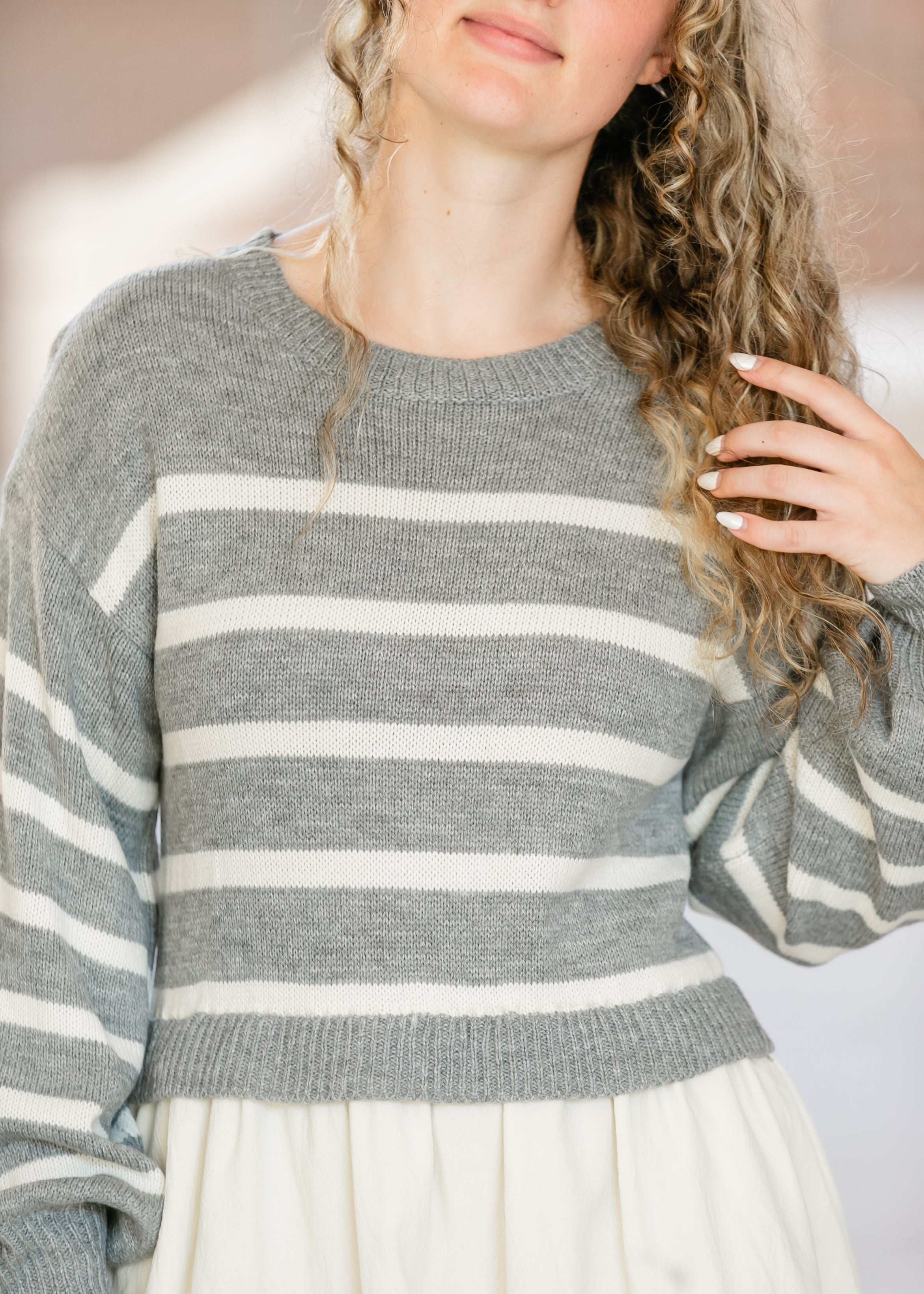 The Cameron Sweater Top Dress brings together cozy textures and feminine ease, with a soft striped knit bodice flowing into a lightly gathered skirt. Perfect for layering through cool mornings or wearing simply on its own, this modest silhouette feels effortless for everyday errands, coffee shop afternoons, or evening walks. A timeless blend of comfort and grace to carry through the seasons.