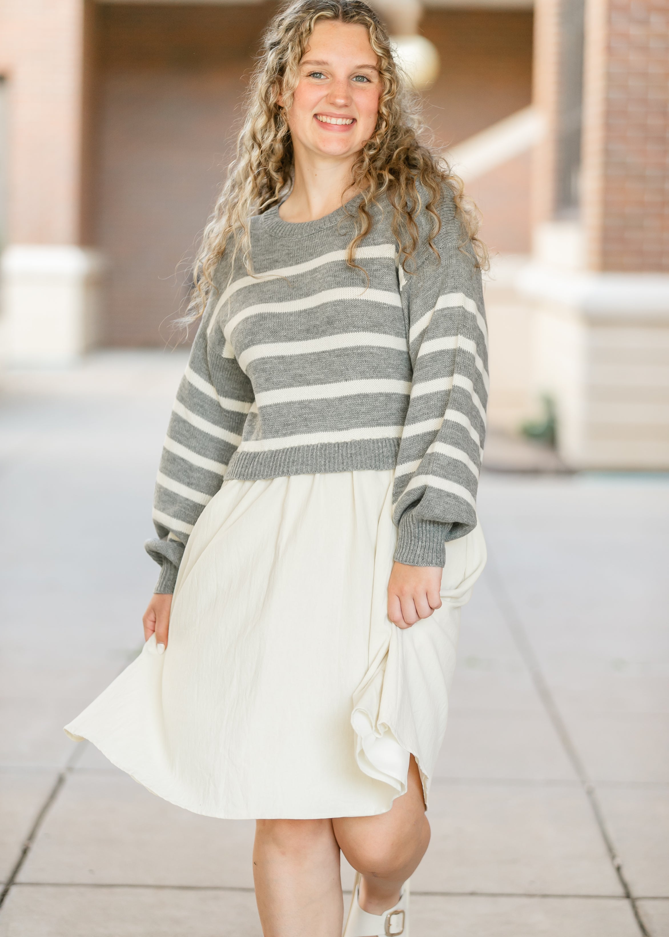 - Product Details | Sweater Bodice, Striped, knit, Lined, Drop Shoulder Sleeves, Gathered Skirt