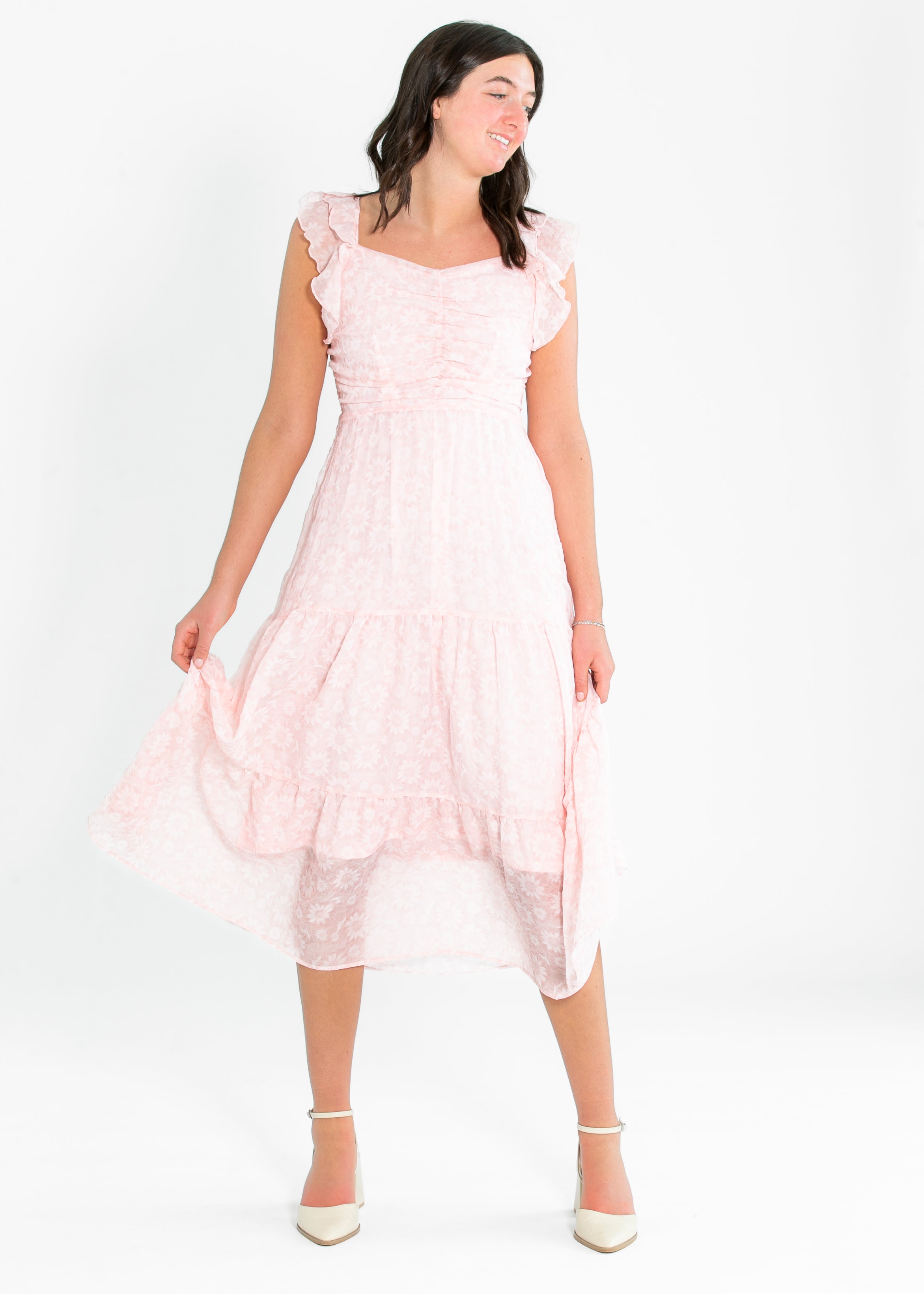 The Carrie Ruffle Sleeve Floral Maxi Dress is the perfect blend of elegance and femininity. This tea-length dress features a tiered skirt, a gathered bodice with a soft sweetheart neckline, and delicate flutter sleeves. Its allover floral texture adds a romantic charm, making it ideal for special occasions or everyday wear. Light, breathable, and effortlessly graceful!