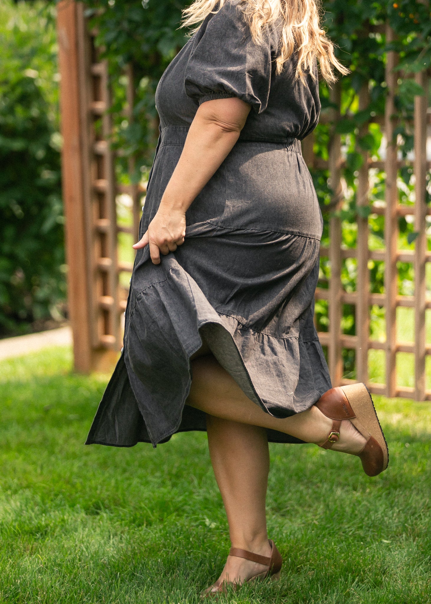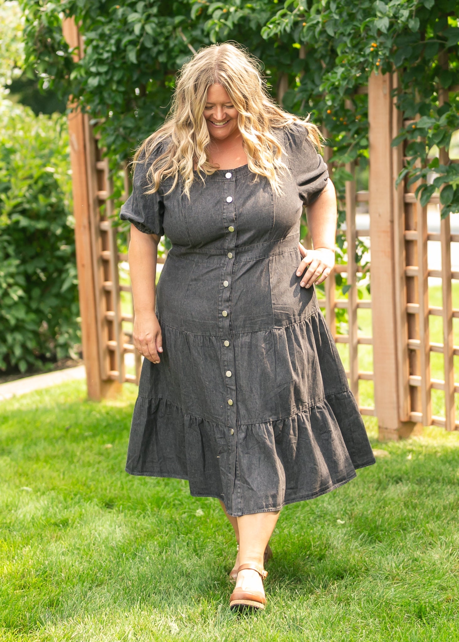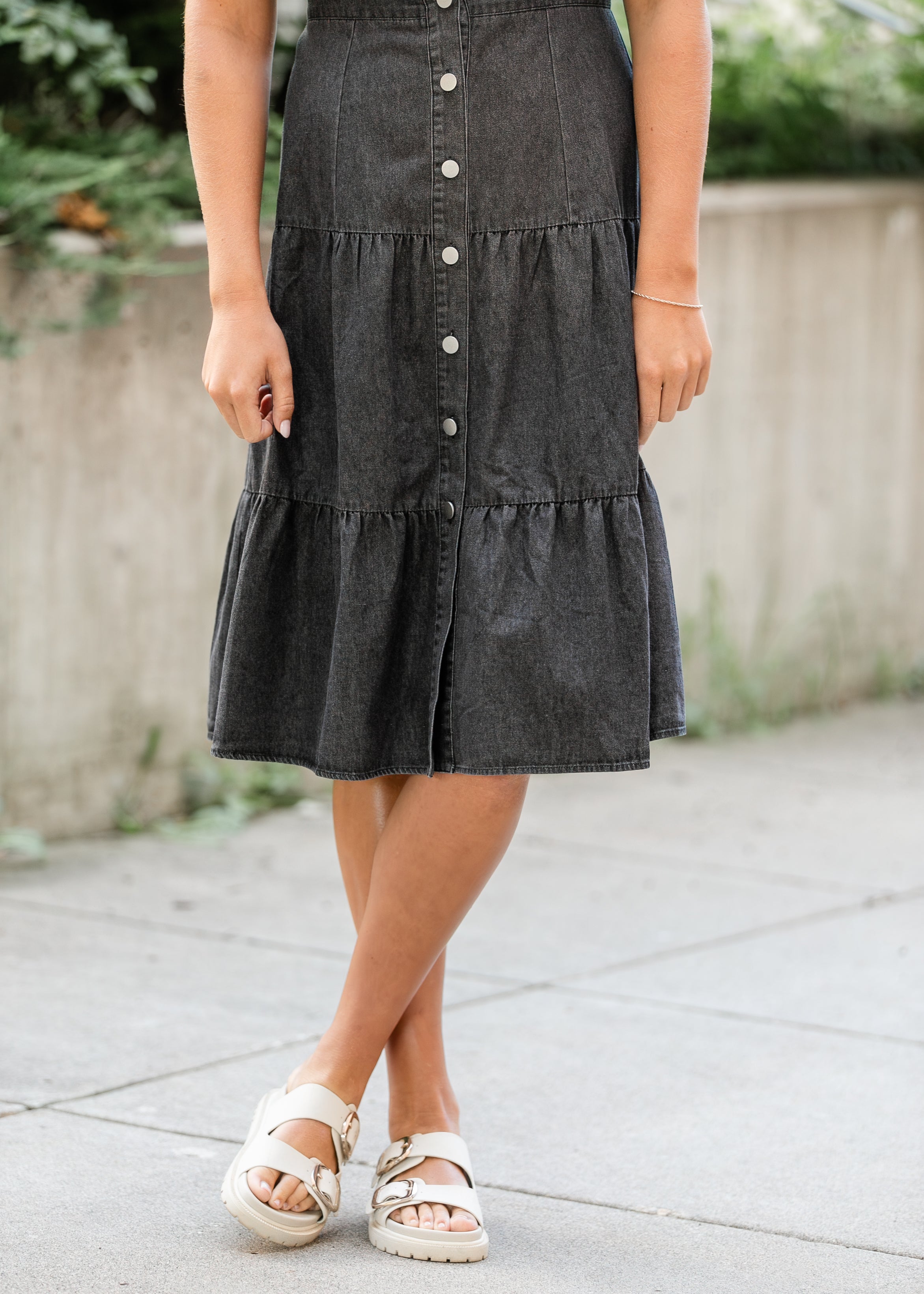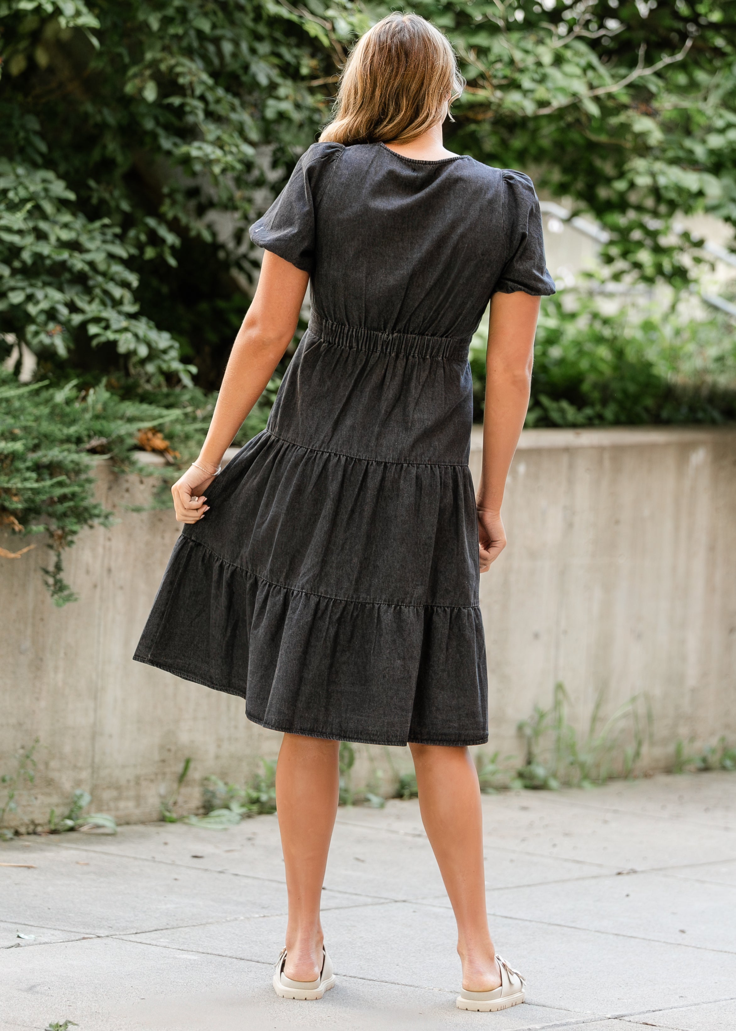 The Elton Square Neck Dress blends structure with softness, featuring a flattering square neckline, button-front detail, and subtle puff sleeves. Crafted in washed black denim with a tiered skirt, it’s a piece that balances everyday ease with timeless style. Perfect for pairing with sandals on warm afternoons or layering with a cardigan and boots as the season cools.