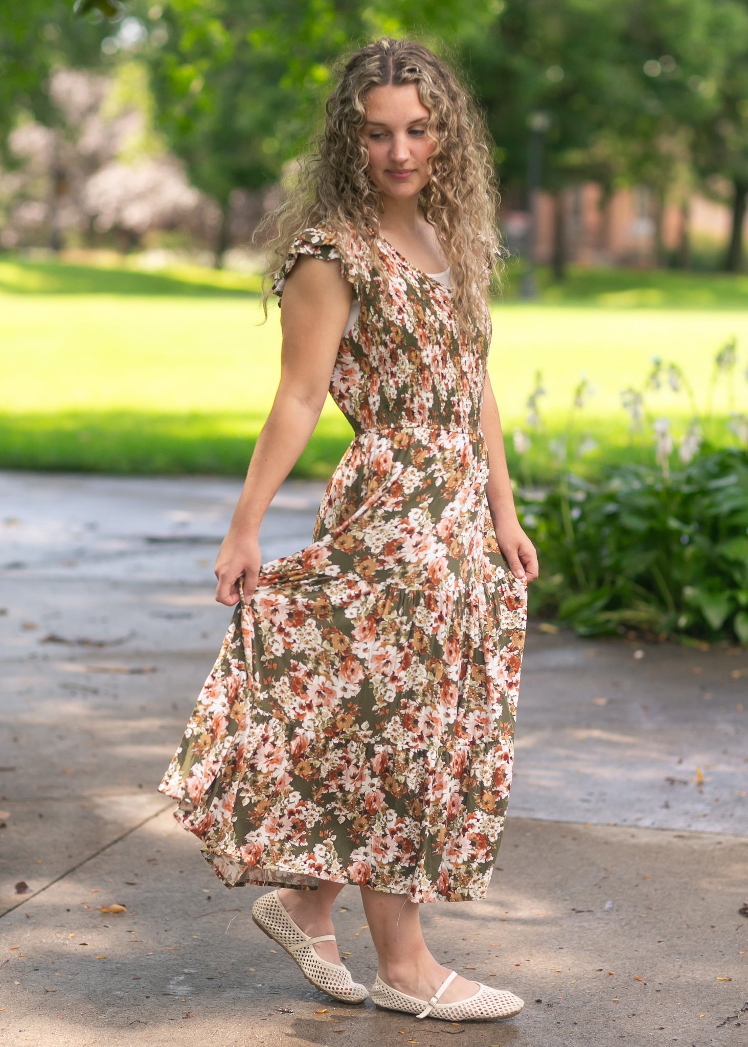 The Floral Smocked V-Neck Dress brings effortless femininity with its soft smocked bodice, tiered skirt, and flutter sleeves. Designed in earthy olive tones with warm floral blooms, this dress flows beautifully for Sunday gatherings, outdoor strolls, or afternoon brunch. Pair with simple flats for an easy day look or layer with a denim jacket for timeless modest styling.