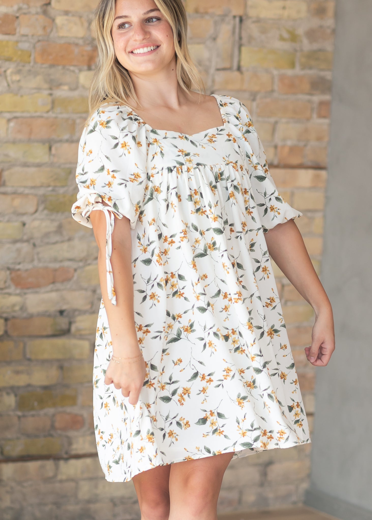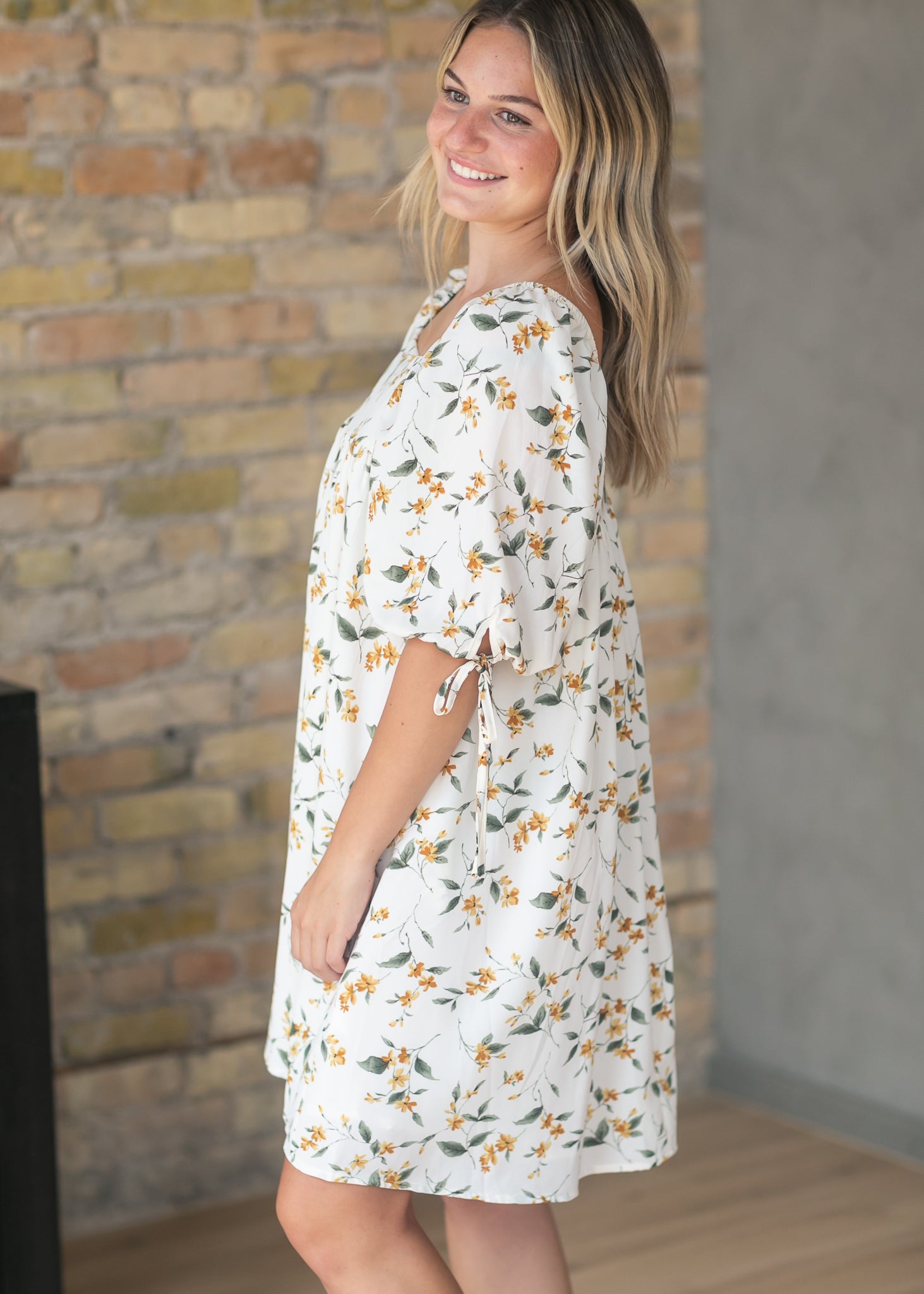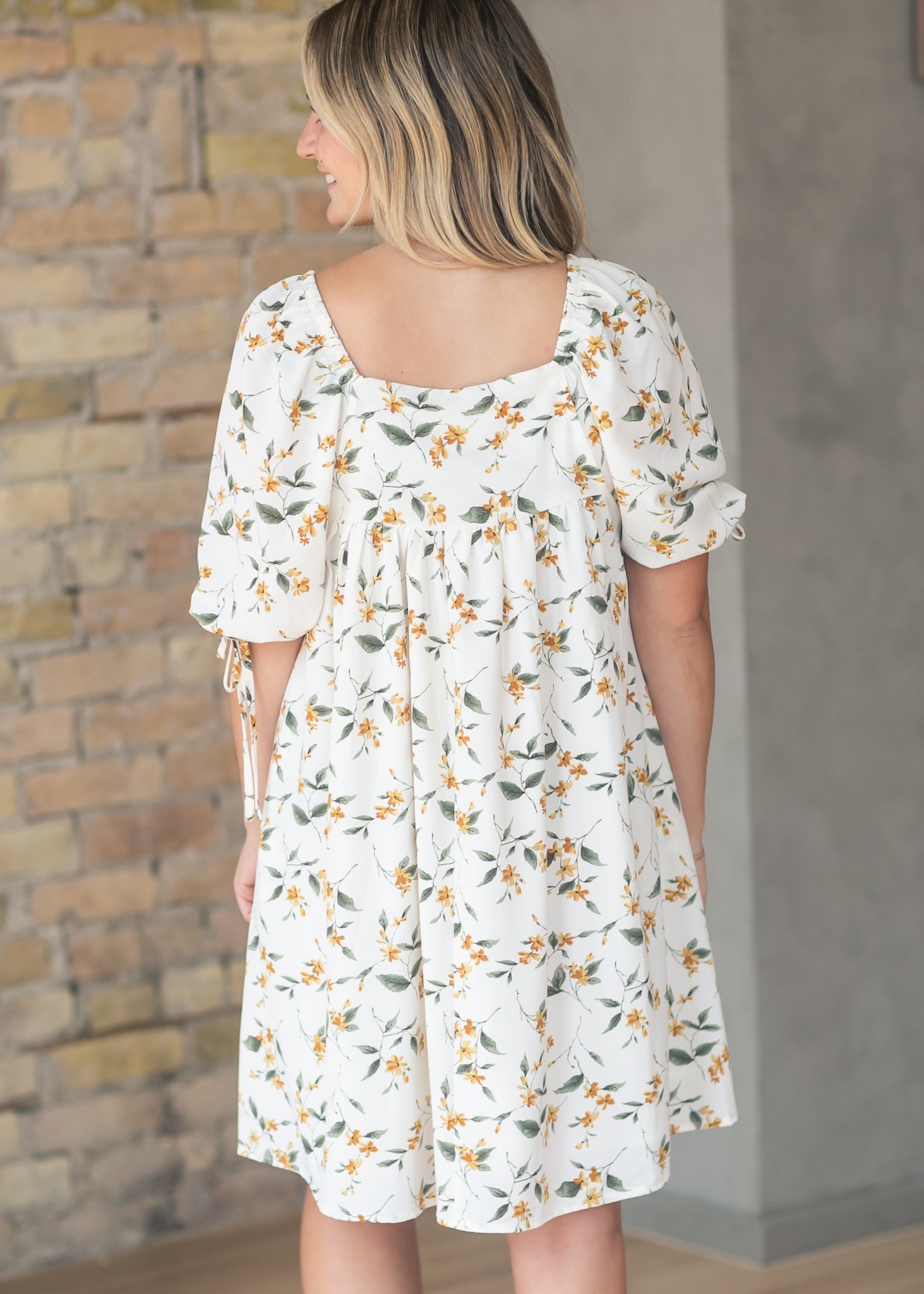 The Floral Square Neck Tie Sleeve Dress captures effortless grace with its airy silhouette and delicate yellow blooms on a soft ivory backdrop. Featuring a flattering square neckline and tie sleeves for a touch of detail, it’s perfect for sunny outings, garden parties, or weekend strolls. Pair with woven flats or a denim jacket for a modest, timeless ensemble!