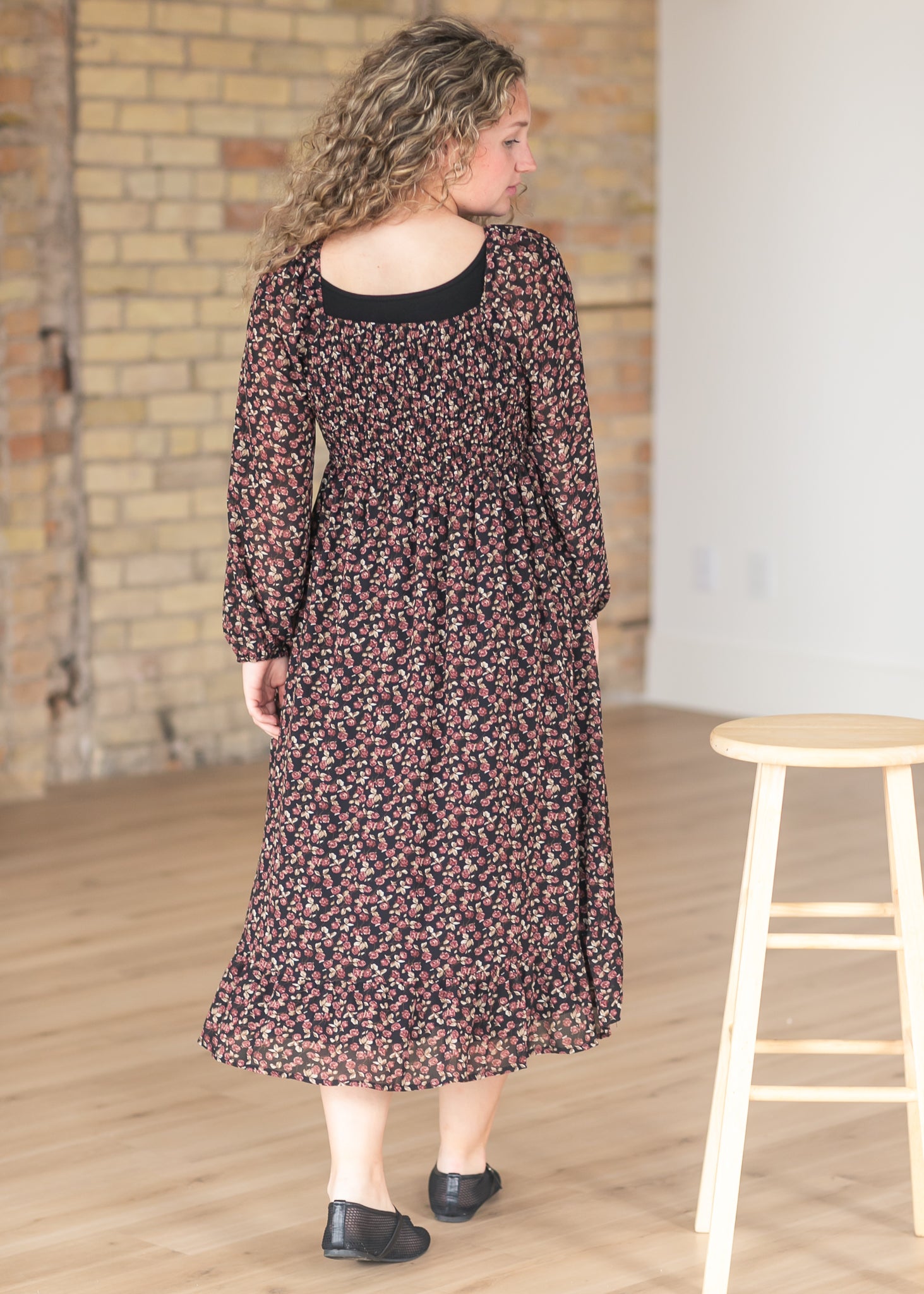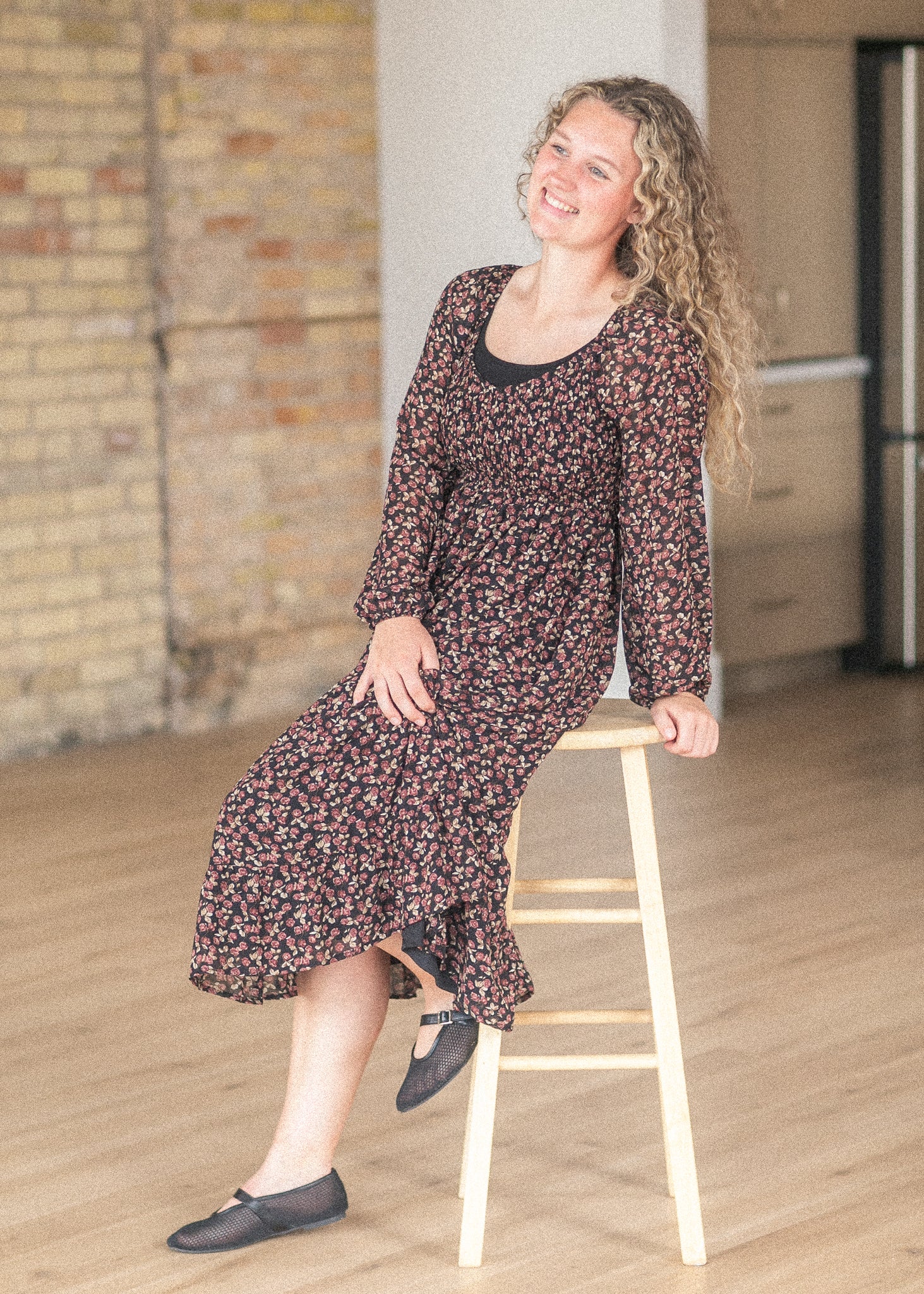 The Greer Long Sleeve Dress carries a graceful flow with its vintage-inspired floral print set against a dark backdrop, creating a look both timeless and feminine. The smocked bodice and airy sleeves offer comfort and ease, perfect for days spent wandering through bookstores or gathering with friends. Pair it with boots or flats for a modest, effortless style that lingers through every season.