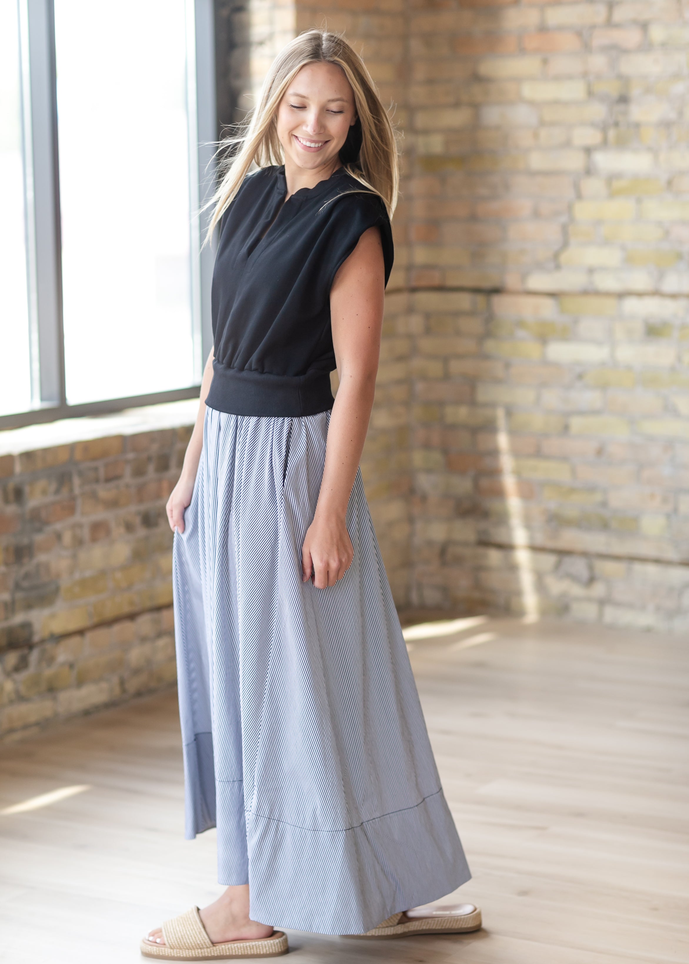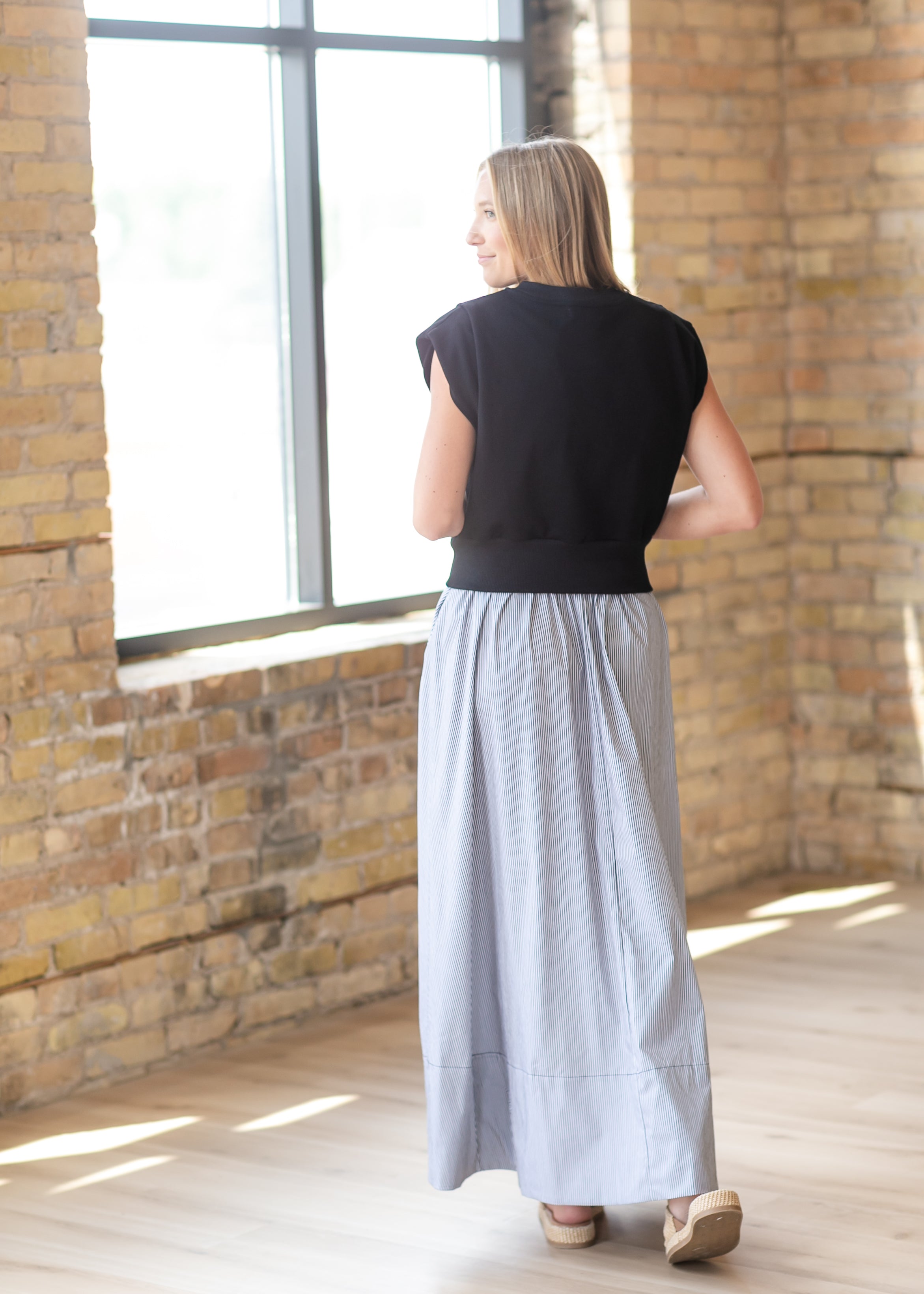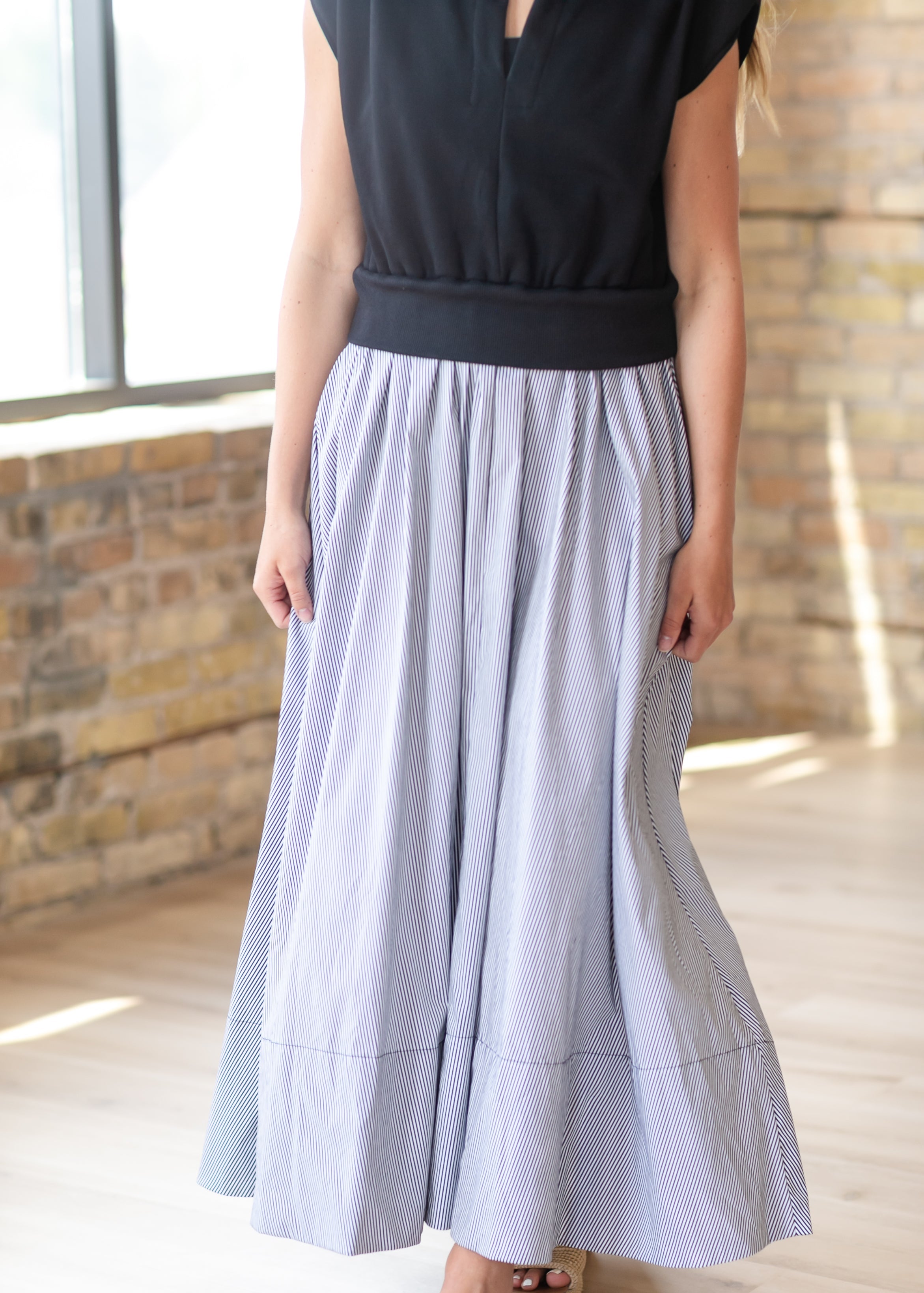 The Mixed Media Maxi Dress blends softness and structure for a modest, elevated everyday look. Featuring a knit top with a tailored waistband and a lightweight woven skirt, this Inherit original creates effortless contrast and flow. Hidden side pockets add practical ease, while the striped skirt brings subtle detail. A timeless silhouette designed for comfort, confidence, and all-day wear.