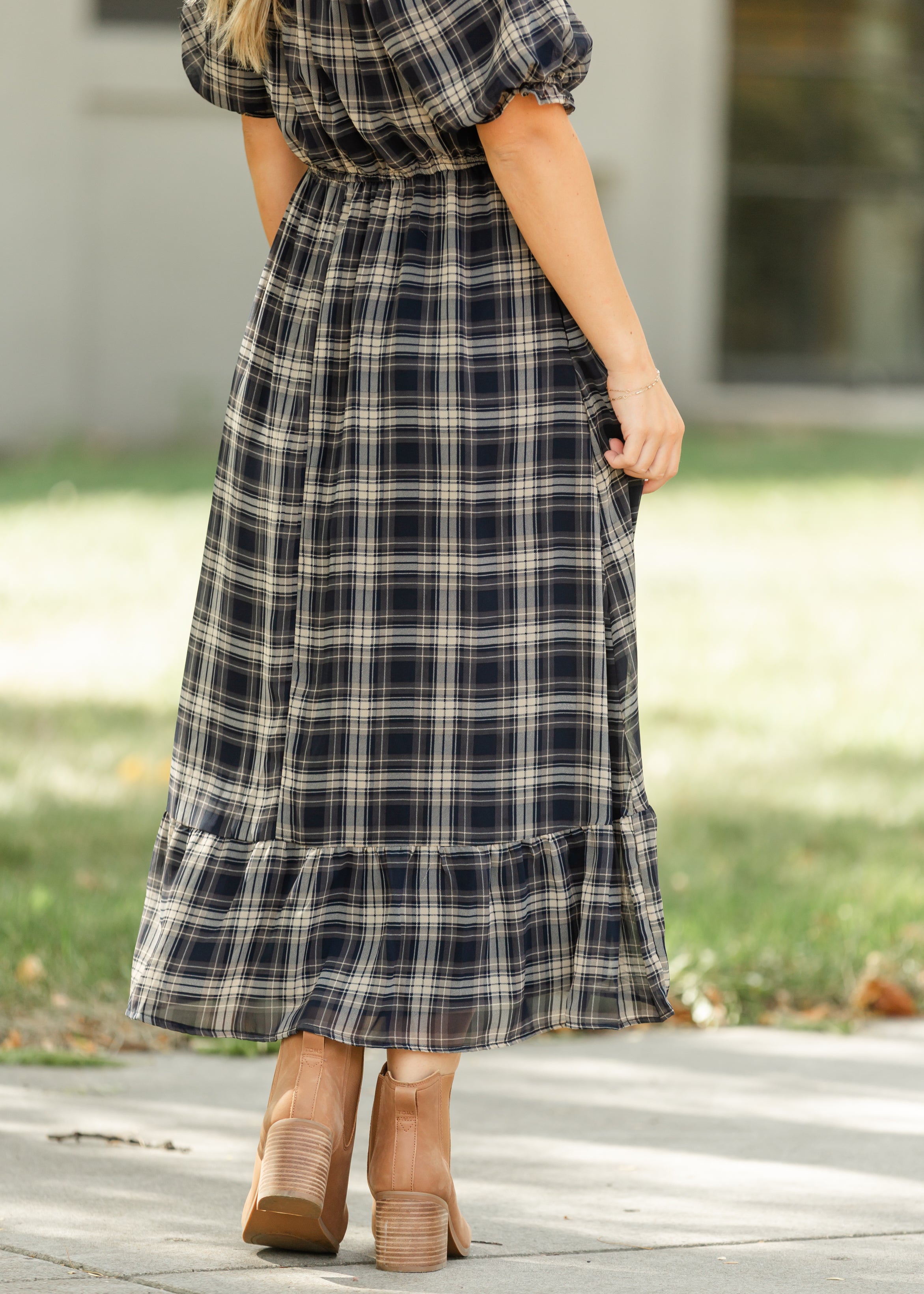 The Twila Plaid Maxi Dress brings effortless grace to your everyday moments. Designed with a classic navy and taupe plaid, this modest dress features soft puff sleeves, a gathered waist, and a gentle tiered hem that flows beautifully with each step. Its lightweight fabric offers ease and comfort, perfect for pairing with ankle boots for fall gatherings or church mornings.