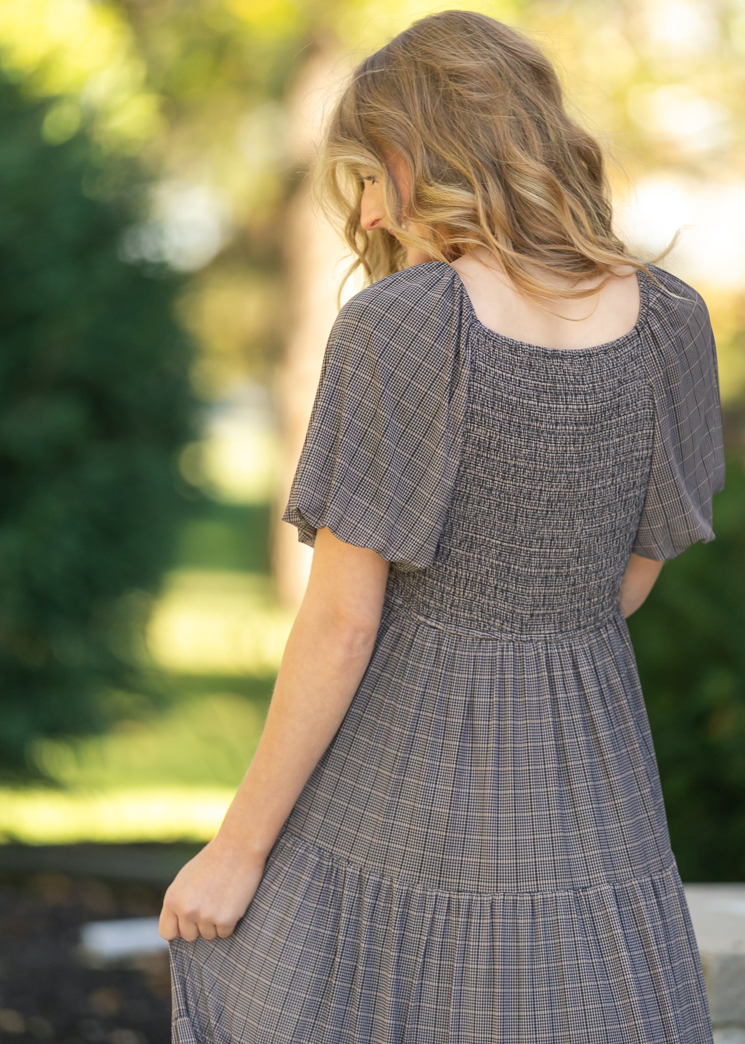 - Product Details | Plaid, Lined, Tiered, Ruched Bodice, Flutter Sleeves