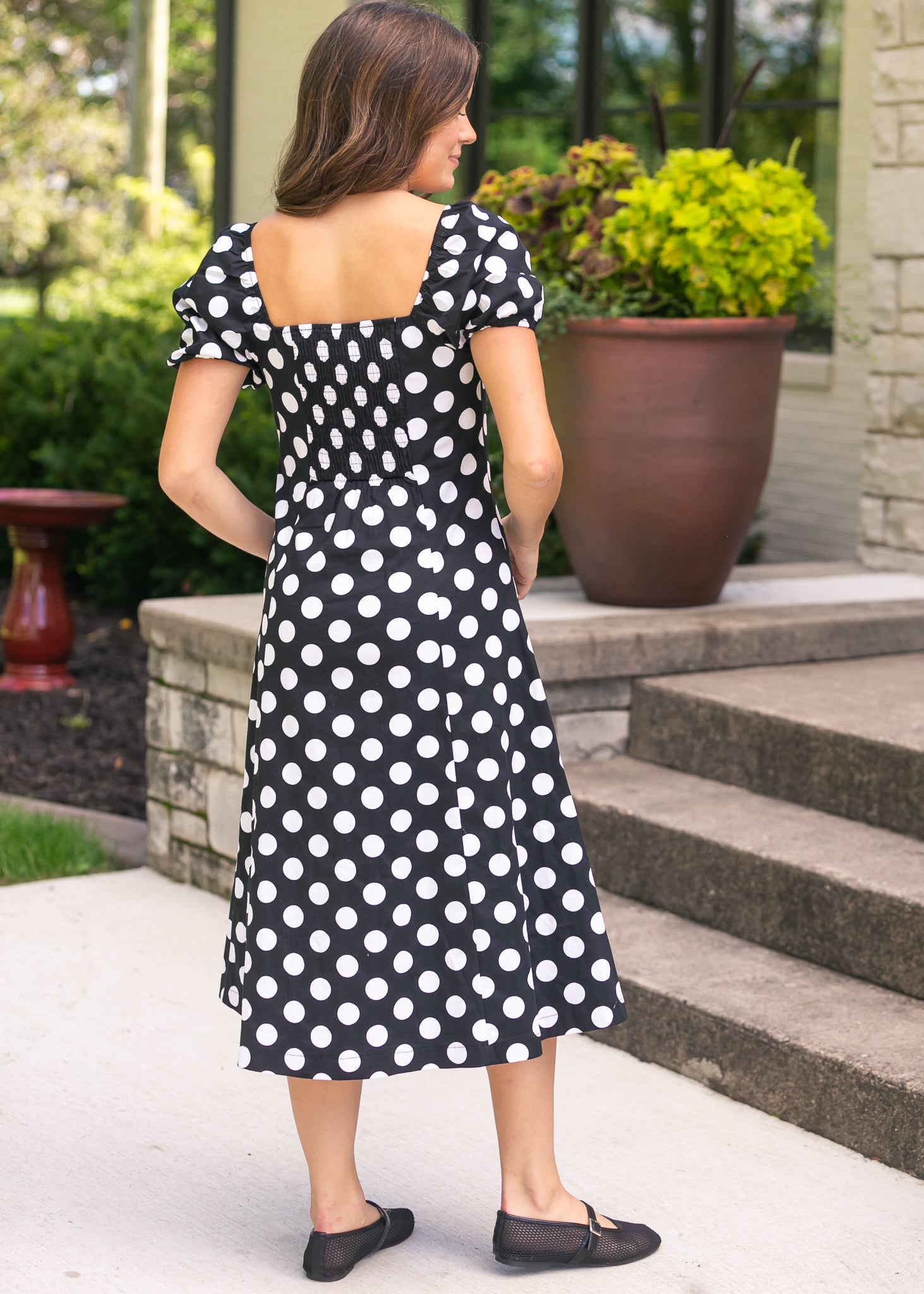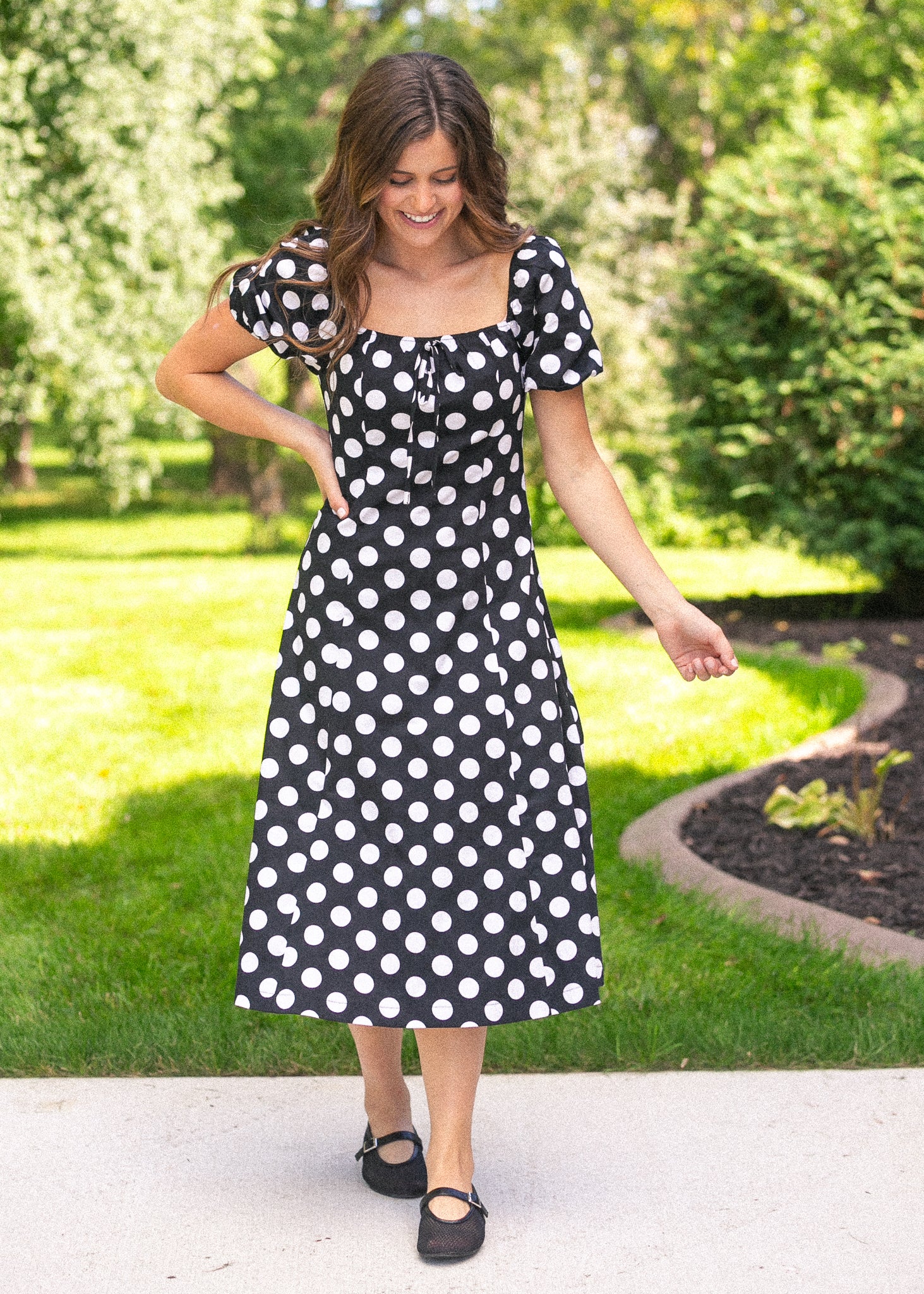 The Polka Dot Flare Midi Dress is a timeless favorite with its bold print and graceful silhouette. Designed with a smocked back for a comfortable fit, puff sleeves, and a modest square neckline, it balances playfulness with refinement. The flowing skirt moves beautifully, making it perfect for gatherings, Sunday wear, or everyday moments where you want to feel both feminine and effortless.