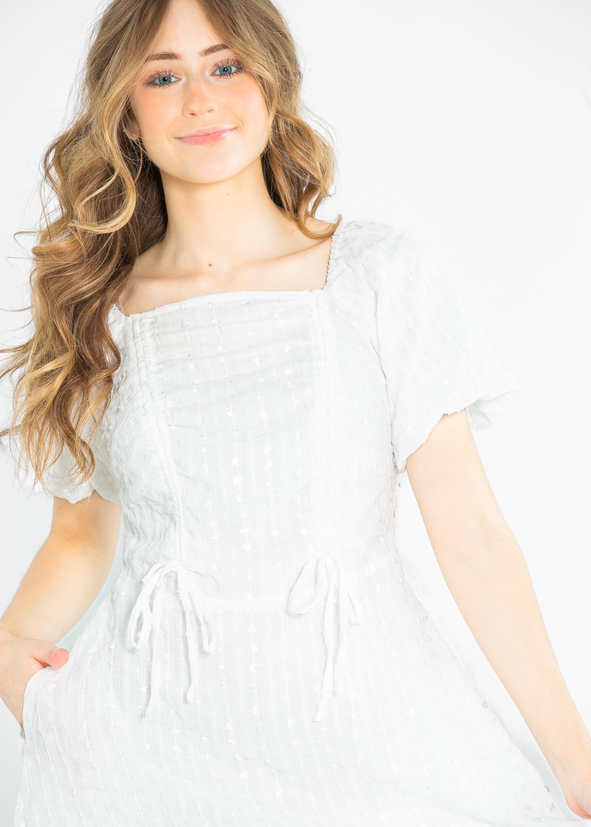 The Saylor Square Neckline White Midi Dress is a delicate blend of sweet and structured. Designed with a textured overlay and dreamy square neckline, this dress cinches with adjustable ties for a feminine fit. Flutter sleeves add a playful touch while the lightweight feel keeps things breezy and modest. It’s the perfect white dress for summer celebrations and everyday grace!
