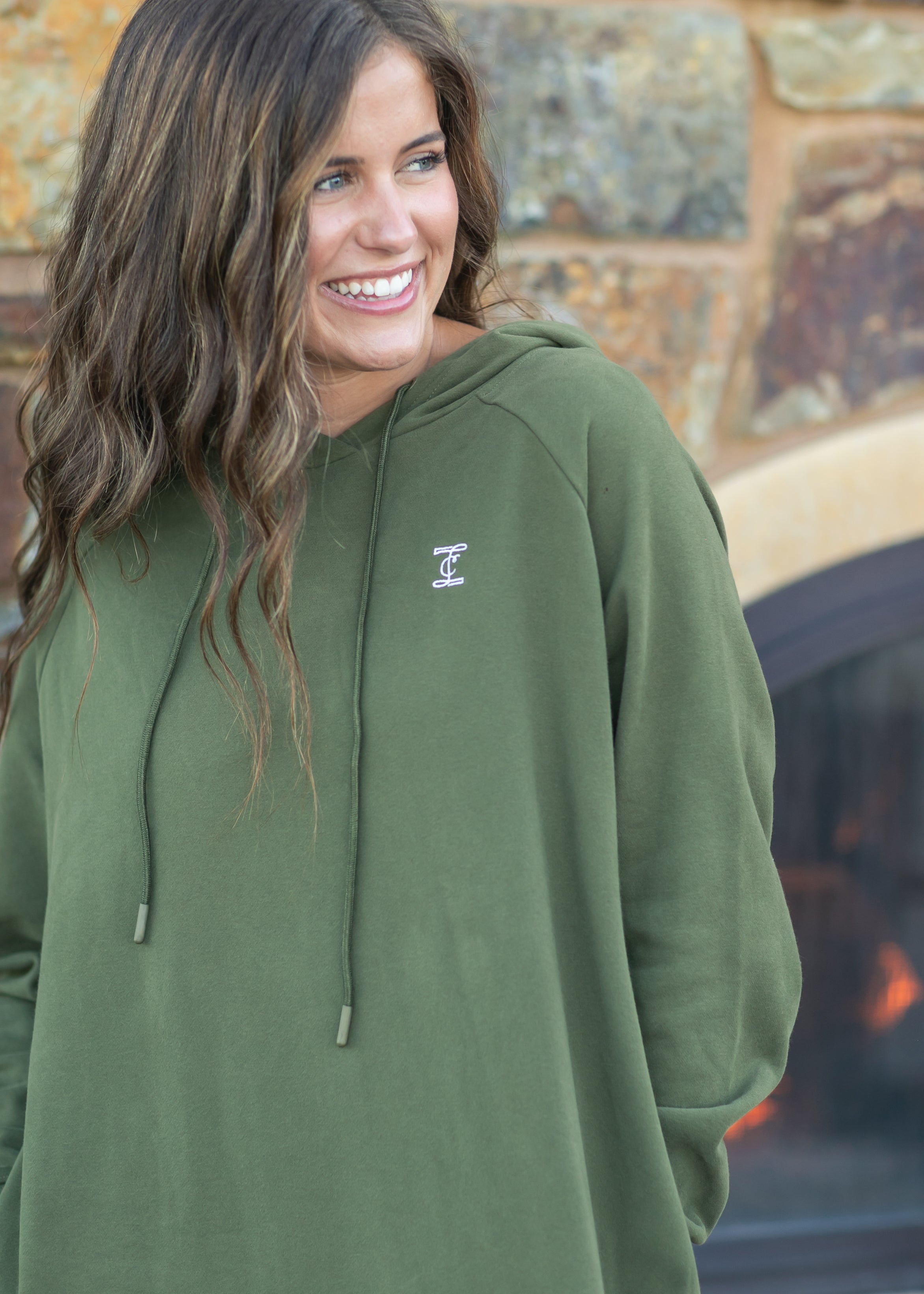 The Scout Long Hooded Sweatshirt Dress is an everyday go-to with comfort built right in. Designed in olive green fleece, this modest 45" hoodie dress features a relaxed silhouette, dropped shoulders, and ribbed cuffs that blend lounge comfort with an effortlessly elevated finish. Complete with side pockets and a functional hood, it’s perfect for casual days that still feel put-together!