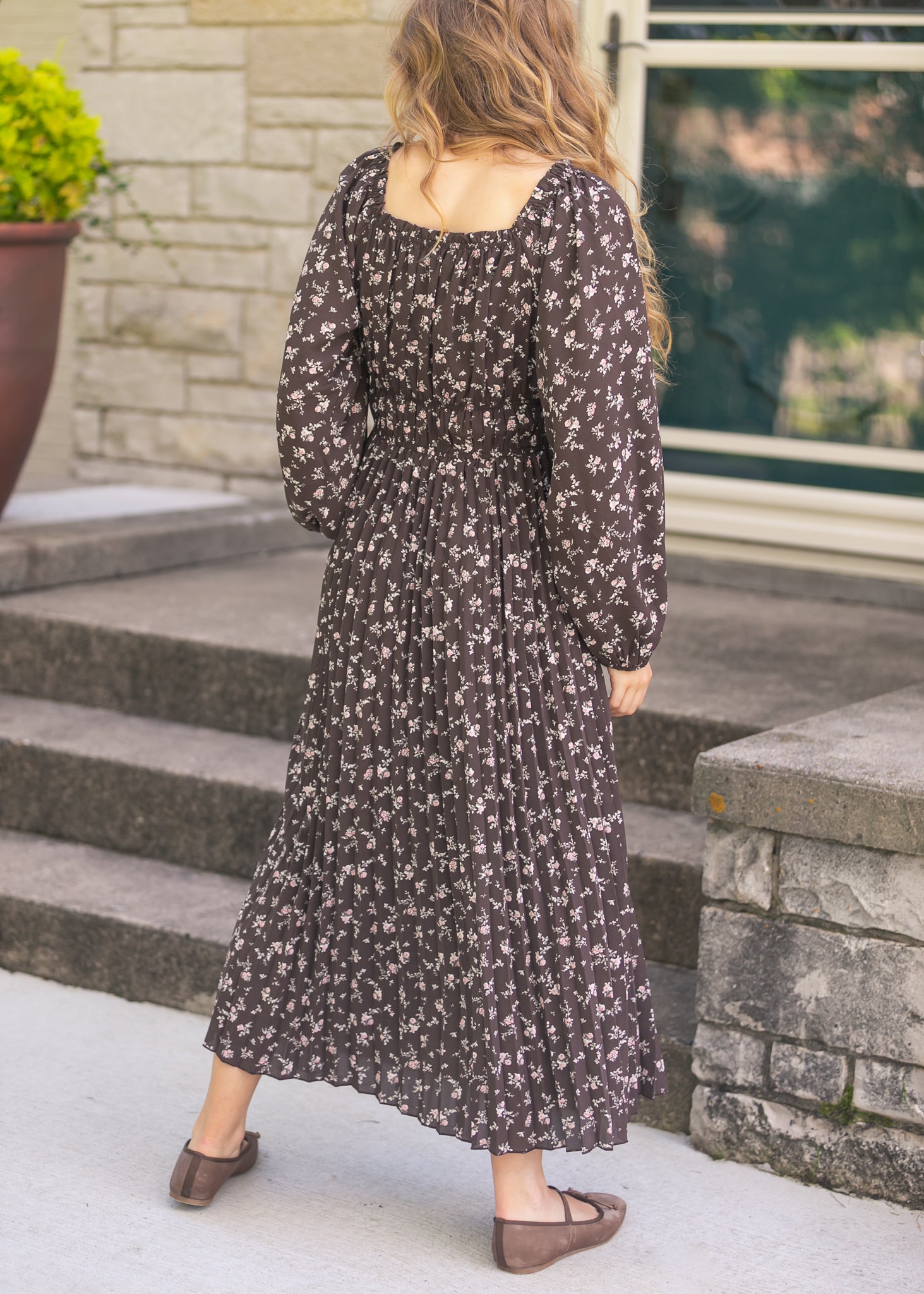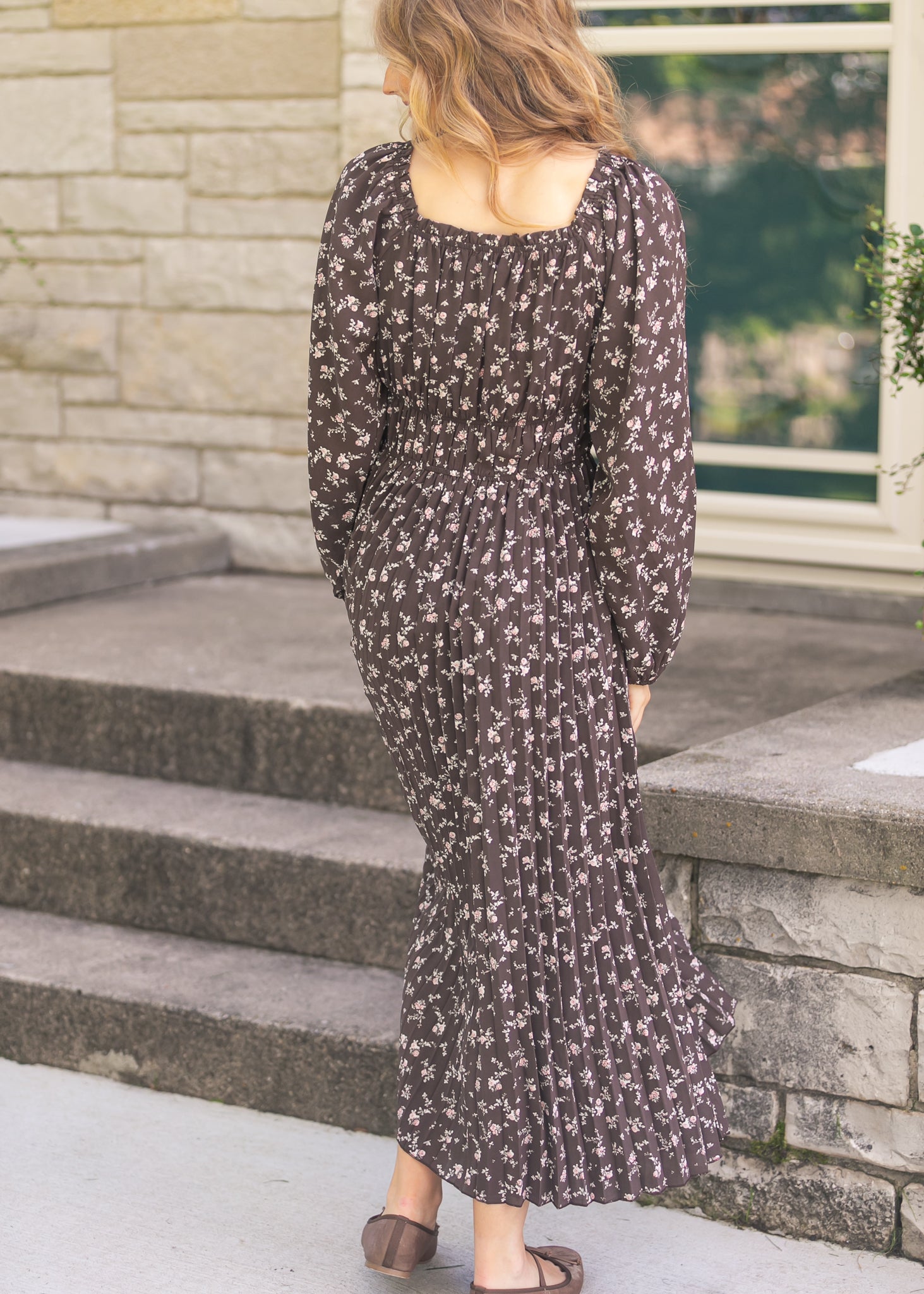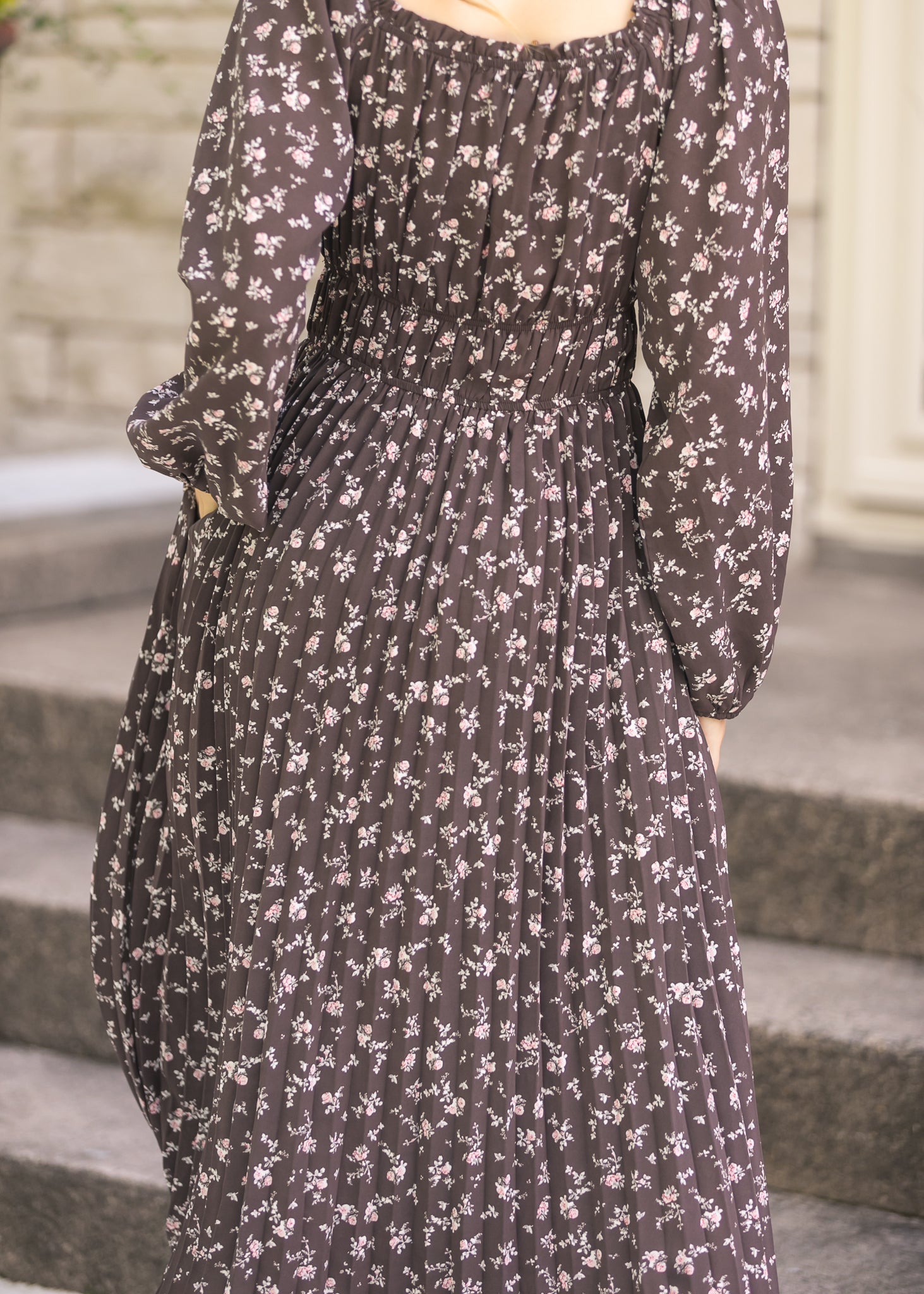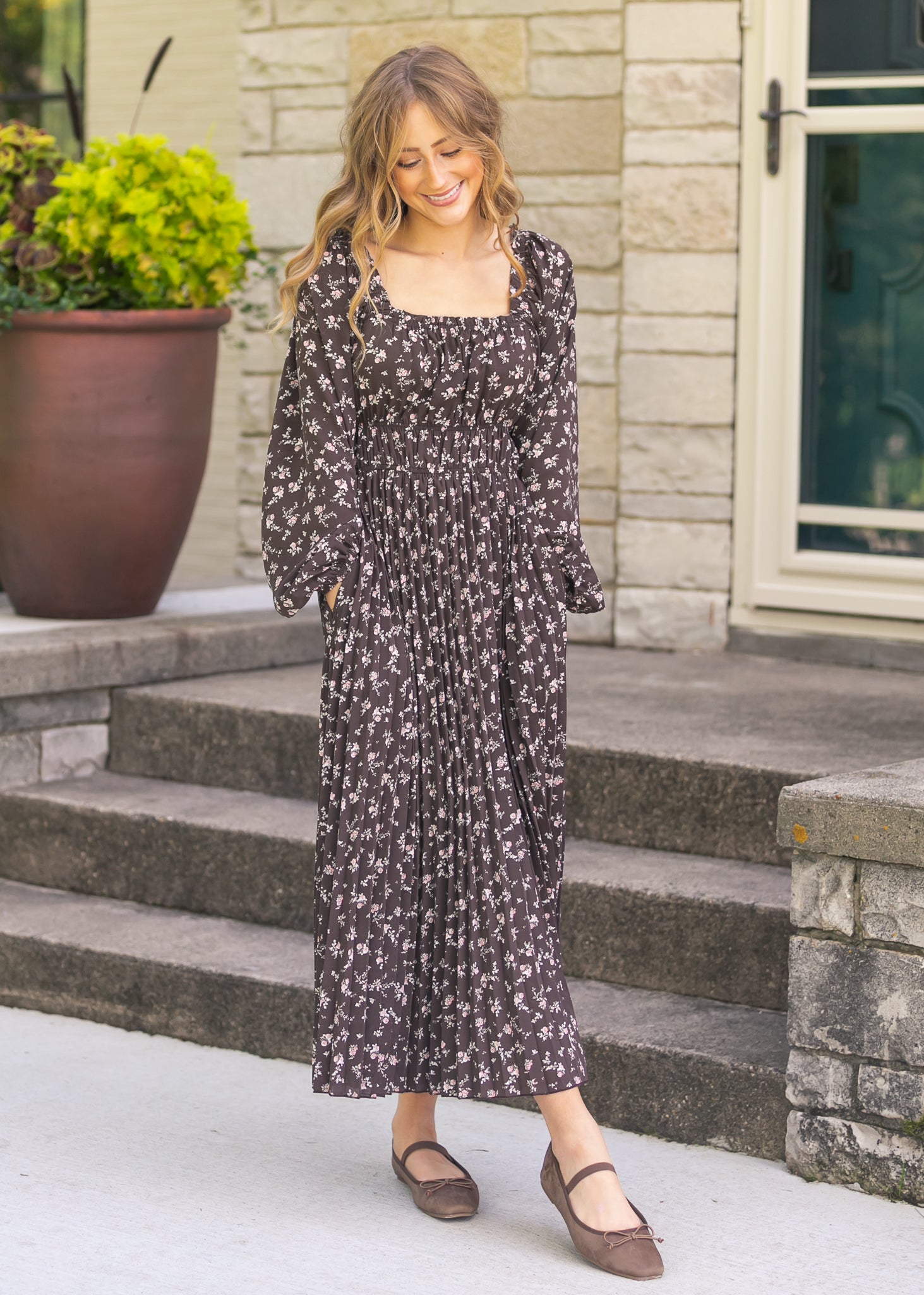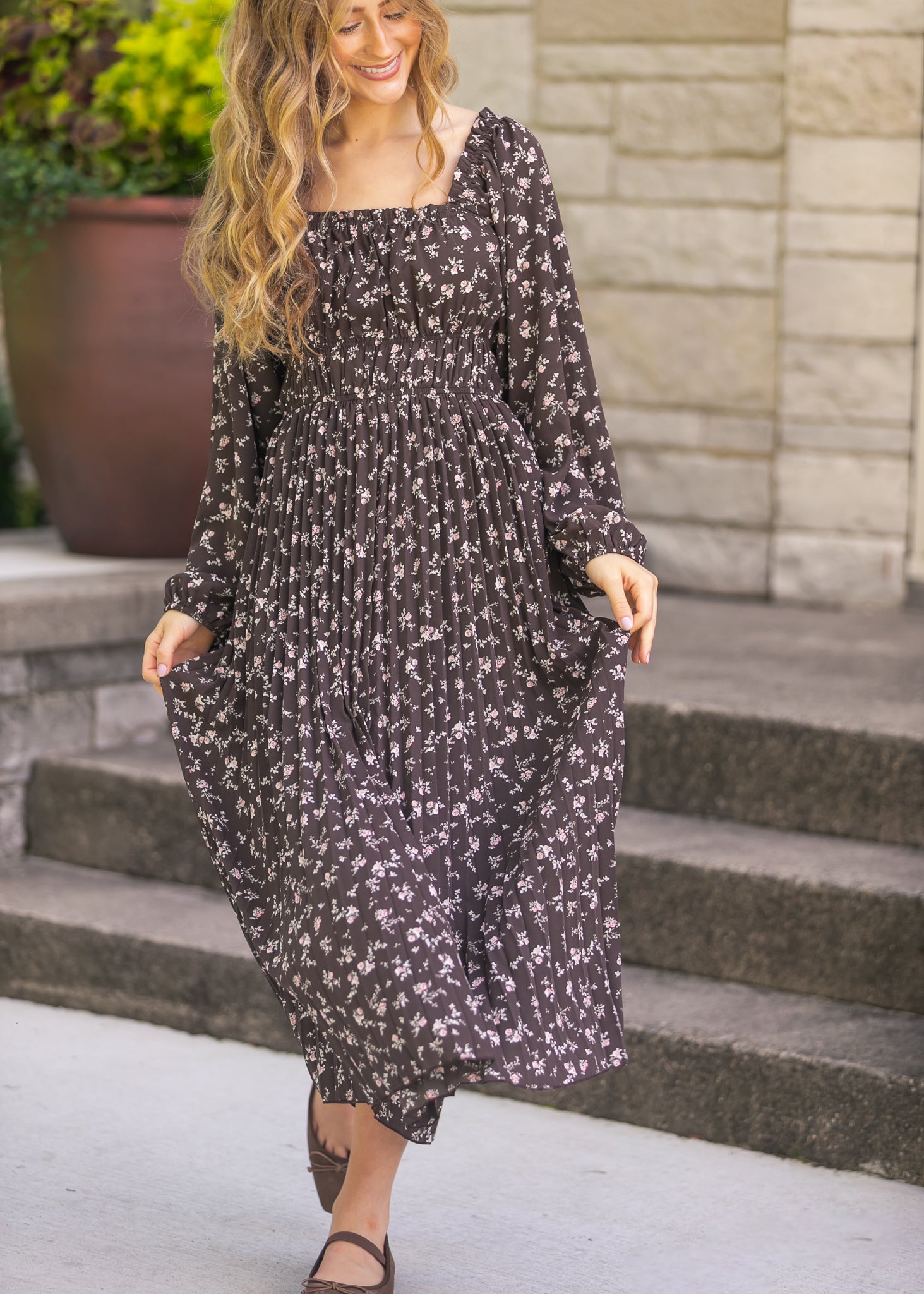 The Square Neck Floral Maxi Dress is a timeless piece with soft pleats, long sleeves, and a flattering smocked bodice that moves beautifully with every step. Its dainty floral print rests on a dark backdrop, making it easy to dress up or down. Pair it with ballet flats or layer with a cozy cardigan for a graceful, everyday feminine look.