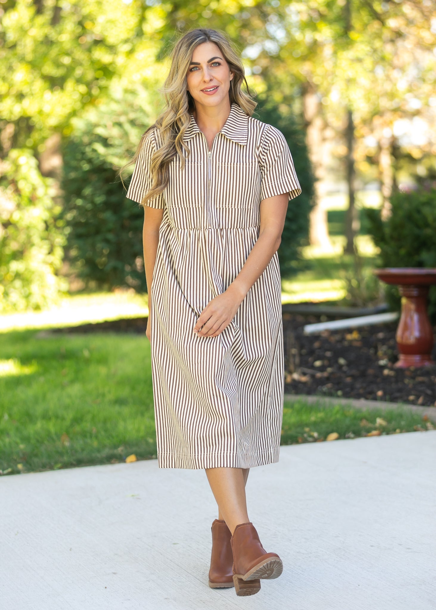 The Stripe Half Zip Midi Dress blends effortless grace with everyday comfort. Crafted with a modest silhouette, it features vertical brown and cream stripes, a functional half zip front, and handy side pockets. The gathered waist adds soft shape, while the collared neckline gives timeless polish. Style it with a cozy cardigan and brown boots for an easy, faith-filled look that feels beautifully you.