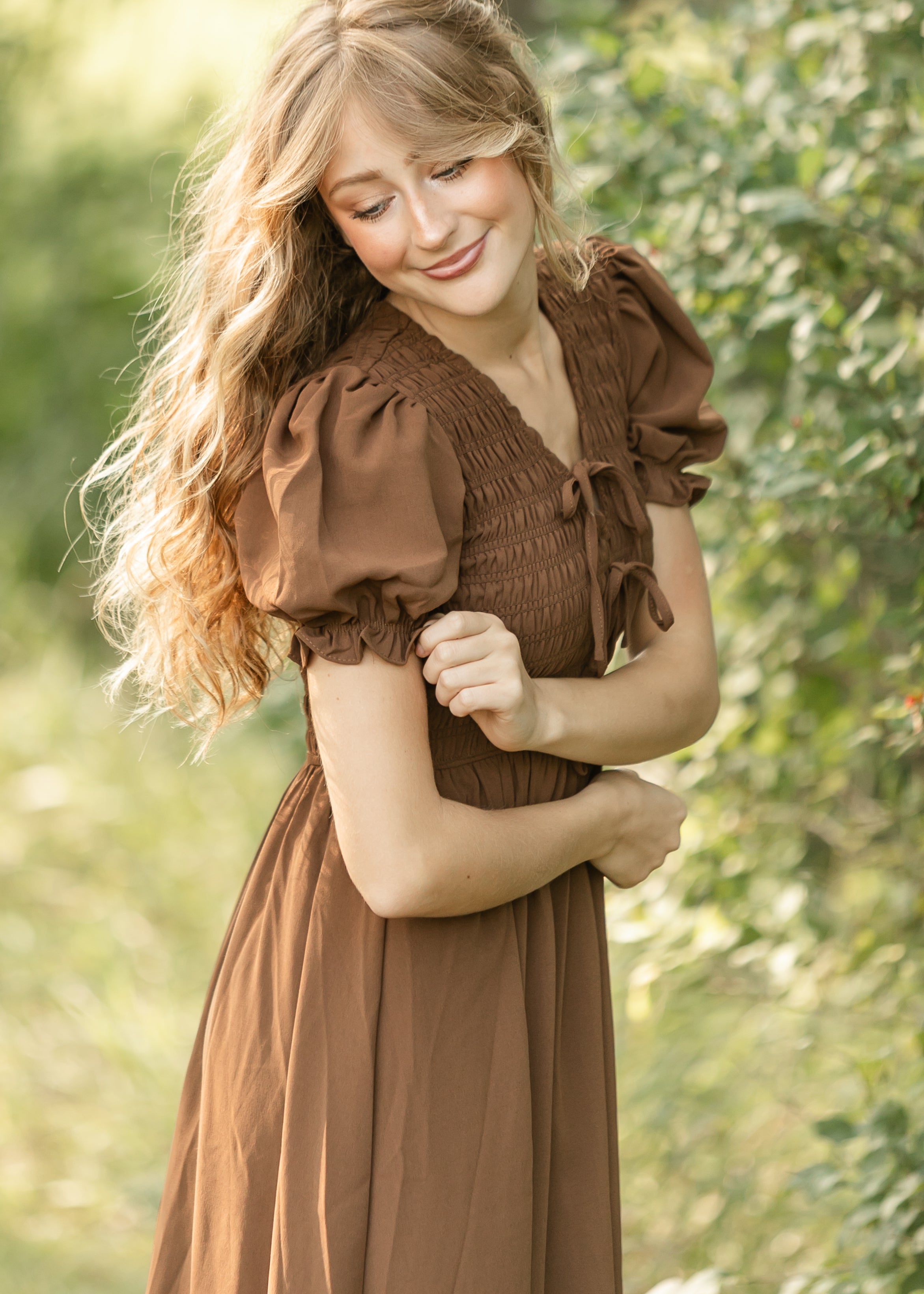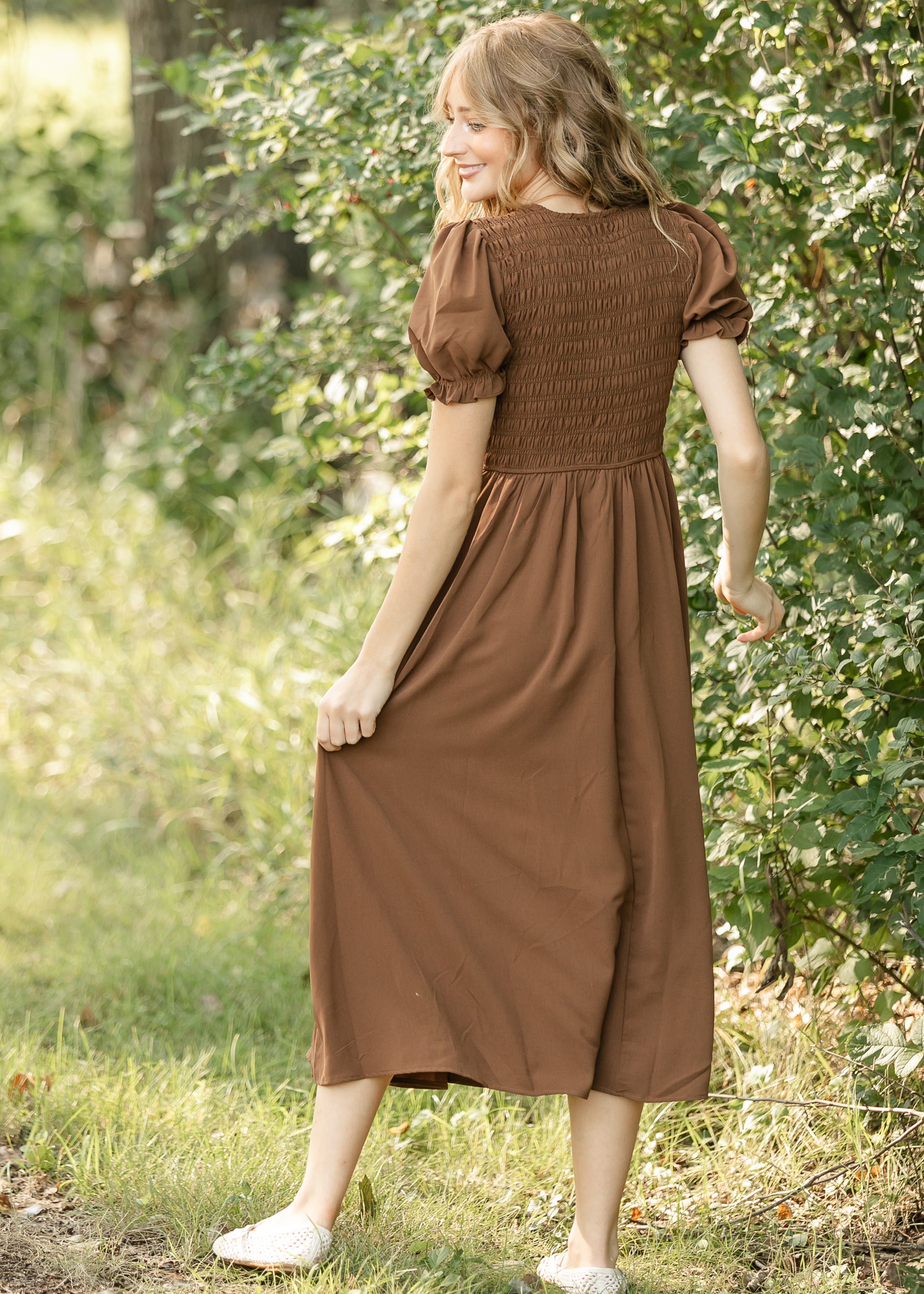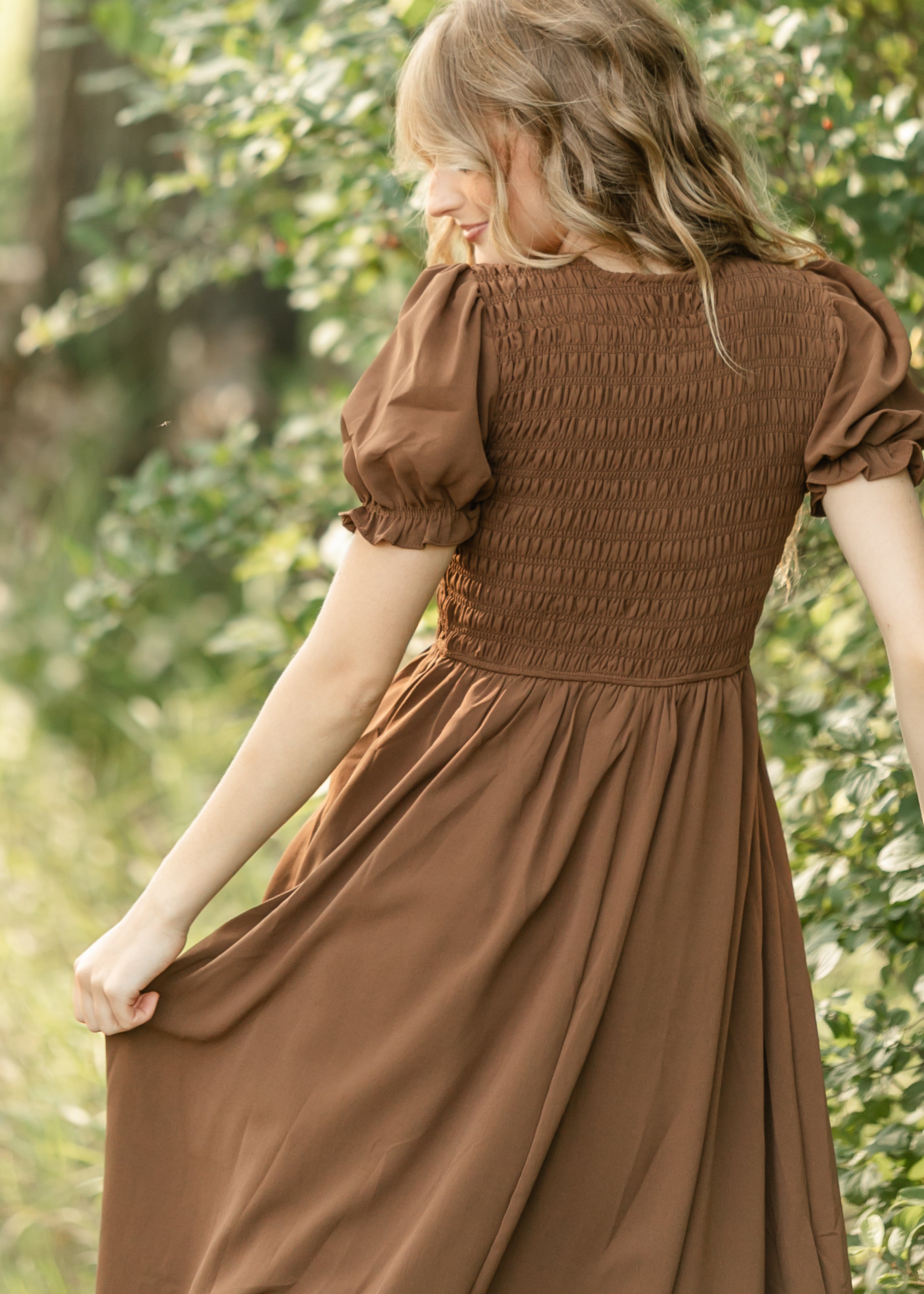 The V-neck Smocked Front Tie Midi Dress offers an effortlessly feminine silhouette with its textured smocked bodice and delicate tie-front detail. Puff sleeves add soft volume, while the flowing skirt moves gracefully for all-day comfort. Designed in a warm brown hue, this modest midi pairs beautifully with flats or ankle boots for a refined, seasonless look.