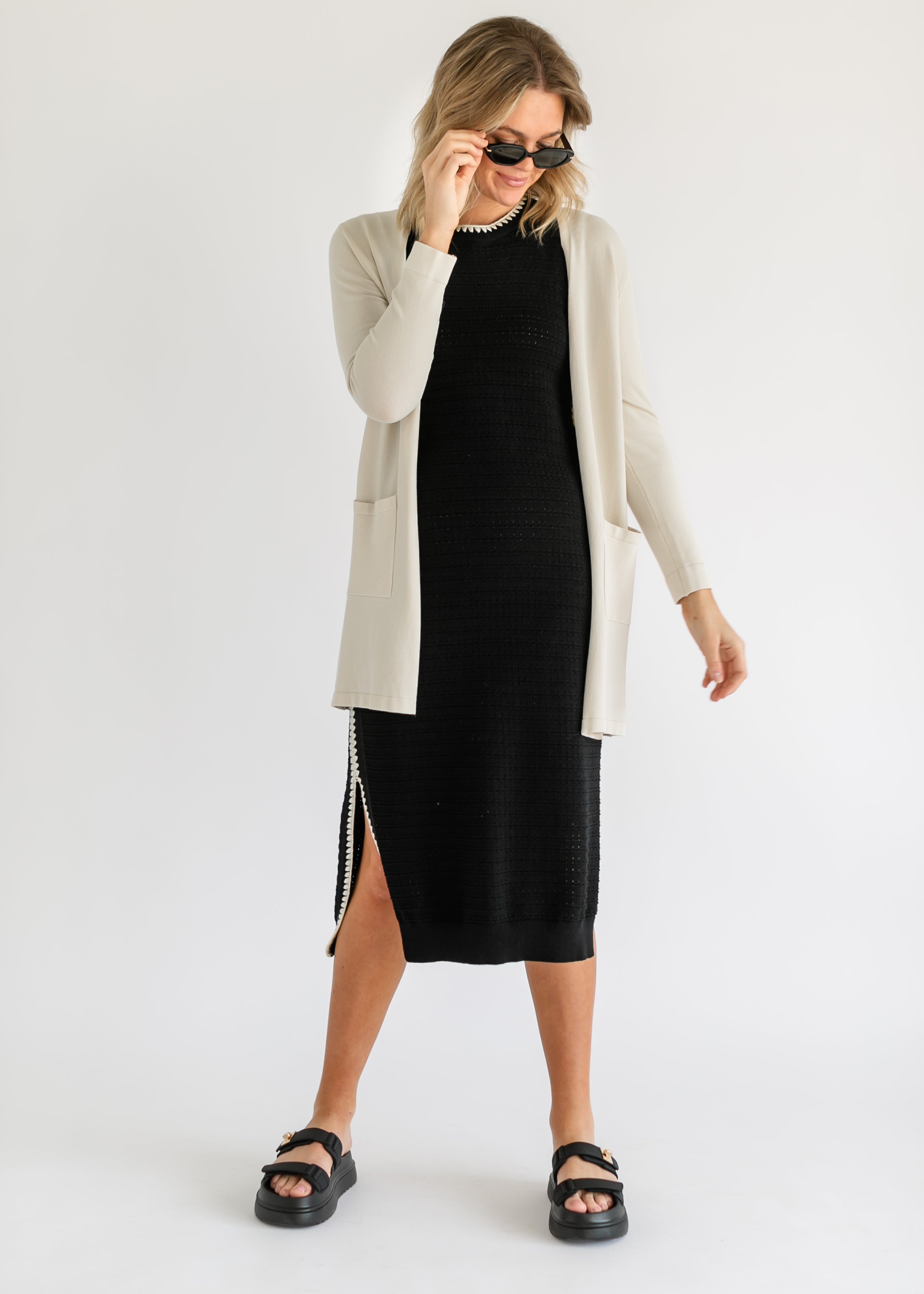 The VARLEY Dwight Tank Knit Embroidered Dress blends timeless elegance with effortless ease. Crafted from a breathable pointelle knit with feminine contrast edging, this sleeveless midi dress flows with subtle side slits and a relaxed silhouette. Perfect for day-to-night wear, pair it with sandals or heels for a refined look that’s equal parts polished and comfortable!