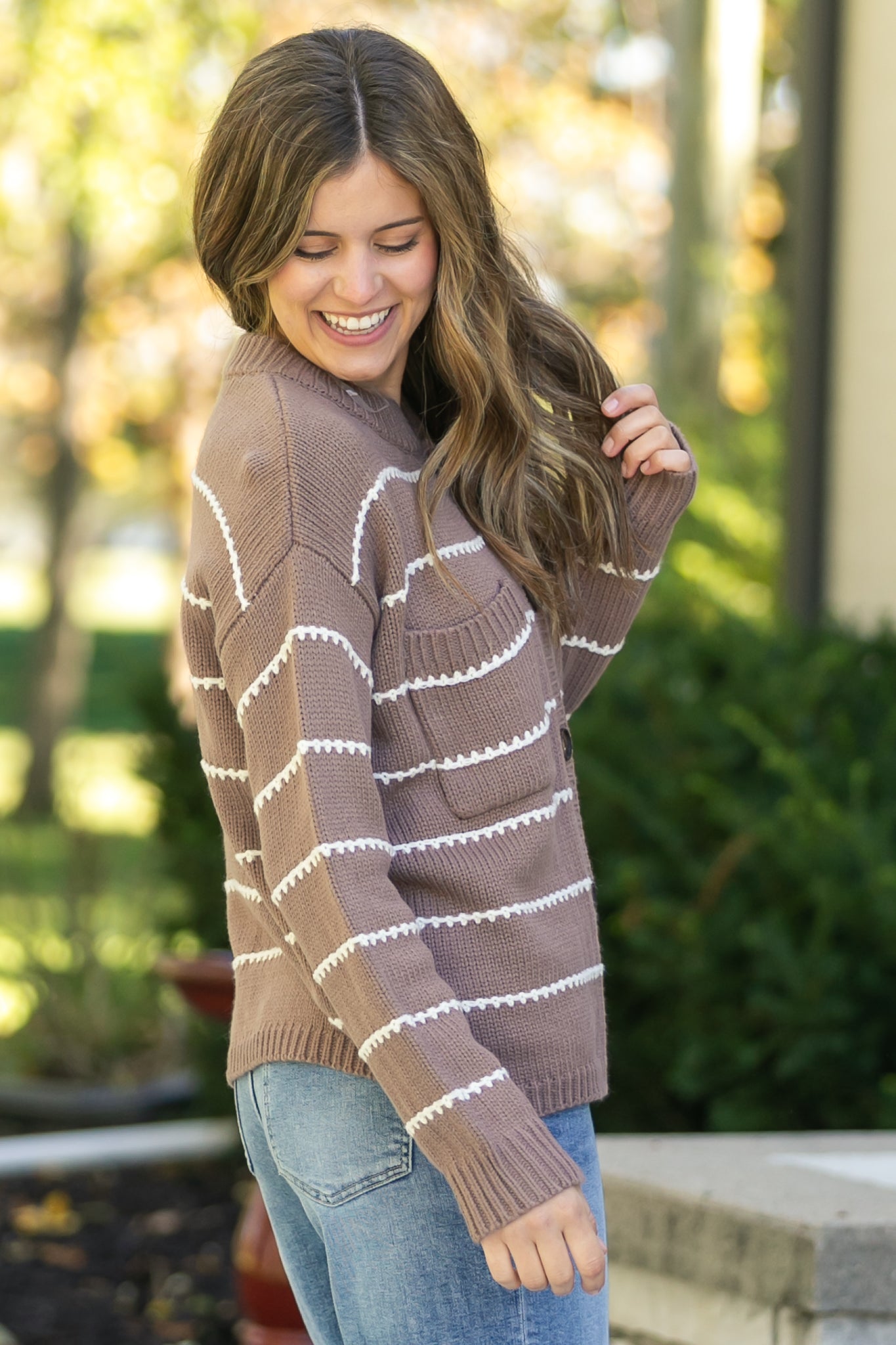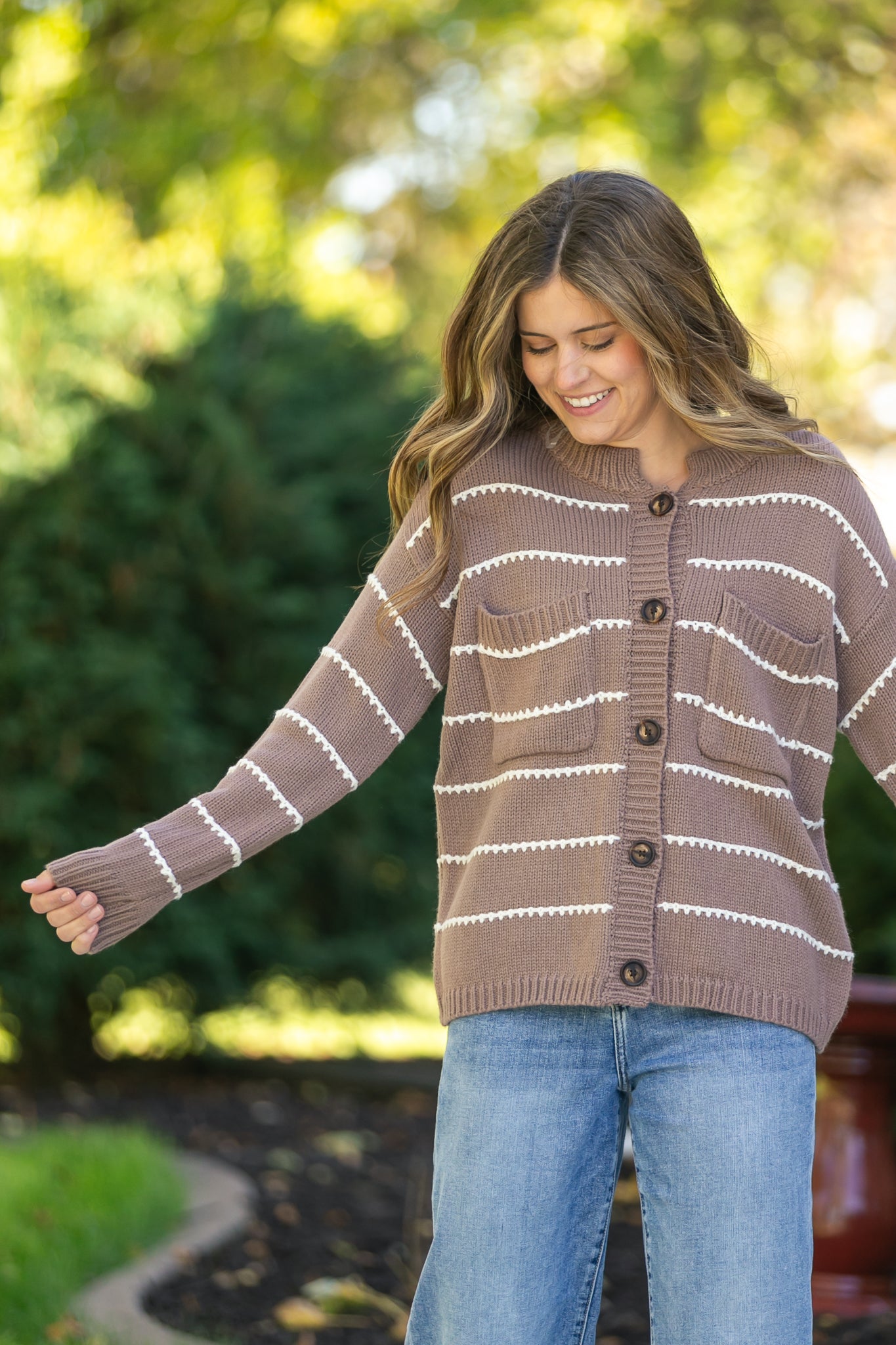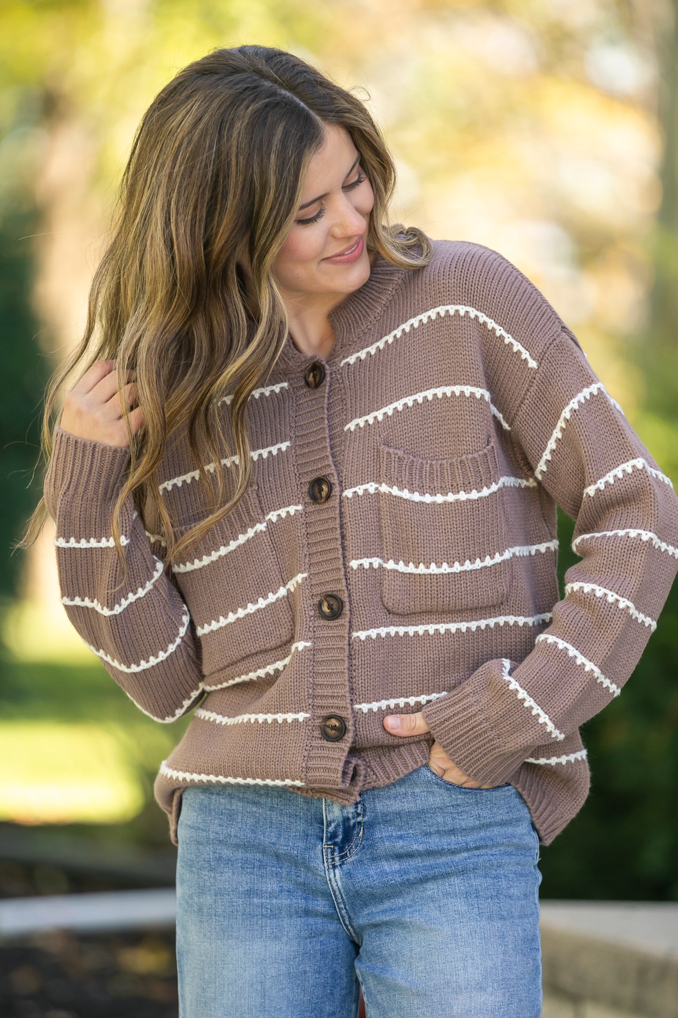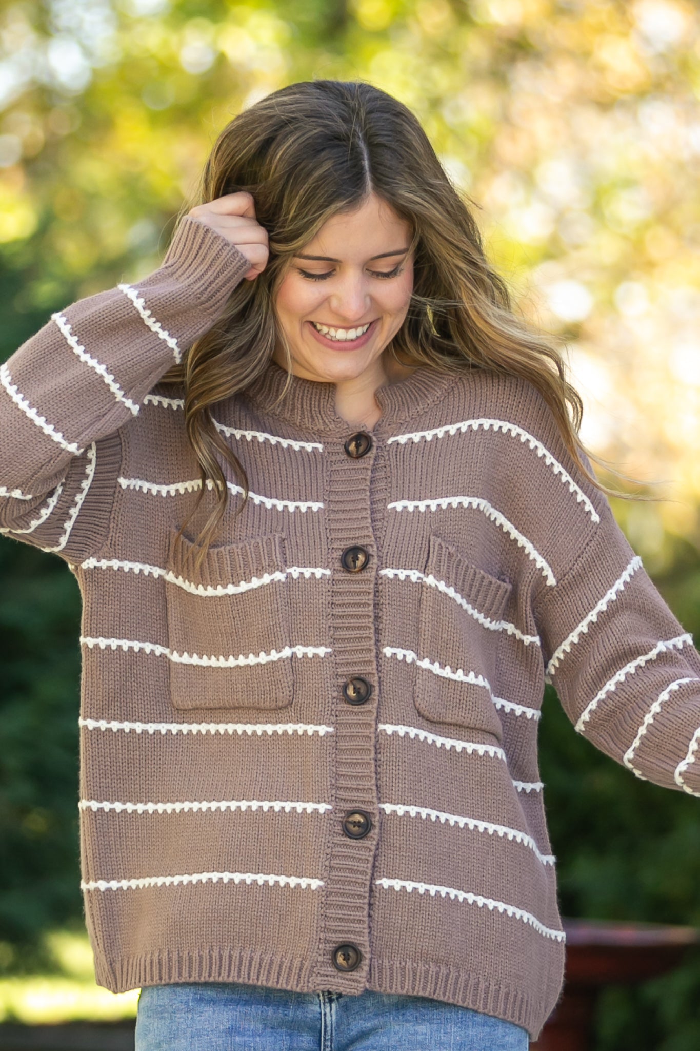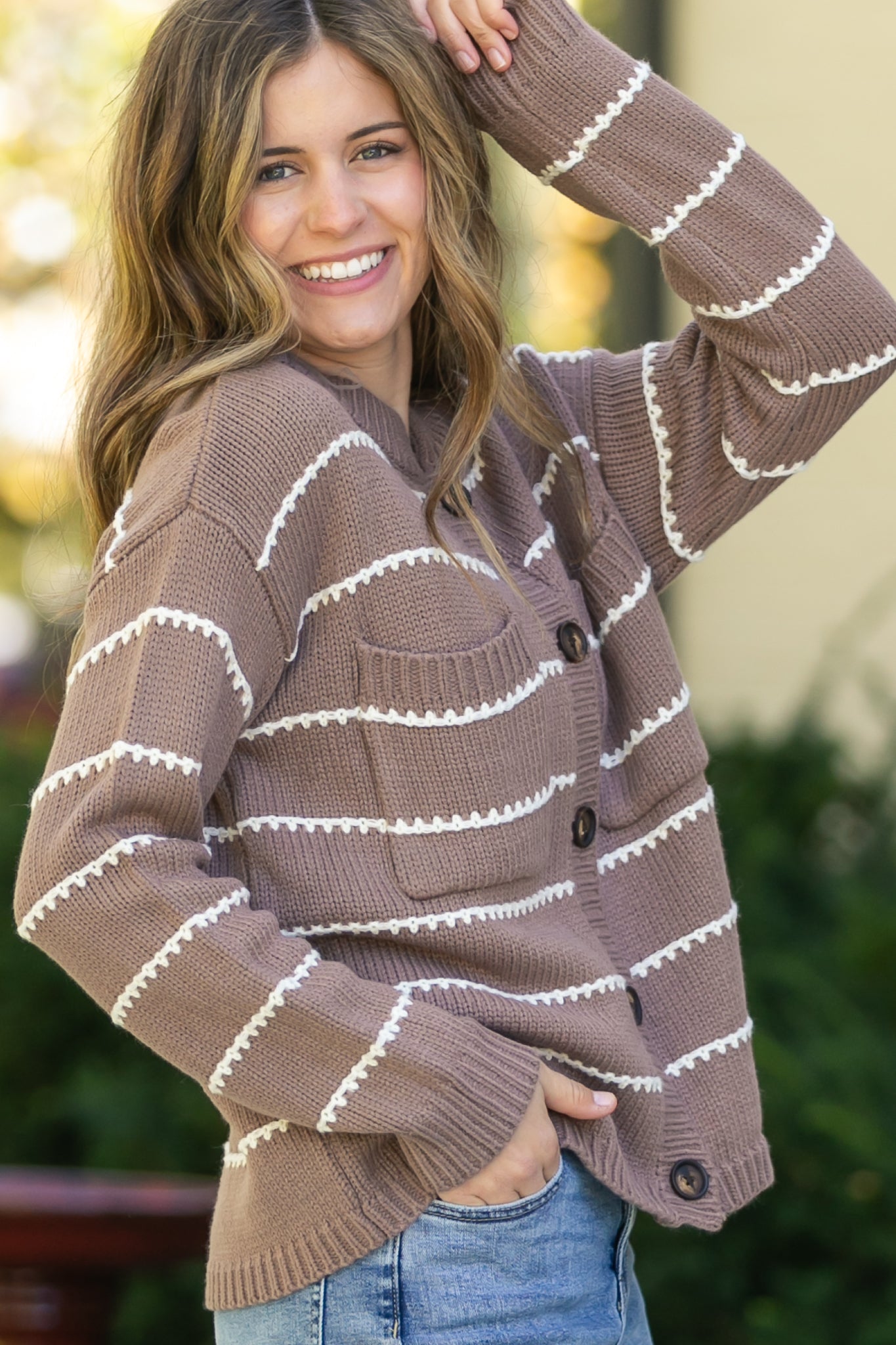 The Blanket Stitched Striped Button Down Sweater brings warmth and grace to your everyday moments. Crafted in a cozy knit with delicate white blanket stitching over a soft mocha base, it offers an effortless look of modest beauty. The button front and pockets add classic detail, perfect to pair with flowy skirts or denim for a timeless, faith-filled style.