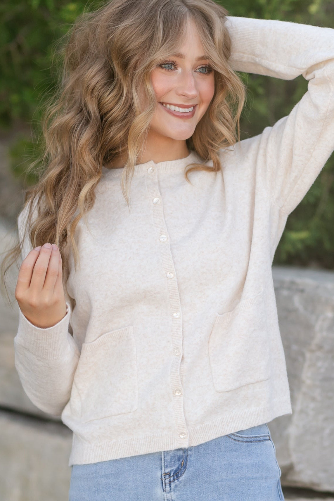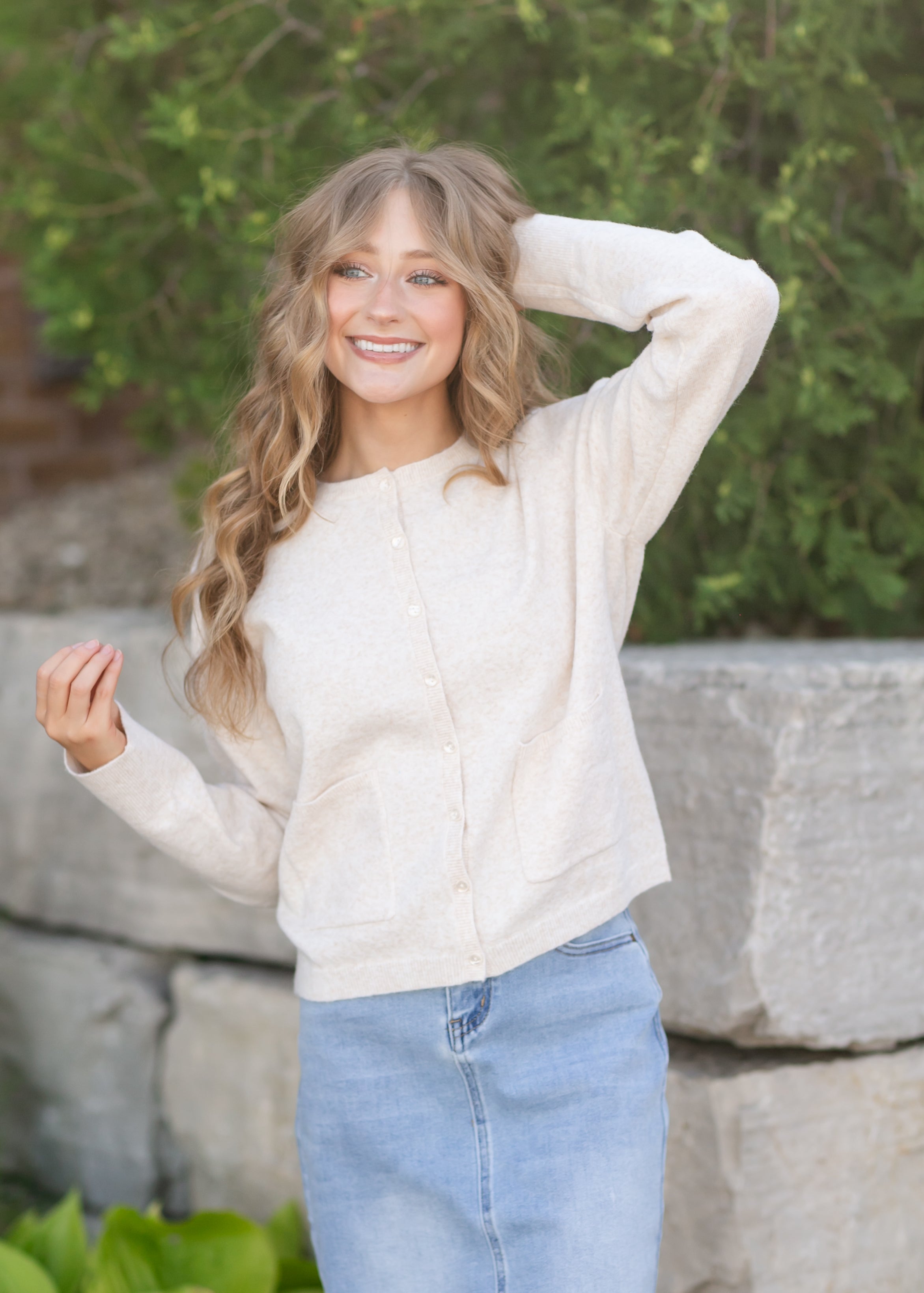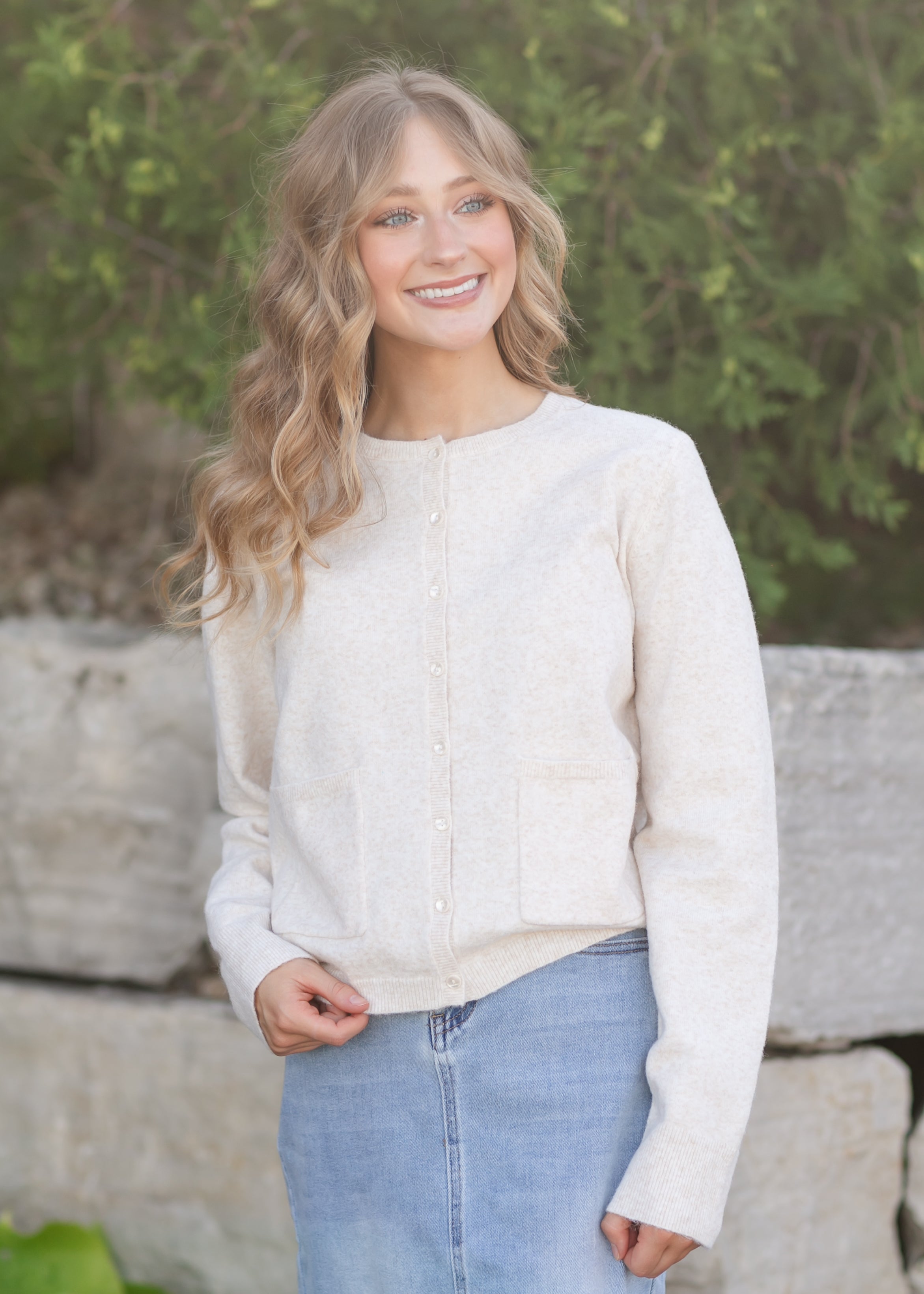 A timeless layer you'll reach for all season long, this modest cardigan features a soft knit and classic crew neckline. Functional front pockets and delicate button details make it as practical as it is pretty. With a relaxed fit that's easy to layer, it's designed to add warmth and elegance to your everyday wardrobe.