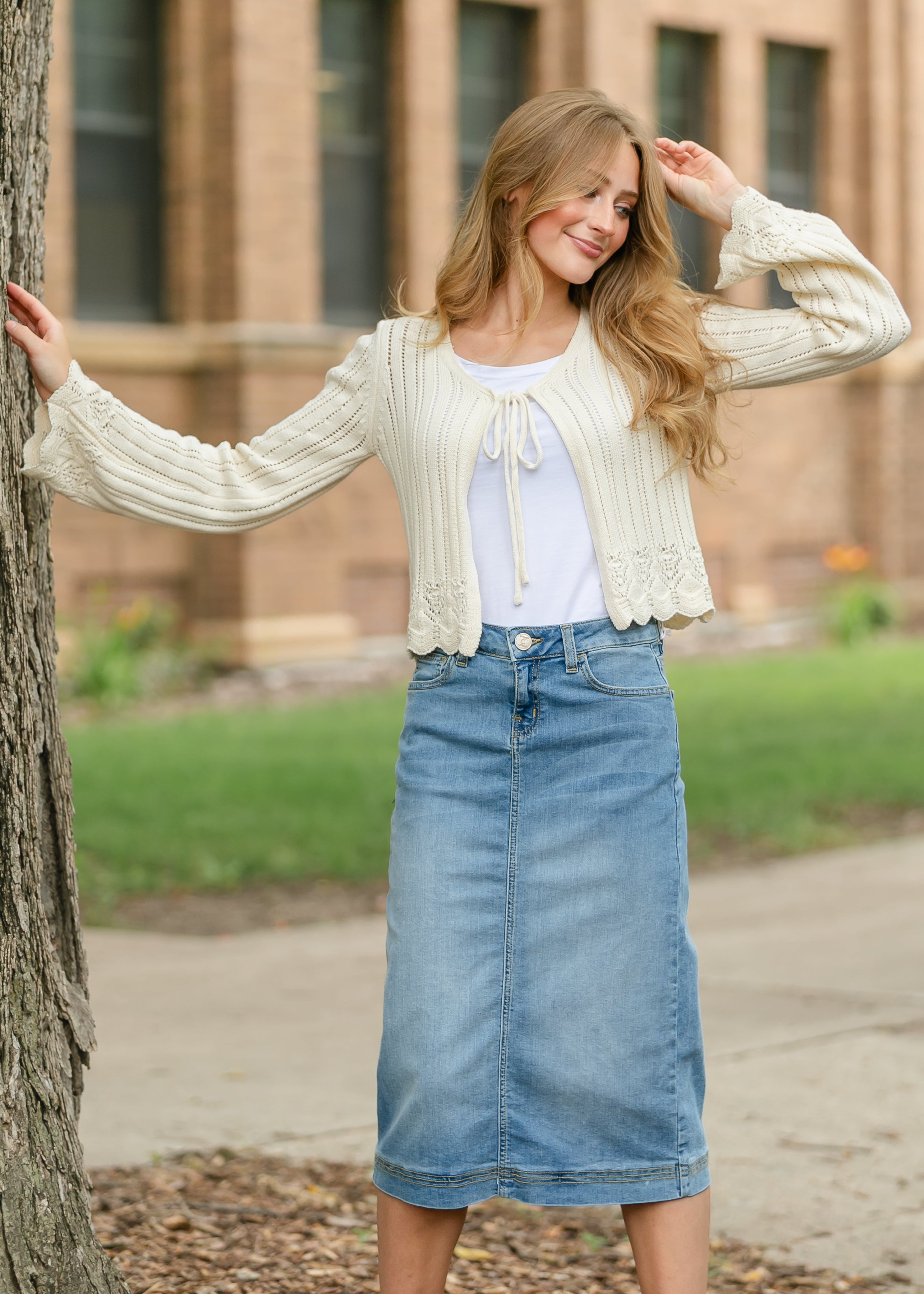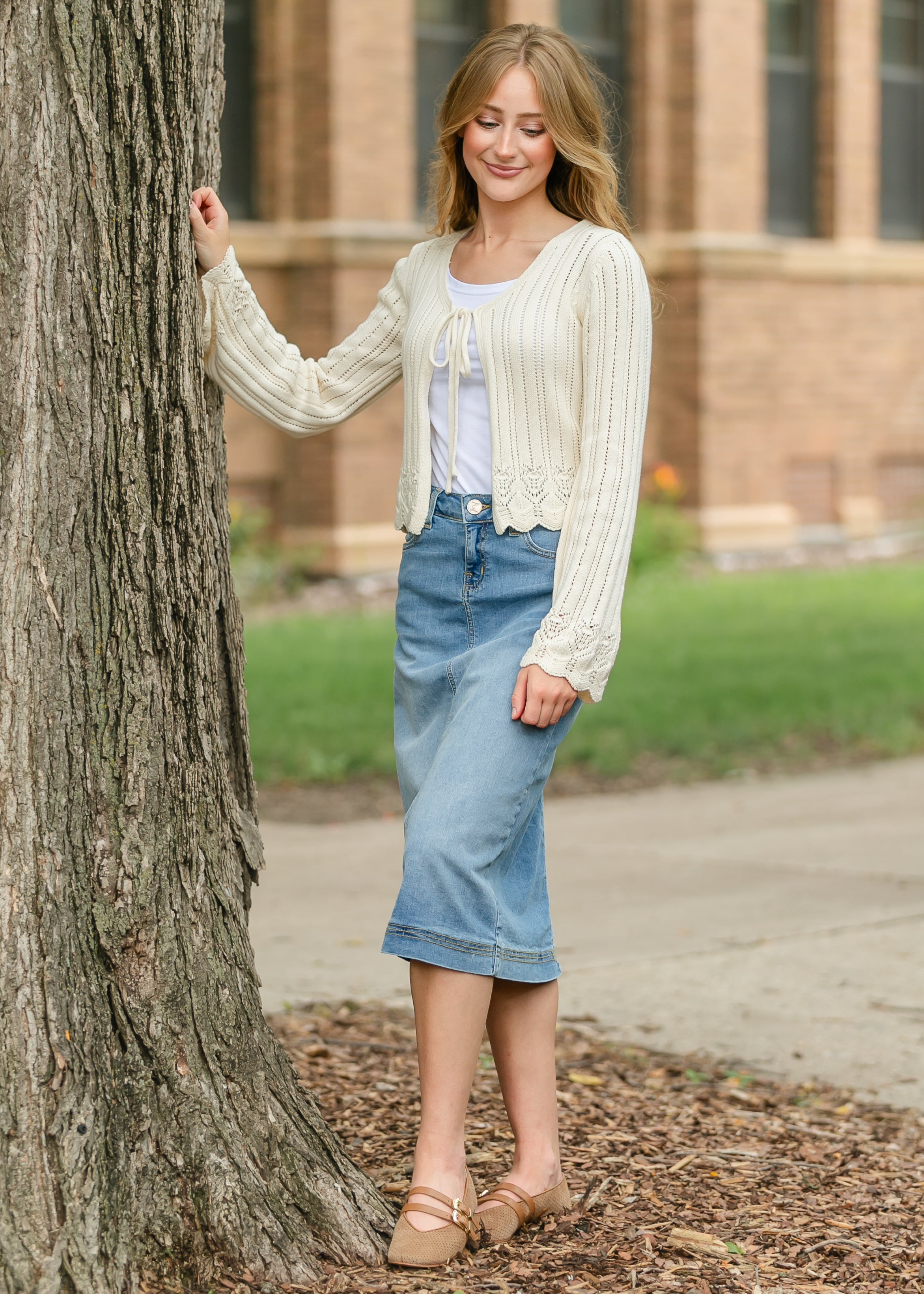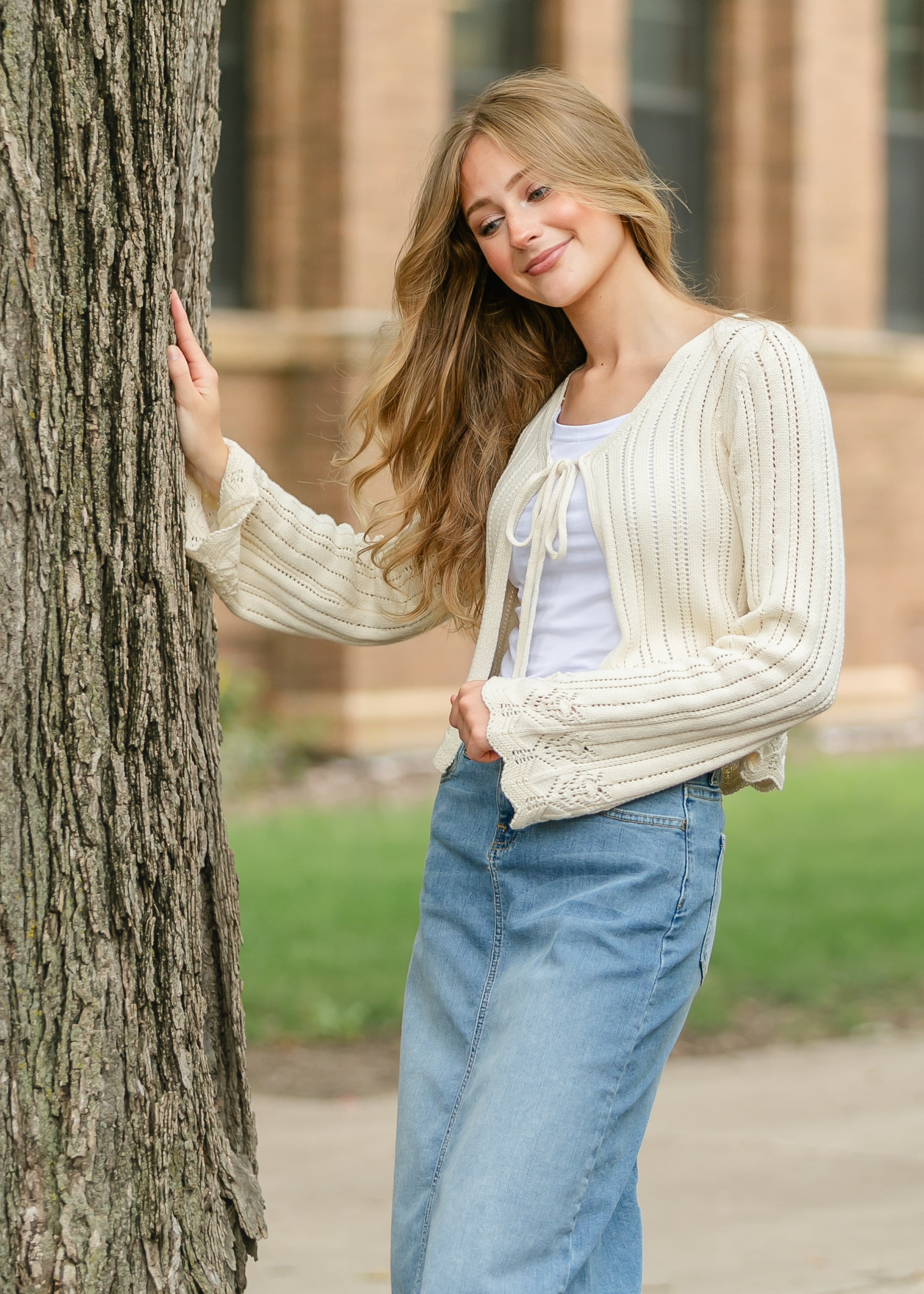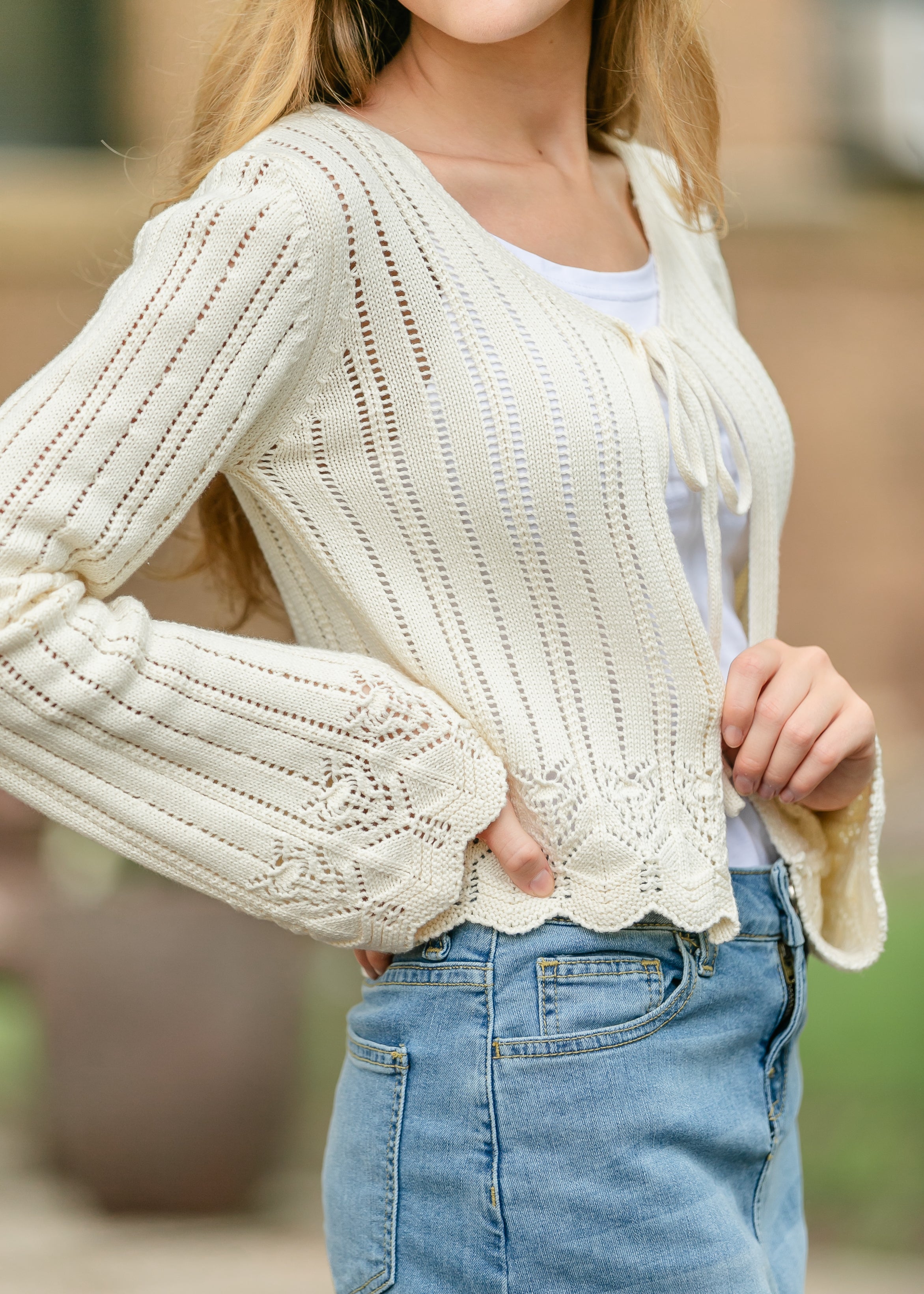 Delicate and beautifully detailed, the Chamomile Front Tie Cardigan is the layer that instantly elevates any look. This open-knit design features a soft tie closure and scalloped hem, bringing a touch of femininity and texture. With its relaxed fit and cozy weight, it’s a timeless piece you’ll reach for on breezy days and gentle evenings alike.