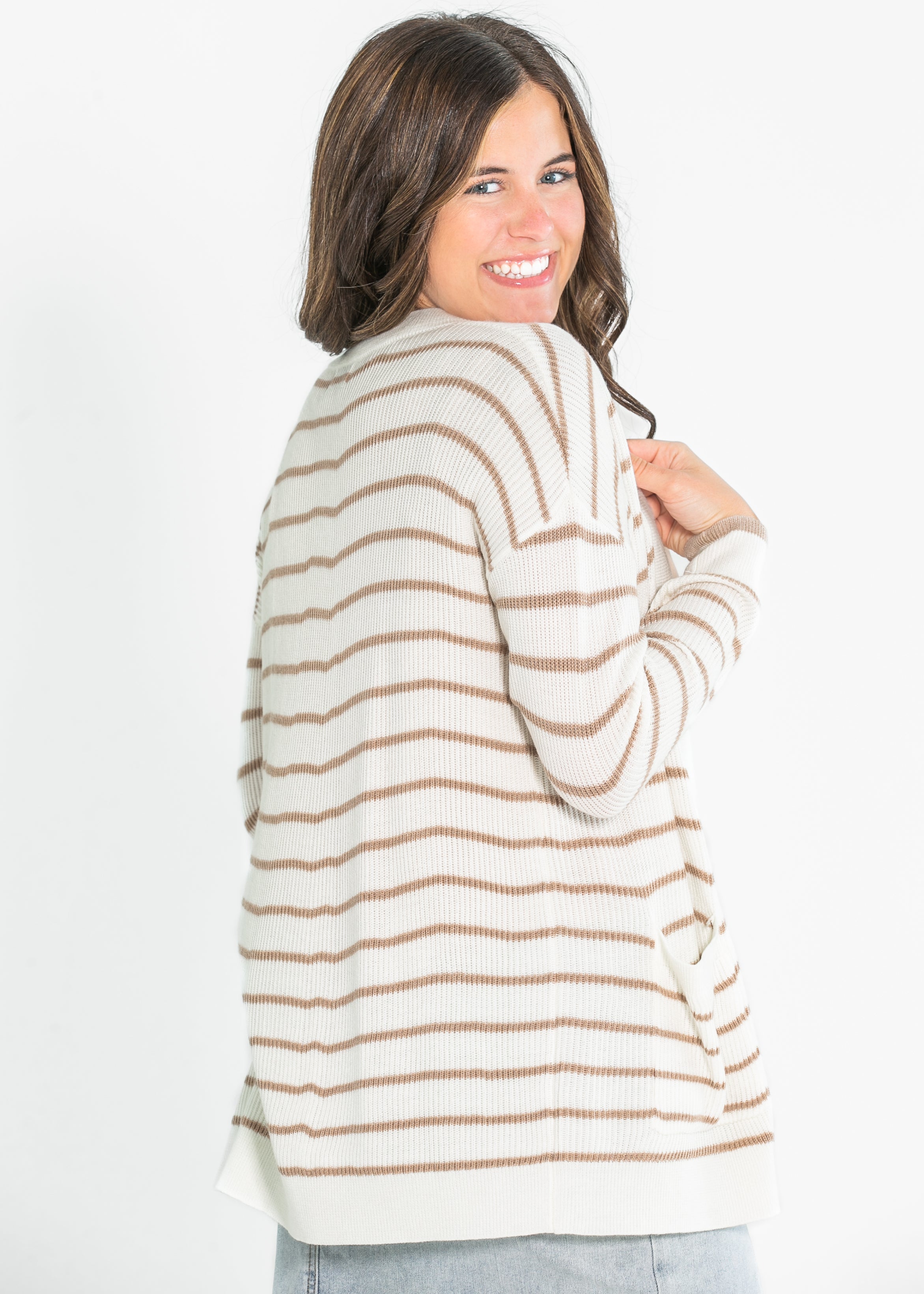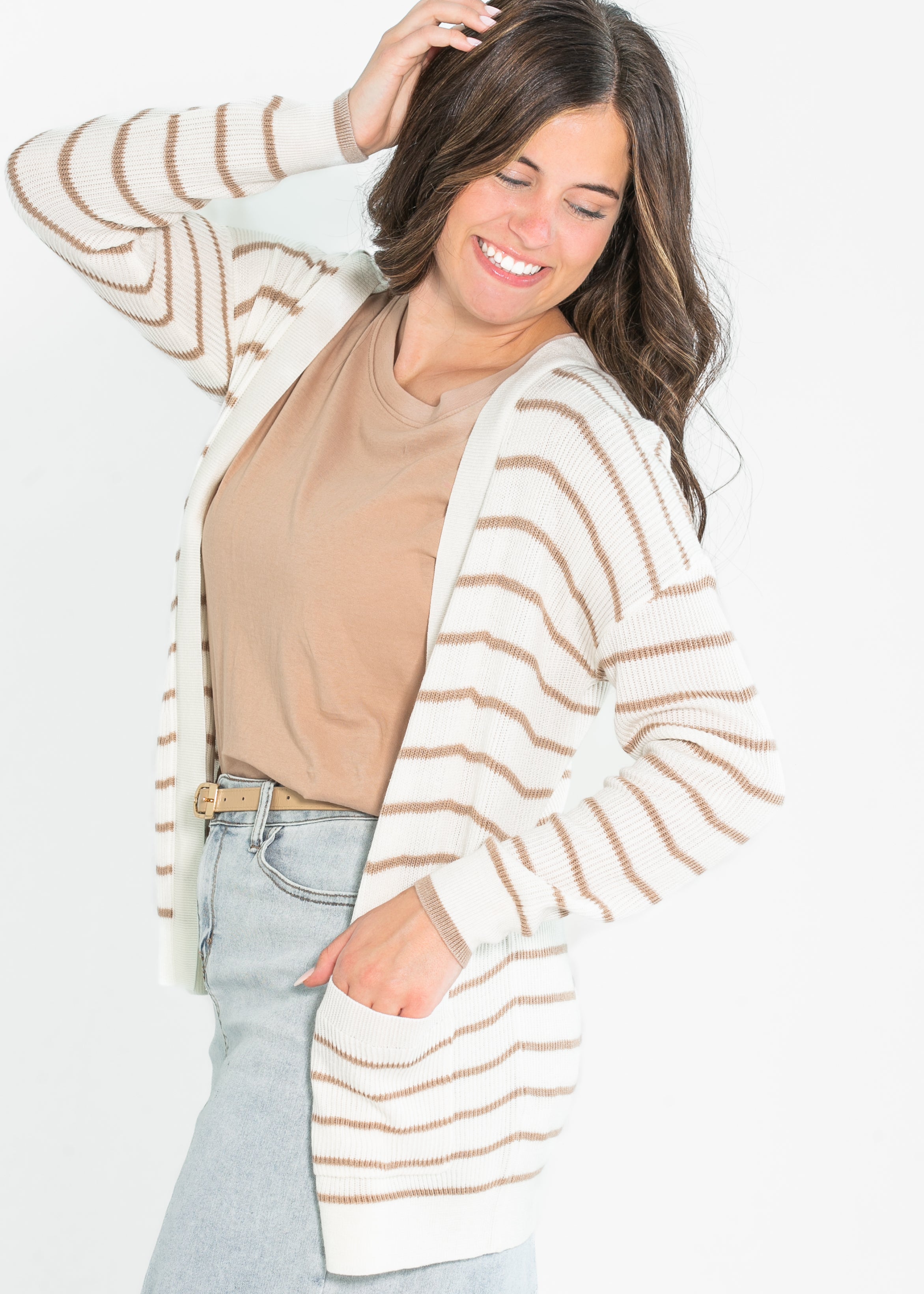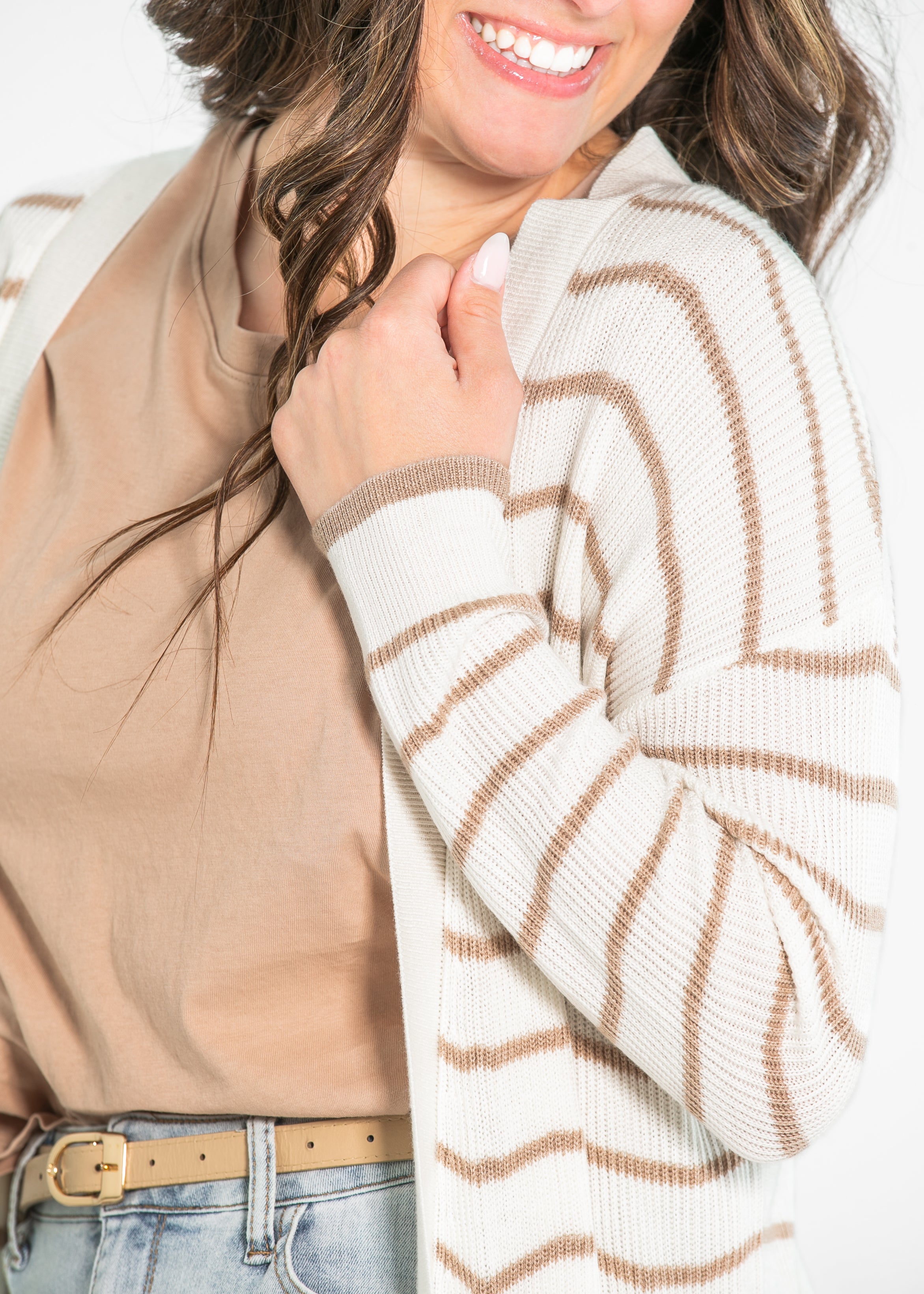 The Classic Knit Striped Cardigan is the cozy layer your closet needs. Designed with timeless taupe stripes on a soft ivory base, this open-front knit features ribbed cuffs, patch pockets, and a flattering longer length. It’s the perfect throw-on-and-go piece for pairing with denim skirts or dresses—bringing comfort and style to every outfit.