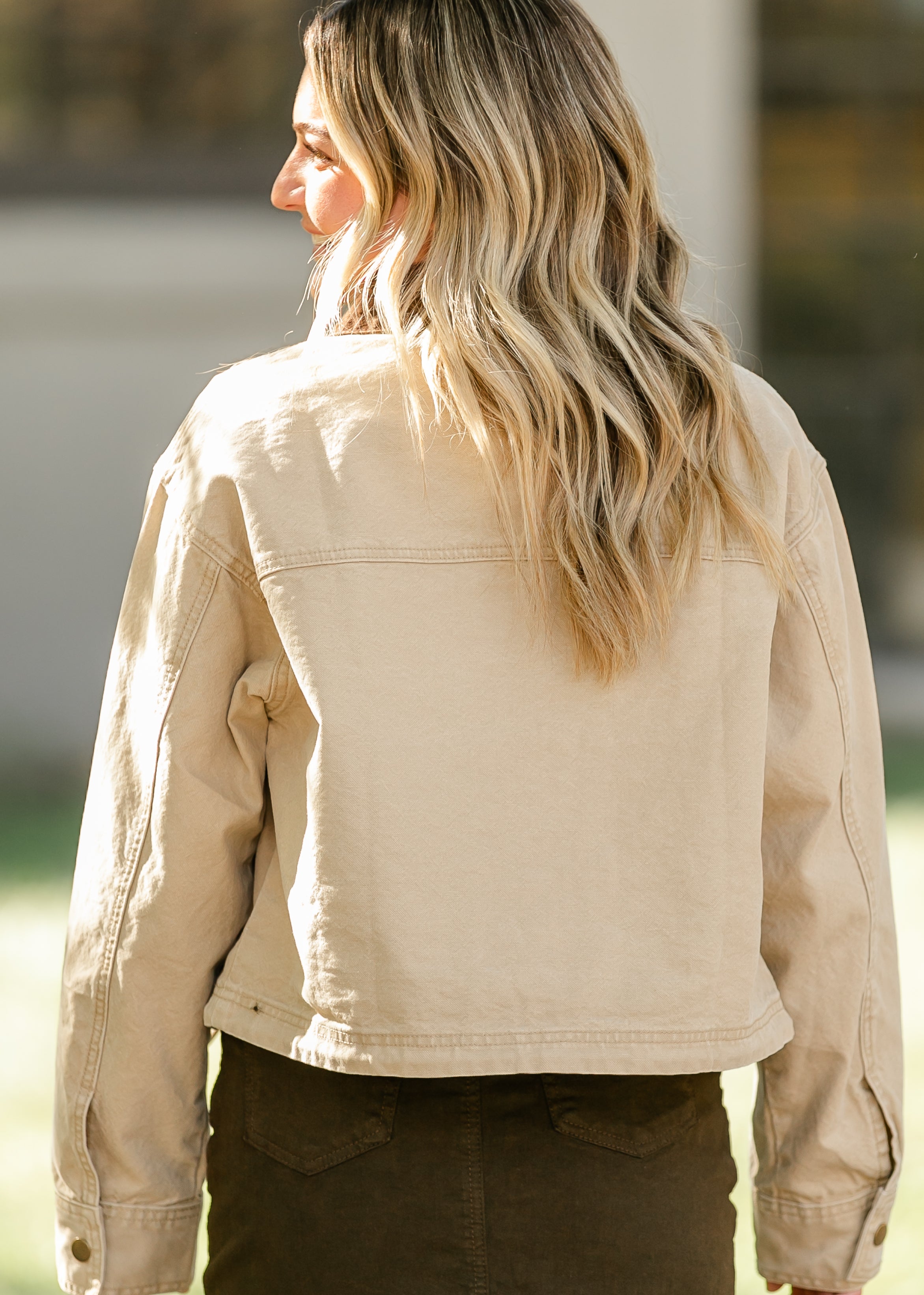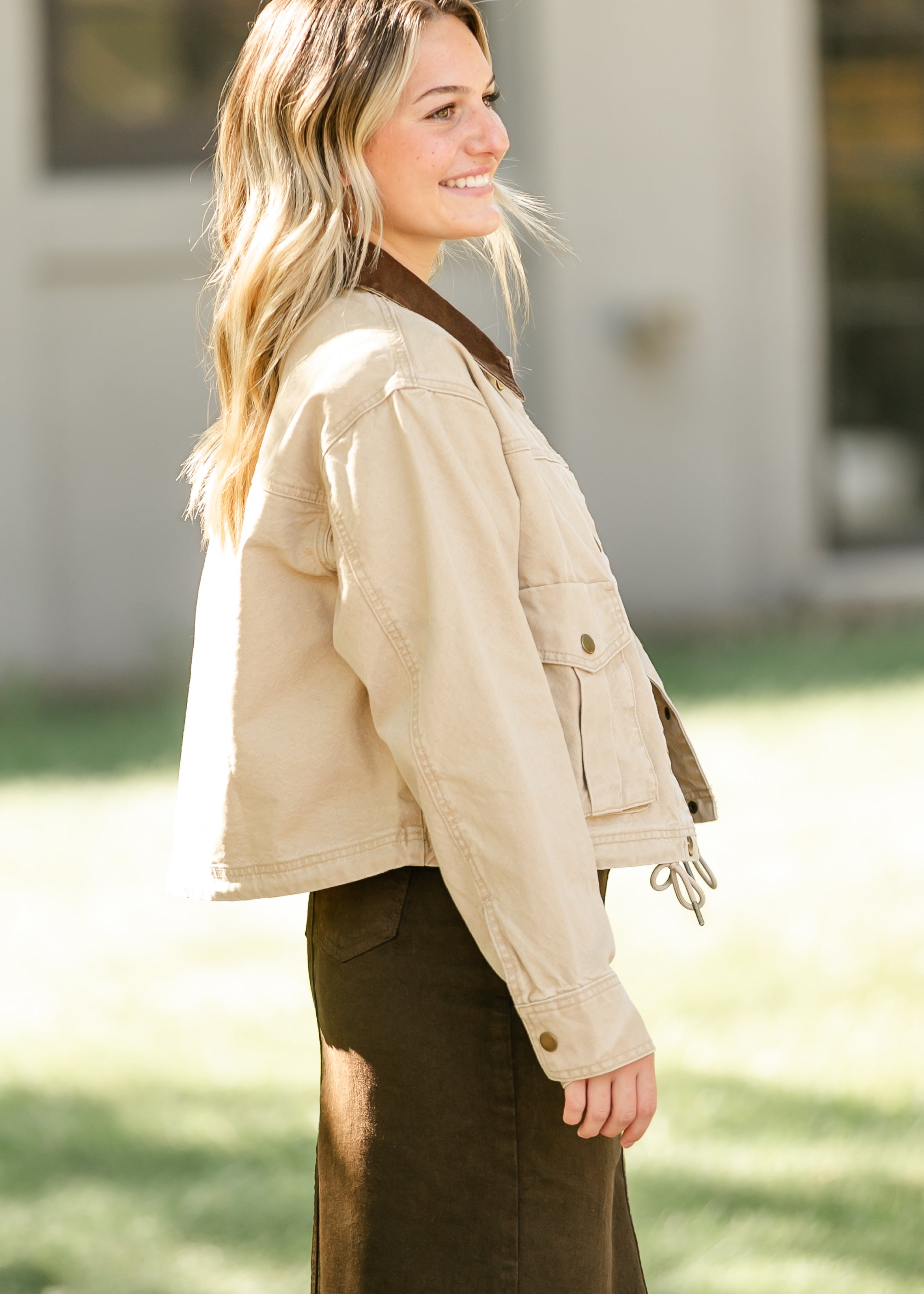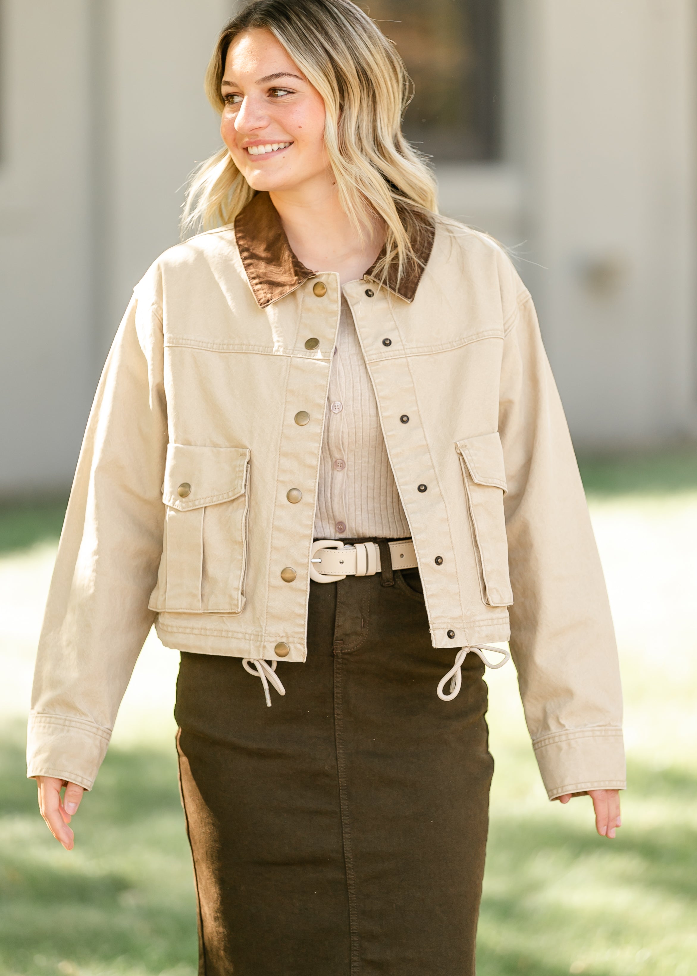 The Contrast Collar Utility Jacket blends casual comfort with modern structure. Crafted from sturdy cotton canvas, it features a rich brown corduroy collar, functional front pockets, and snap-button closures. Adjustable drawstrings at the hem allow for a customizable fit. This versatile jacket layers beautifully over ribbed tops and pairs perfectly with denim or midi skirts for a modest, everyday look.