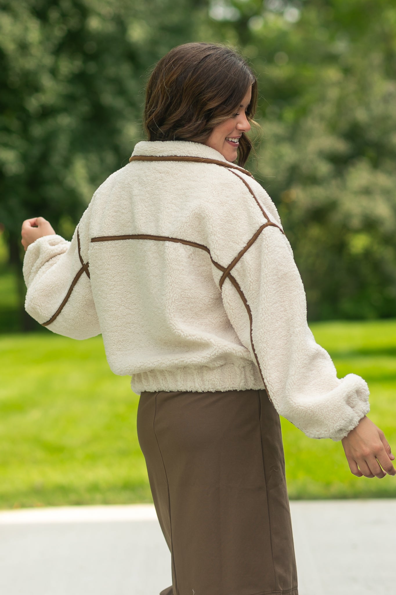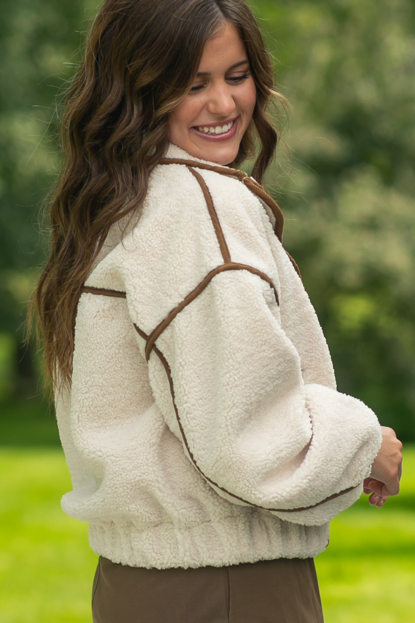 The Elan Fleece Ivory Bomber Jacket is designed with plush fleece for all-day warmth and comfort. It features contrast corduroy trim along the collar, seams, and pockets for a touch of texture, plus a zip and snap front closure to keep out the chill. The elastic hem and cuffs create a relaxed, easy fit while side pockets add practical function.