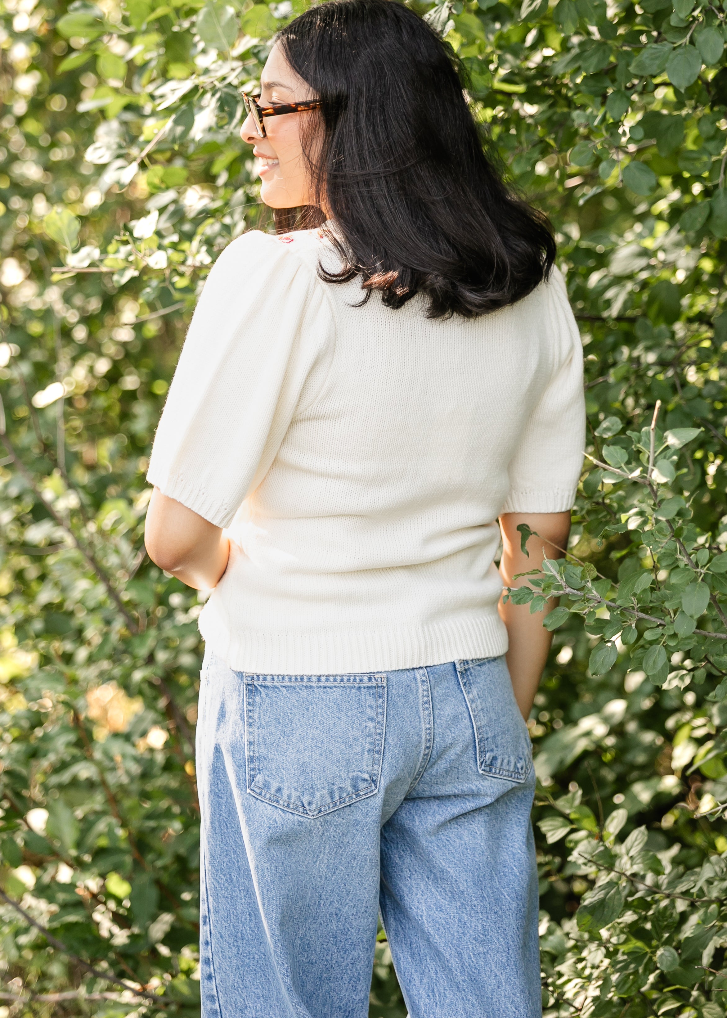 The Embroidered Floral Short Sleeve Sweater brings a soft touch of femininity with its delicate stitched blooms along the front. Crafted in a lightweight knit, it offers a cozy yet breathable feel perfect for changing seasons. Style it effortlessly with a flowy skirt for a romantic look or pair with denim for a fresh and timeless everyday outfit!