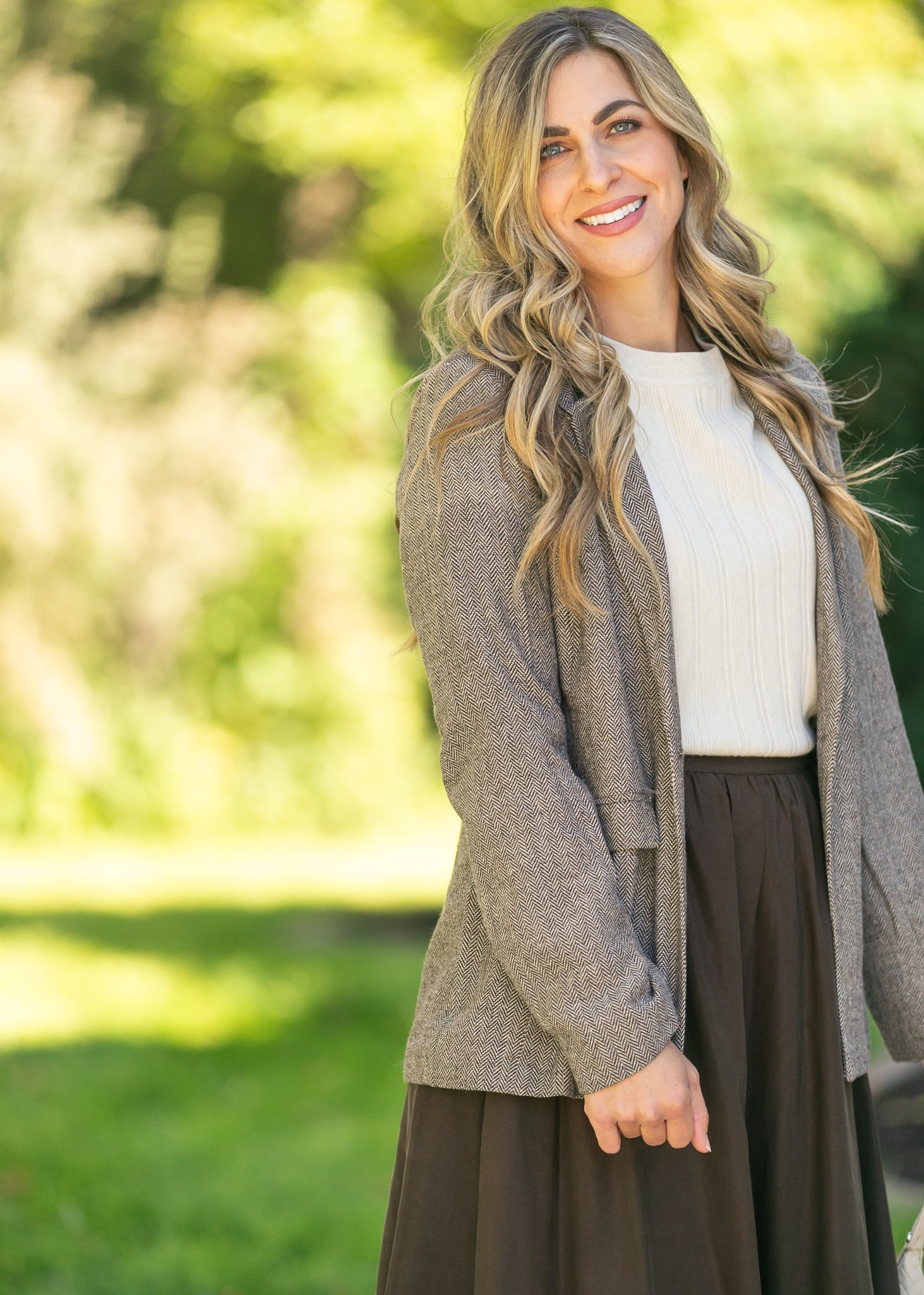 The Herringbone Single Button Blazer is a timeless layering piece with a classic tailored fit. Crafted in a soft neutral herringbone weave, it features front flap pockets, a notched collar, and a single-button closure for a refined finish. This versatile blazer pairs beautifully with skirts or dresses, adding structure and elegance to your everyday or workwear looks.