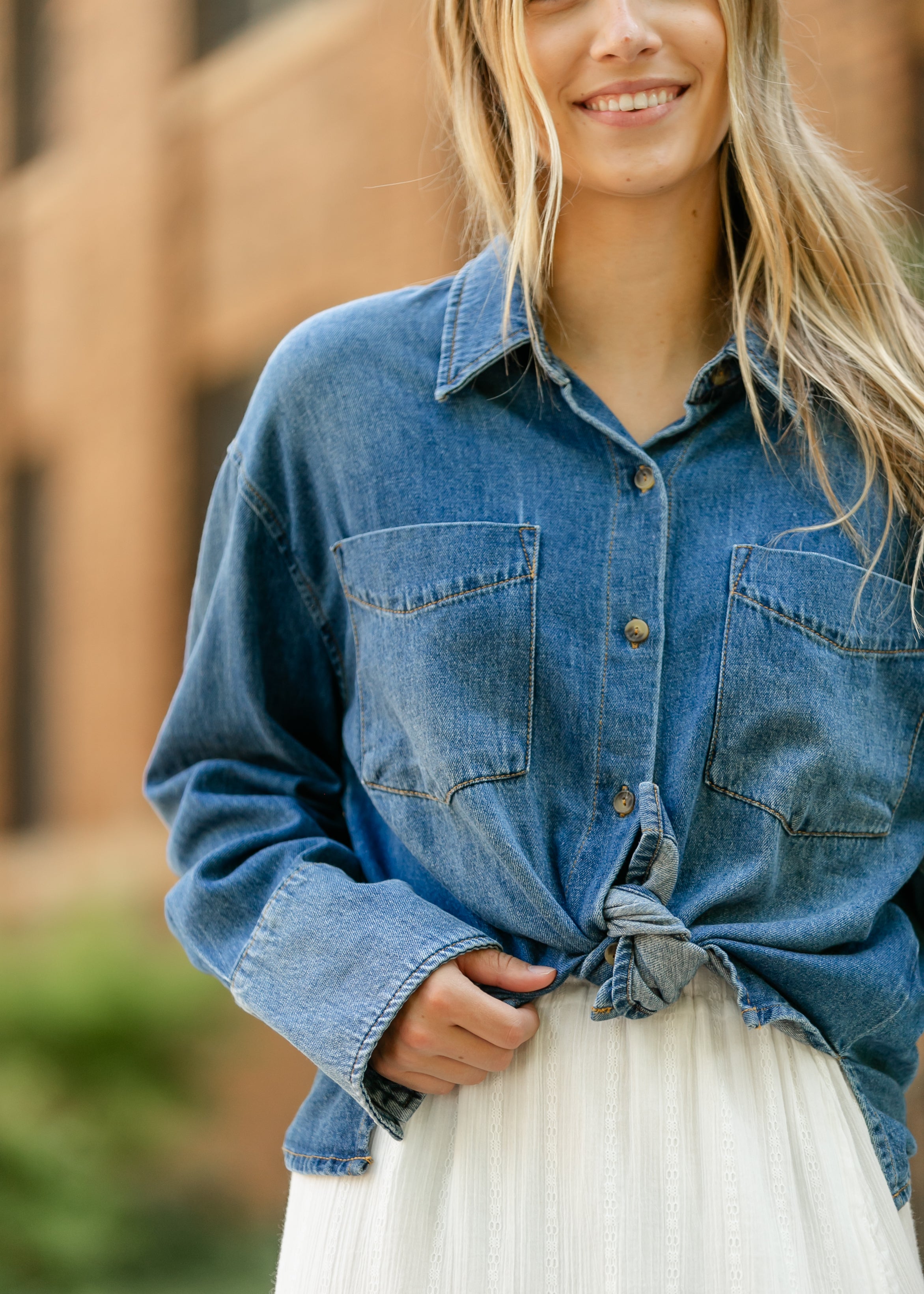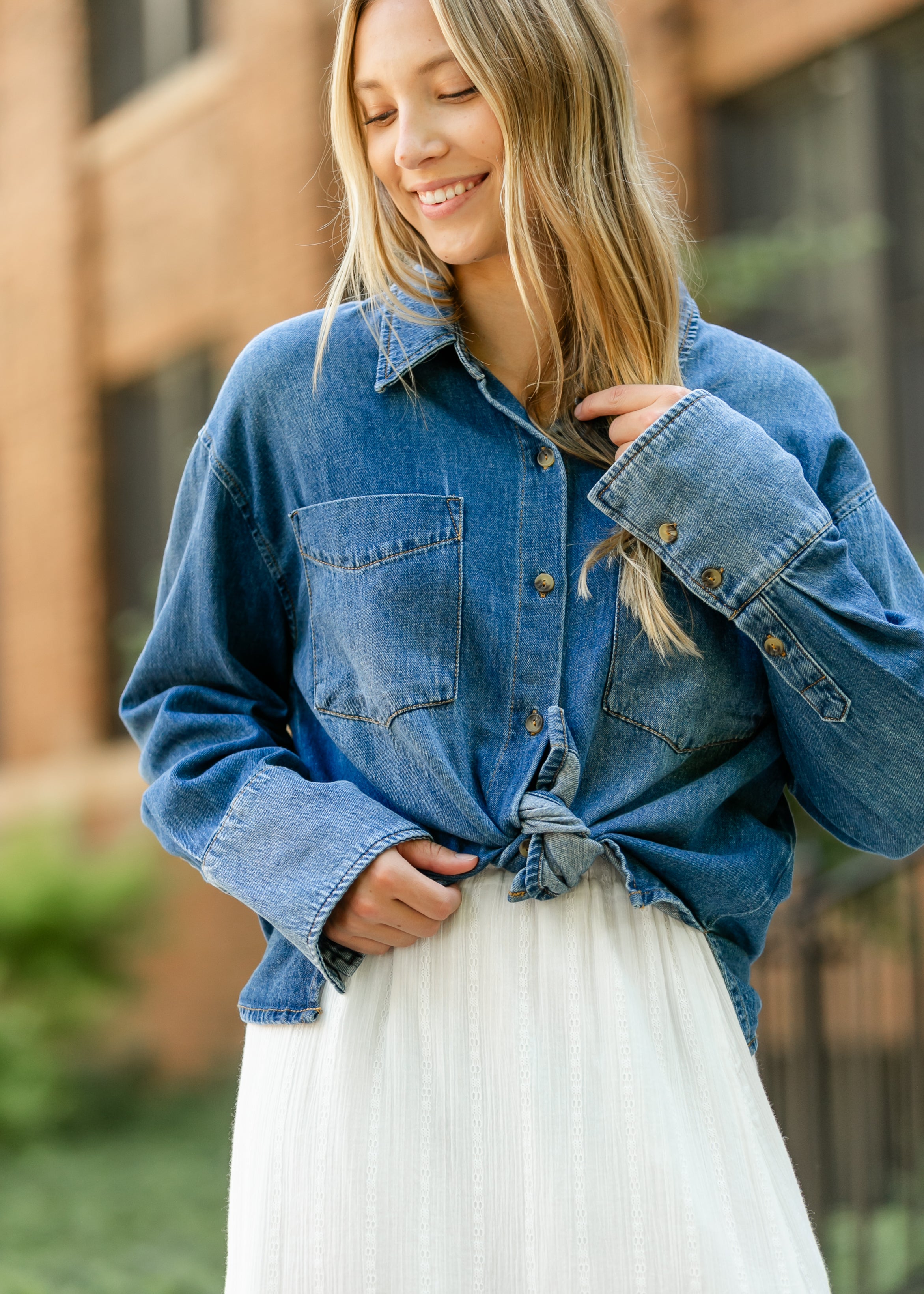 The KUT from the Kloth® Gertie Button Front Top brings vintage denim vibes to your everyday layers. Made from soft, midweight cotton with a relaxed fit, this button-down features chest pockets, cuffed long sleeves, and a classic collar. Whether tied at the waist or worn open, it’s an effortlessly cool staple with timeless versatility!