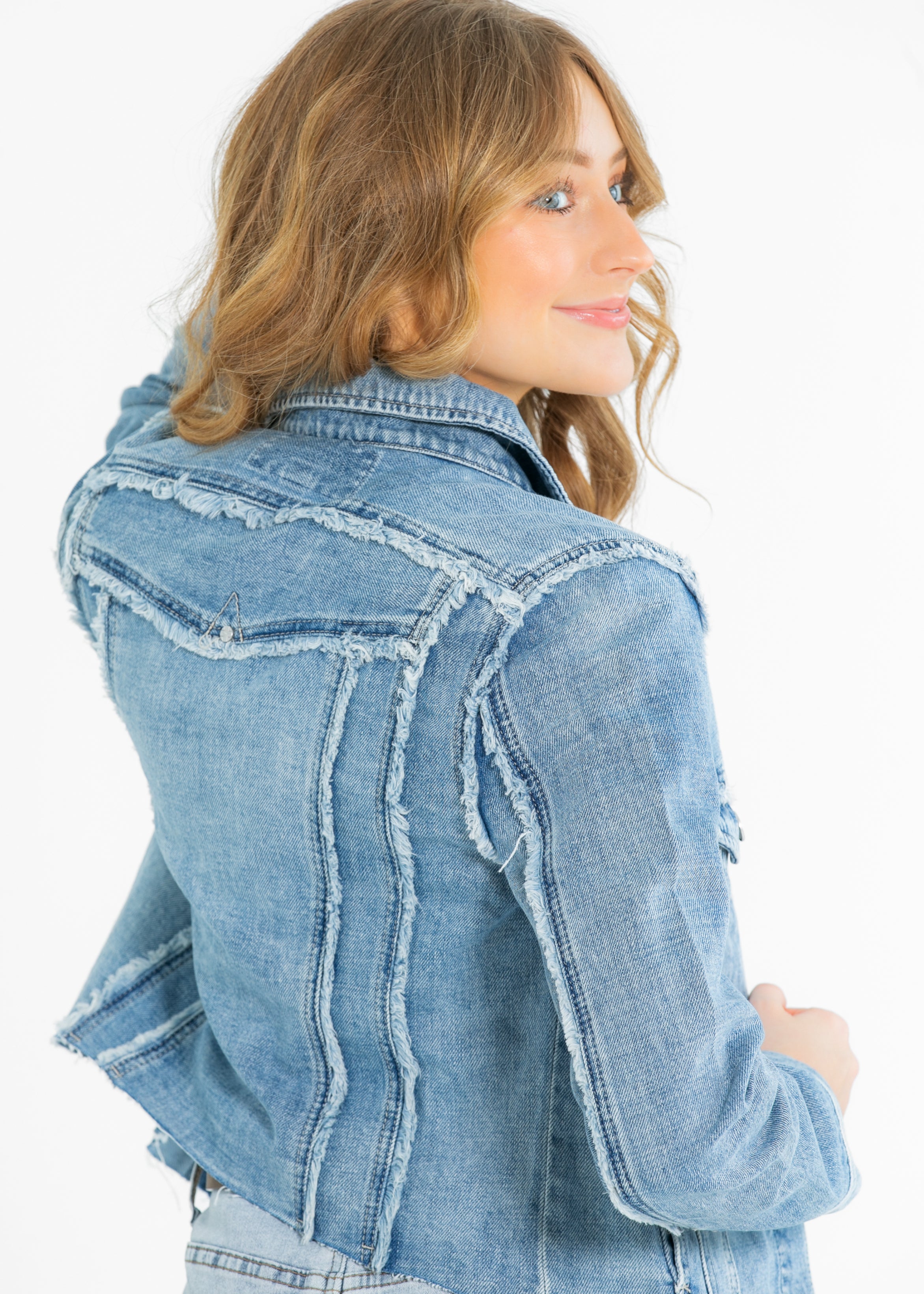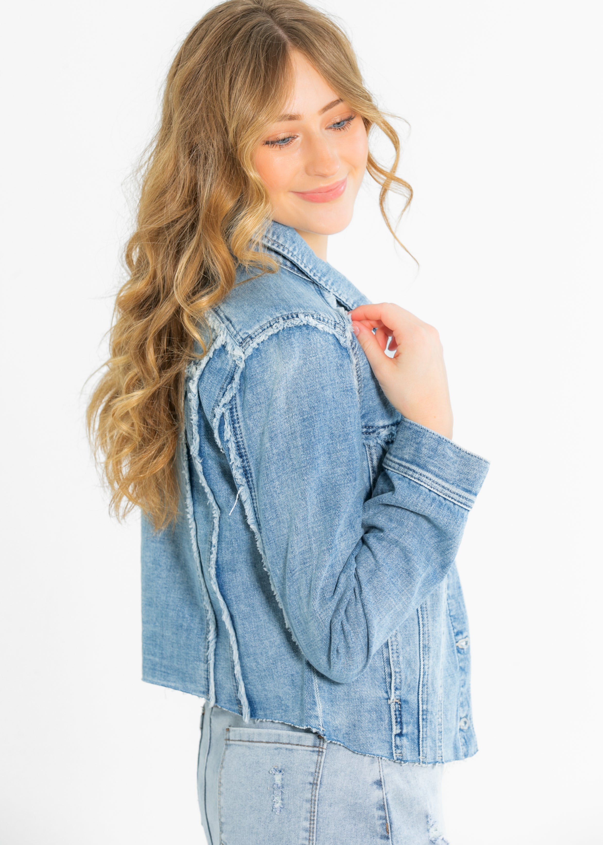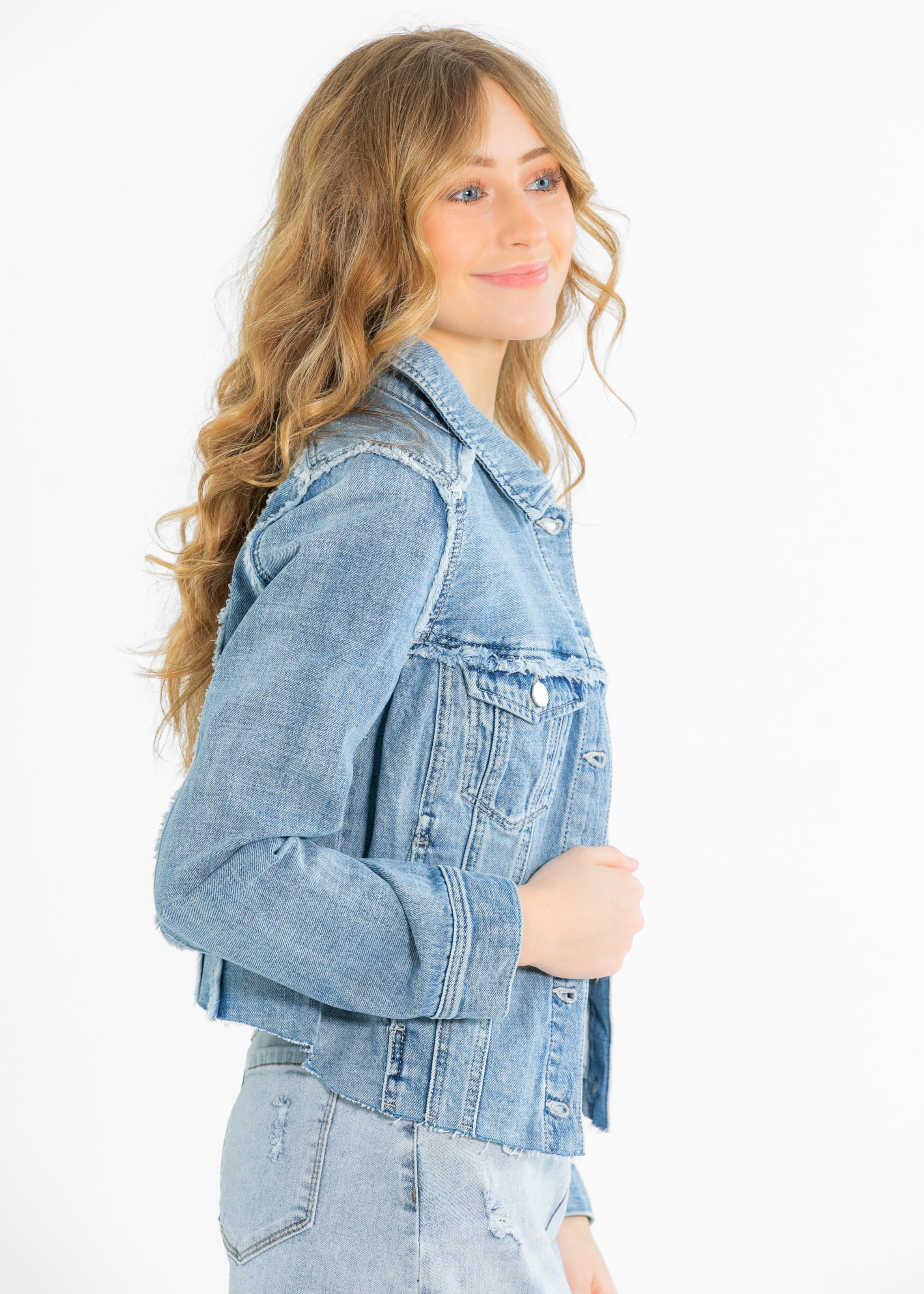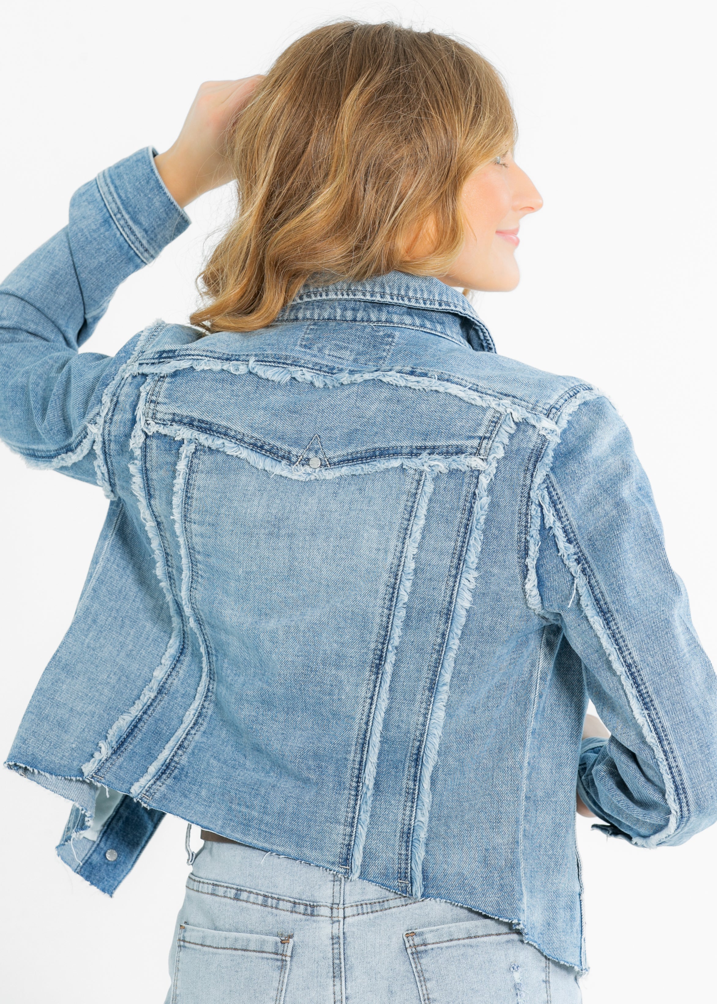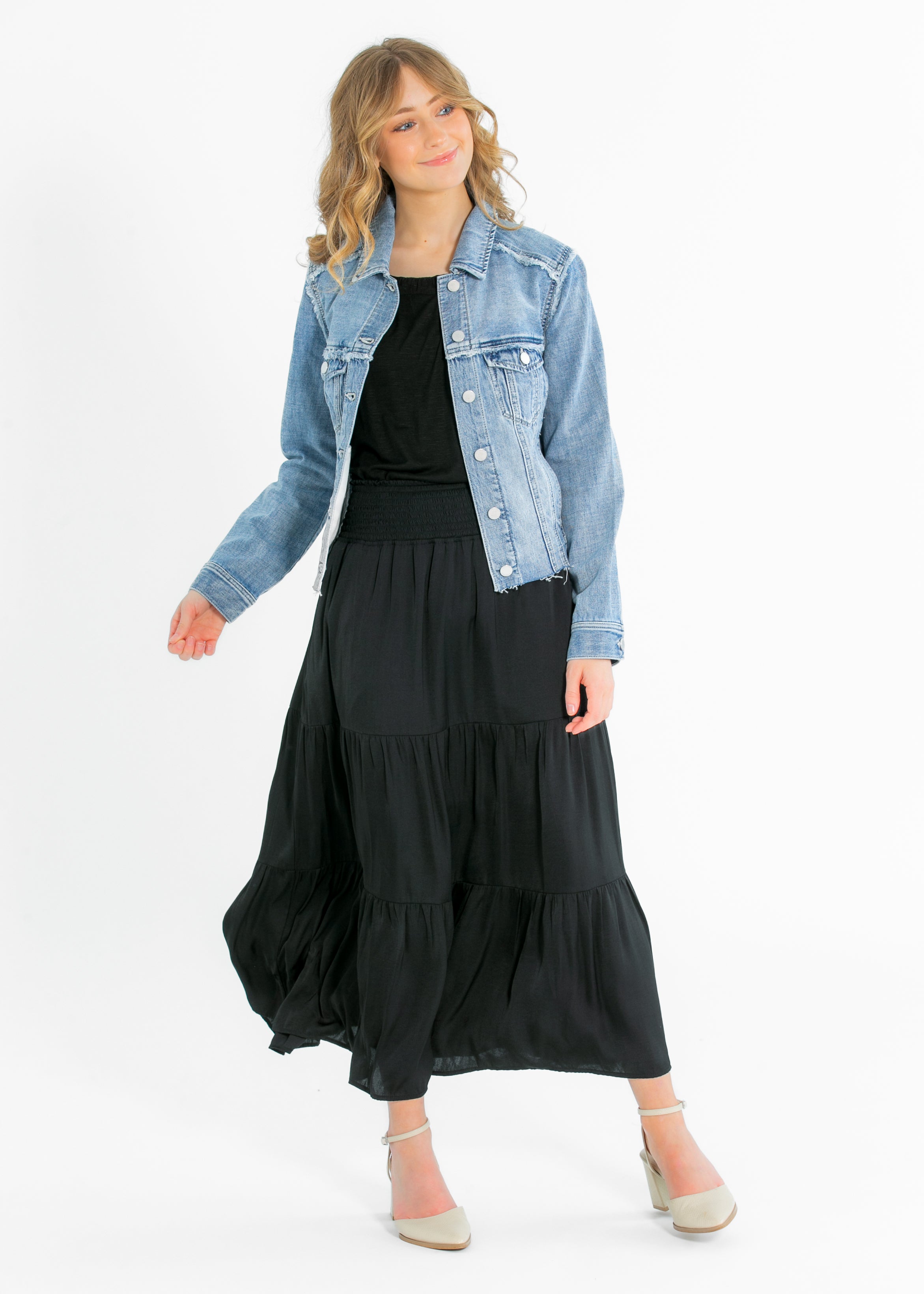 The Liverpool® Multi Fray Trucker Denim Jacket brings a playful twist to a classic. Designed with modest charm, it features textured frayed seams, silver buttons, and a flattering structured fit. Layer it over your favorite dress or tee for an effortless, elevated look. A must-have transitional piece for your timeless, modest wardrobe!