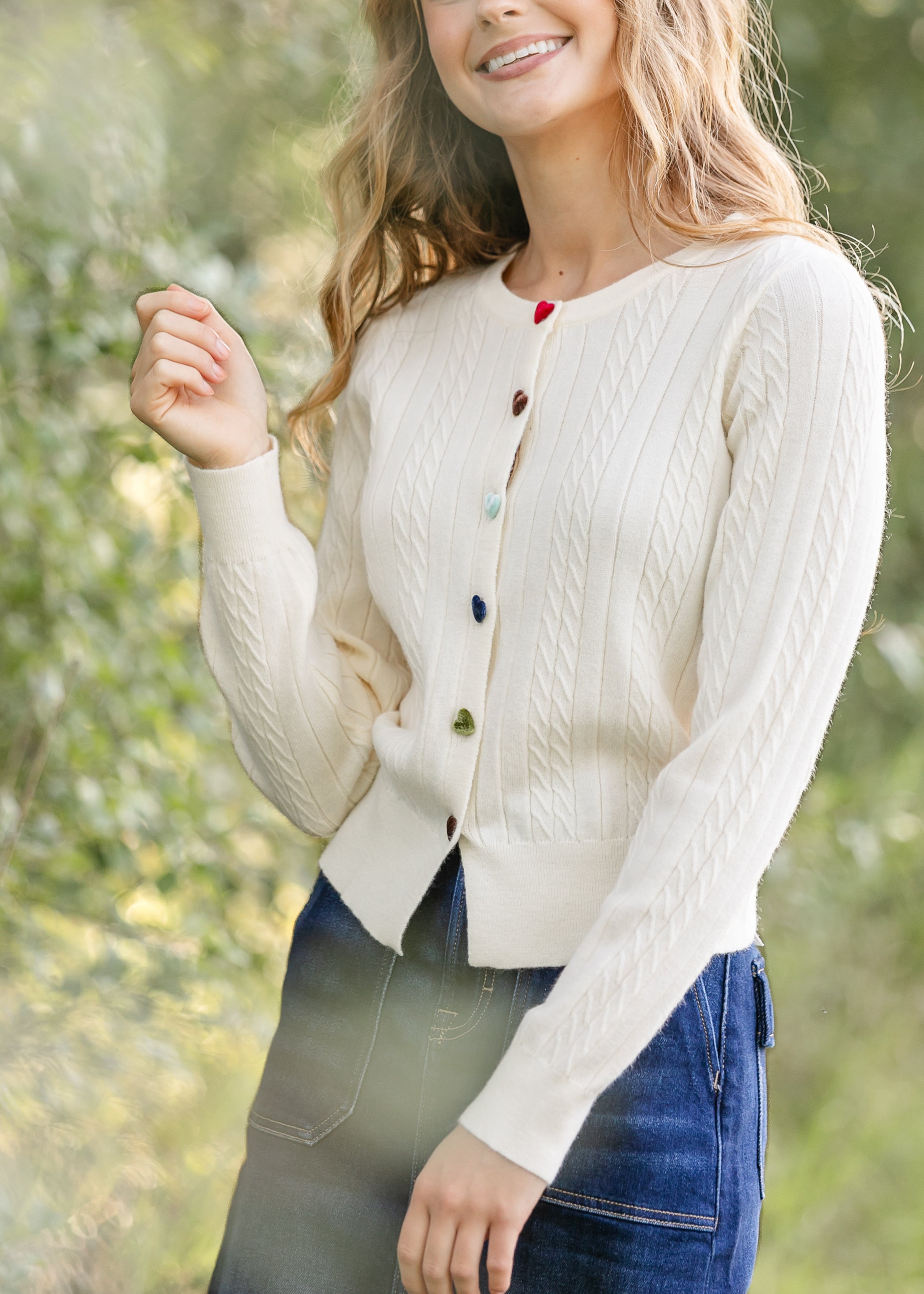 Soft and sweet, the Mochi Heart Button Cardigan adds a touch of whimsy to everyday wear. Its ivory knit is detailed with colorful heart-shaped buttons that bring a playful finish to a timeless silhouette. Style it buttoned with a denim skirt for a polished look, or layer over a flowy dress for a cozy, feminine touch!