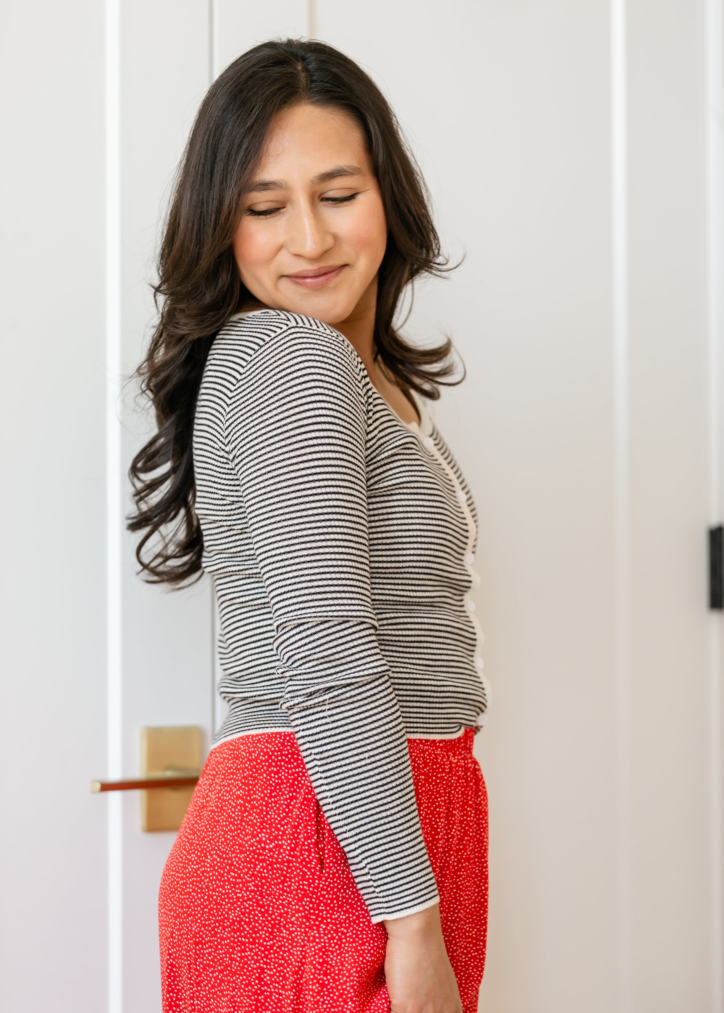 The Prepster Buttoned Striped Cardigan brings a playful twist to a timeless staple with its mini black-and-white stripe pattern and contrast scalloped trim. Featuring a fitted silhouette, scoop neckline, and functional buttons, this lightweight knit adds a polished layer to your look while keeping things casual and cute for everyday wear!