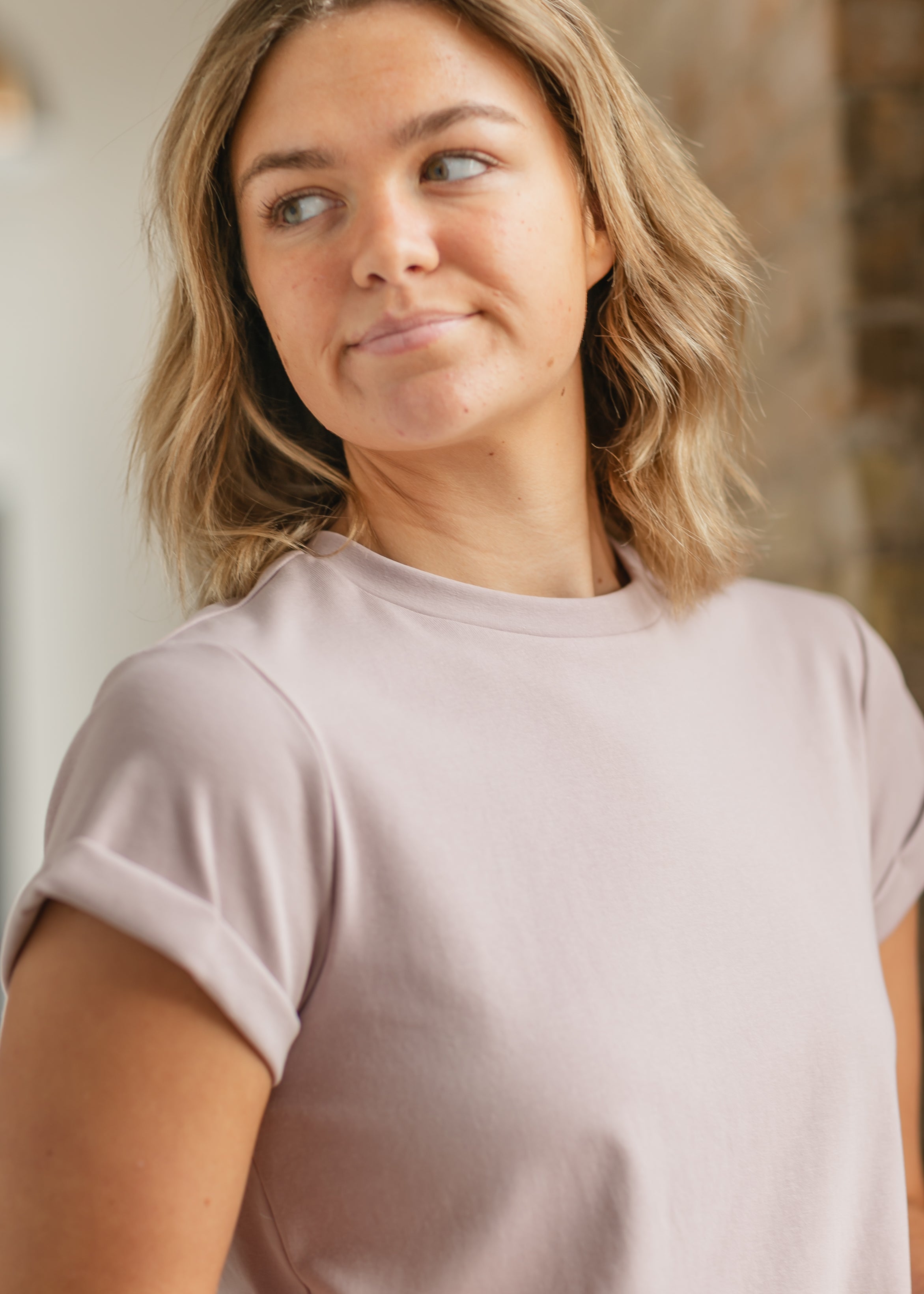 The Short Sleeve Essential Basic Tee is an Inherit Design that requires NO layering! This elevated top is designed in a feminine fit with a round bottom hem. The bottom hem in the back is 2" longer than the one in the front for added coverage! You'll feel comfortable wearing this solo, as it is not tight, or layered with your favorite denim jacket or cardigan! The rolled sleeves add a touch of detail to finish off this must-have tee!