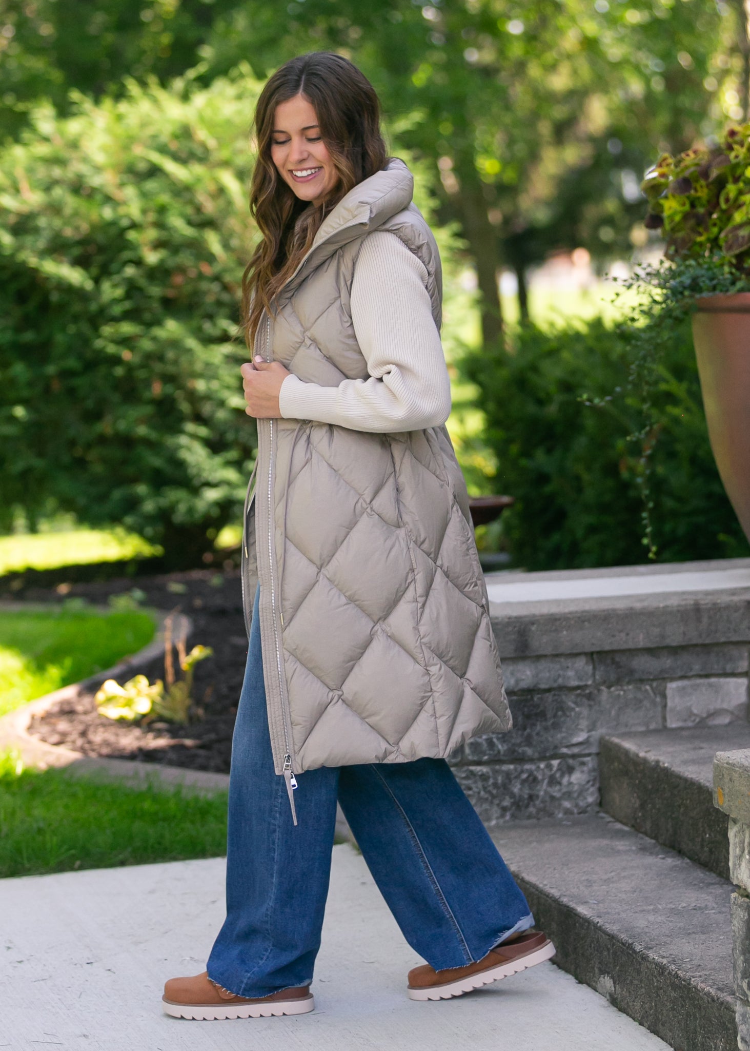 The Varley® Navine Long Down Gilet is crafted for cozy layering with an elegant, elongated silhouette. Featuring a quilted finish, adjustable waist, and high collar, it offers both warmth and refinement for cooler days. Perfect over a knit top with denim or styled with a flowy skirt, this versatile piece makes a modest yet elevated addition to your seasonal wardrobe.