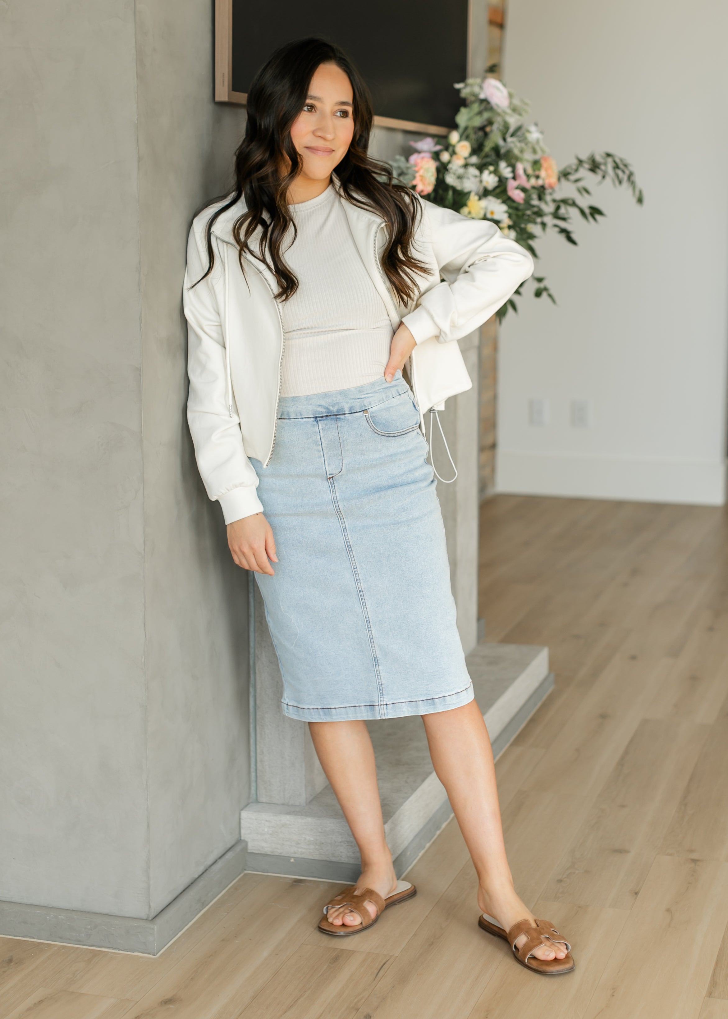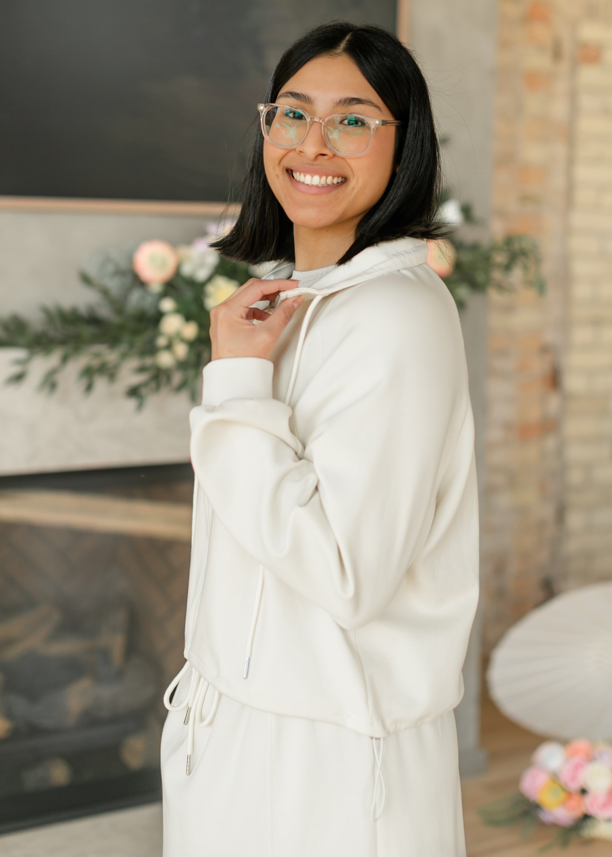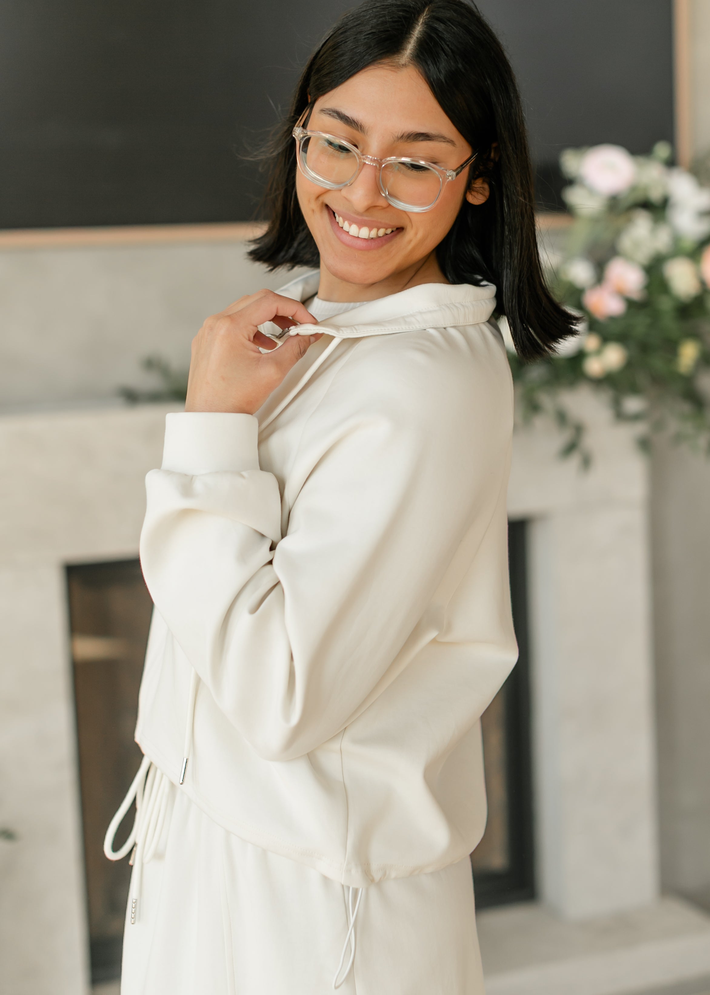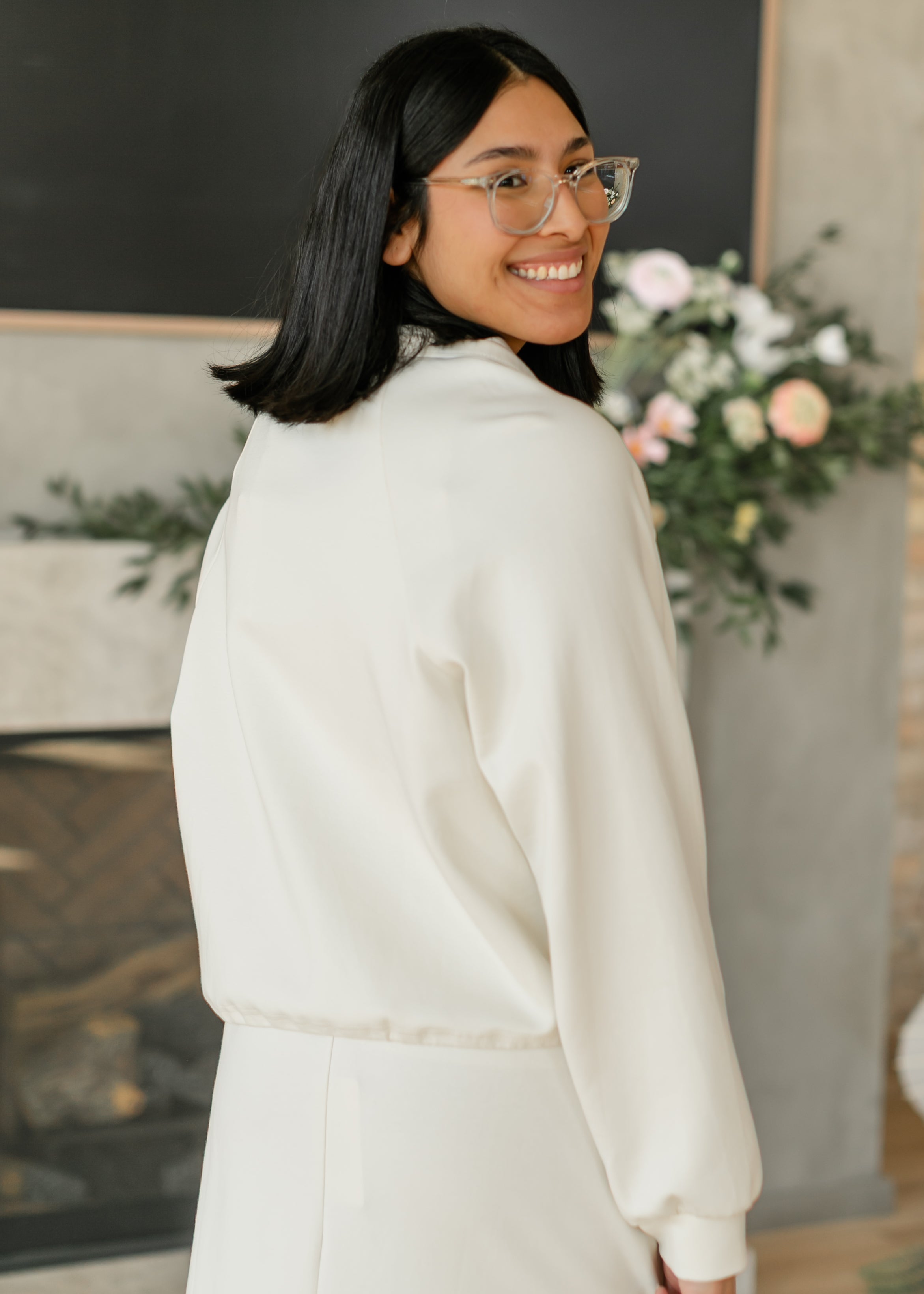 Stay cozy and stylish in the Zip-up Drawstring Waist Sweatshirt Jacket! Designed for both comfort and versatility, this modest sweatshirt jacket features a sleek zip-up front and drawstring waist and hem, allowing you to customize the fit for a flattering silhouette. The mock neck and long sleeves provide extra warmth, making it a go-to layering piece for transitional weather. Crafted from soft, high-quality fabric, this jacket is perfect for casual outings, weekend errands, or cozy evenings in. Its neutral ivory hue ensures easy pairing with your favorite modest wardrobe staples. Wear it with the matching skirt for a coordinated, effortless look or dress it up with denim and sneakers for a chic, laid-back vibe. Whether you're staying in or stepping out, this jacket is a must-have for stylish, everyday layering!