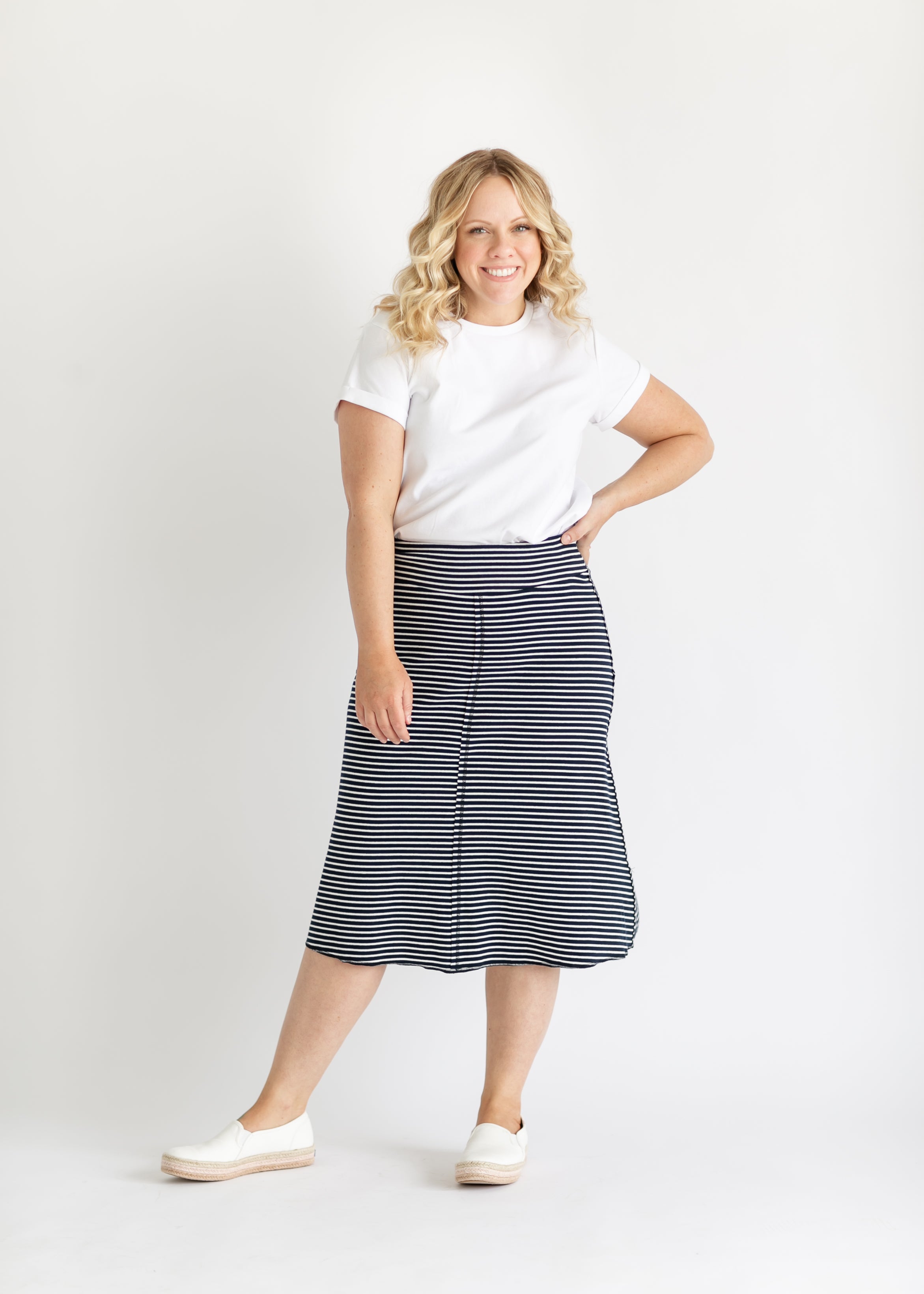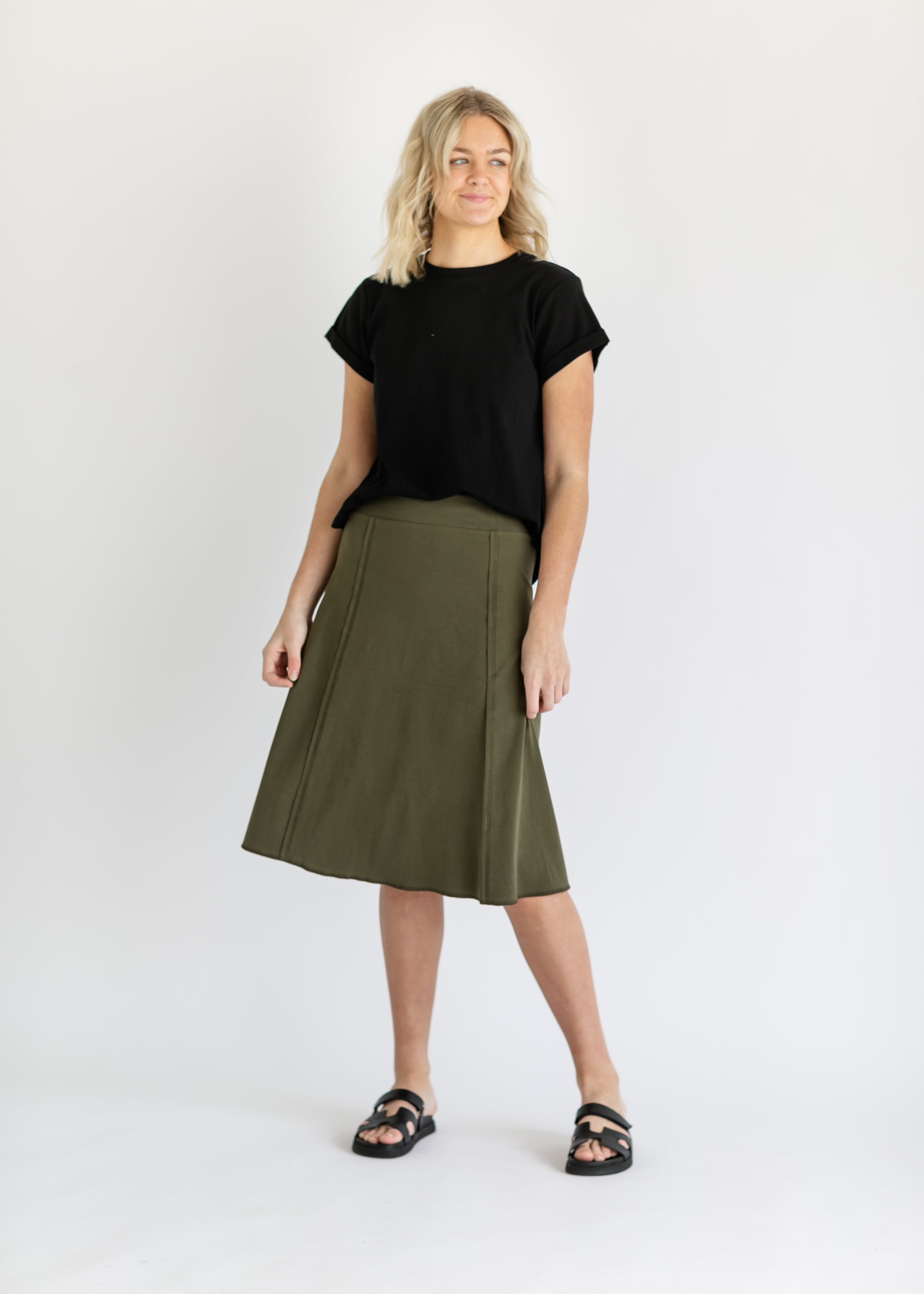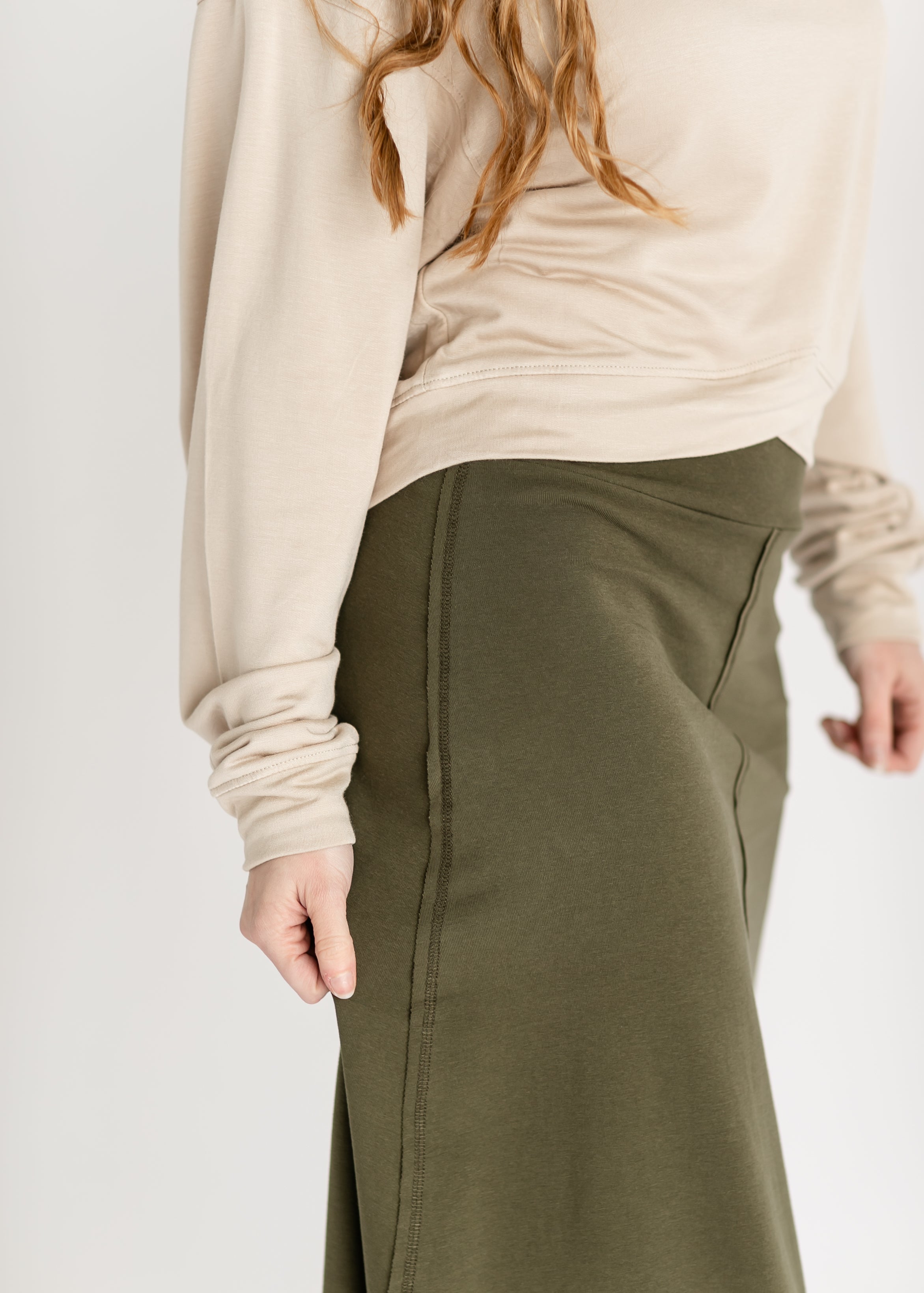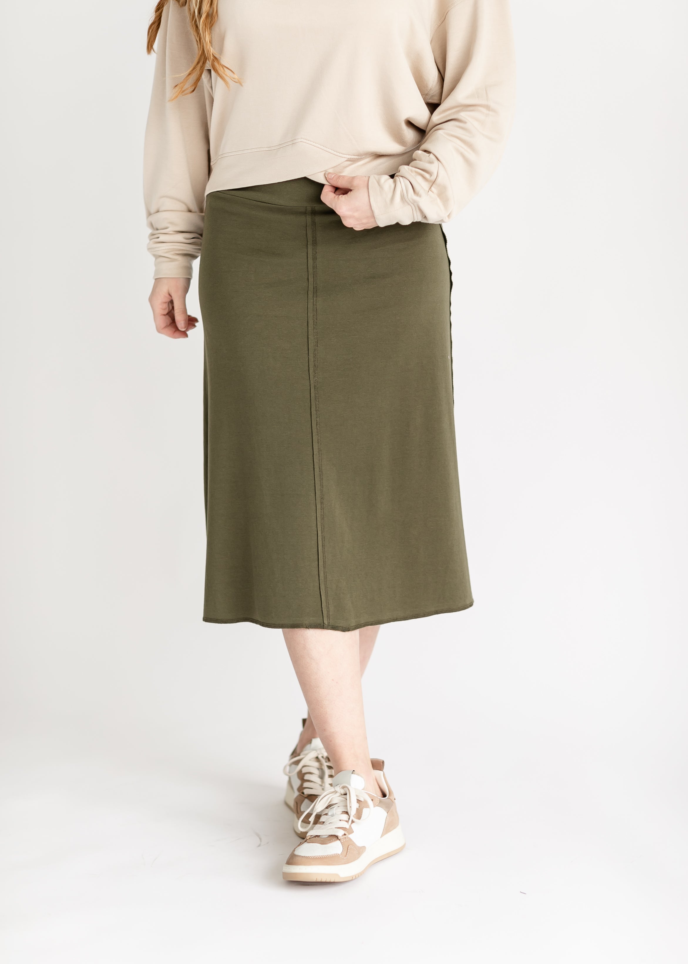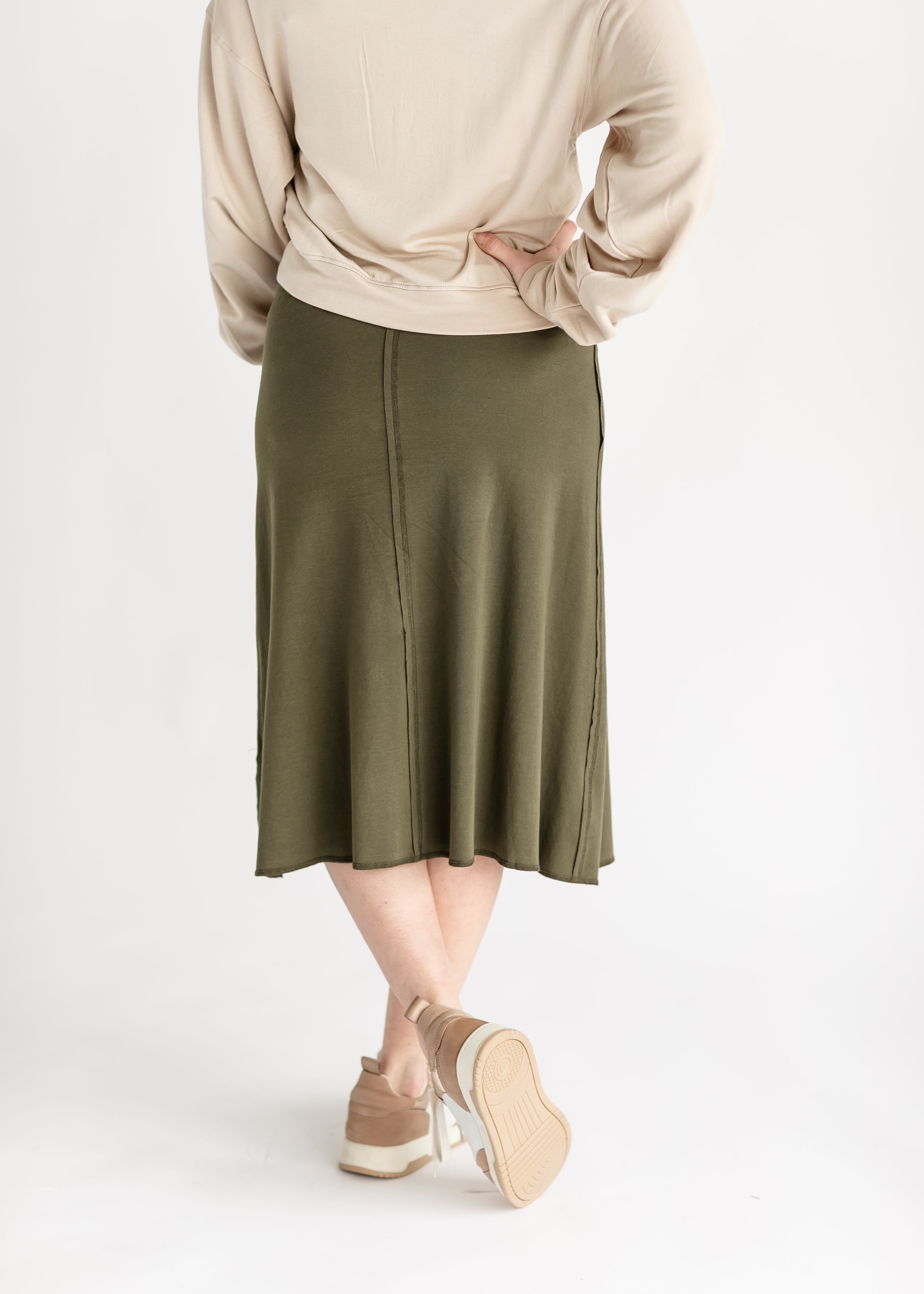 The Allie Knit Midi Skirt is an Inherit Designed made with you in mind. There are raw edge seam details running down the skirt with a finished bottom hem. It is tailored in an a-line fit with a wide, stretch waistband that will keep you comfortable! As you're walking, the skirt will effortlessly flow with you! This skirt has great stretch so you can do all the things while feeling feminine and confident in your outfit!