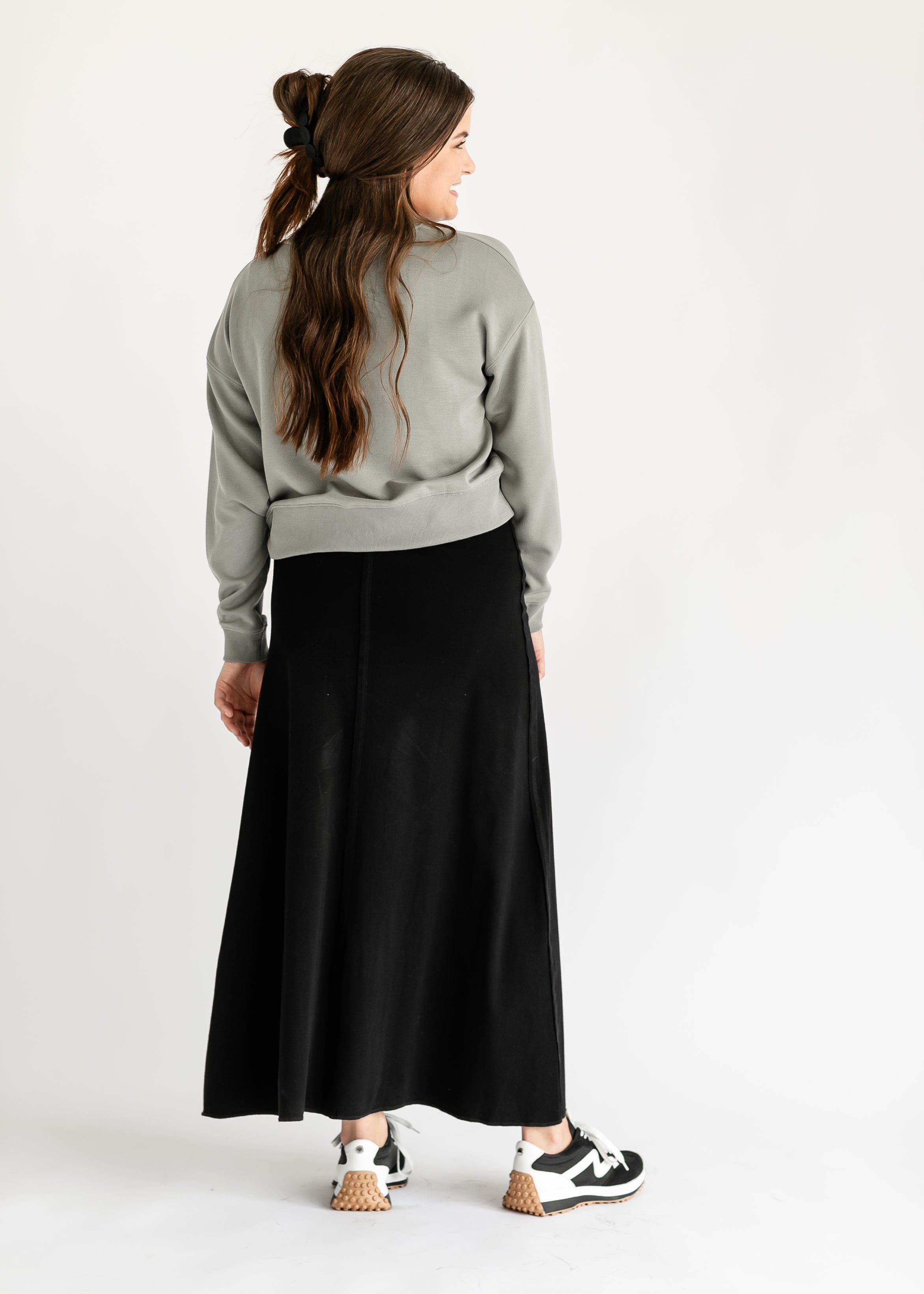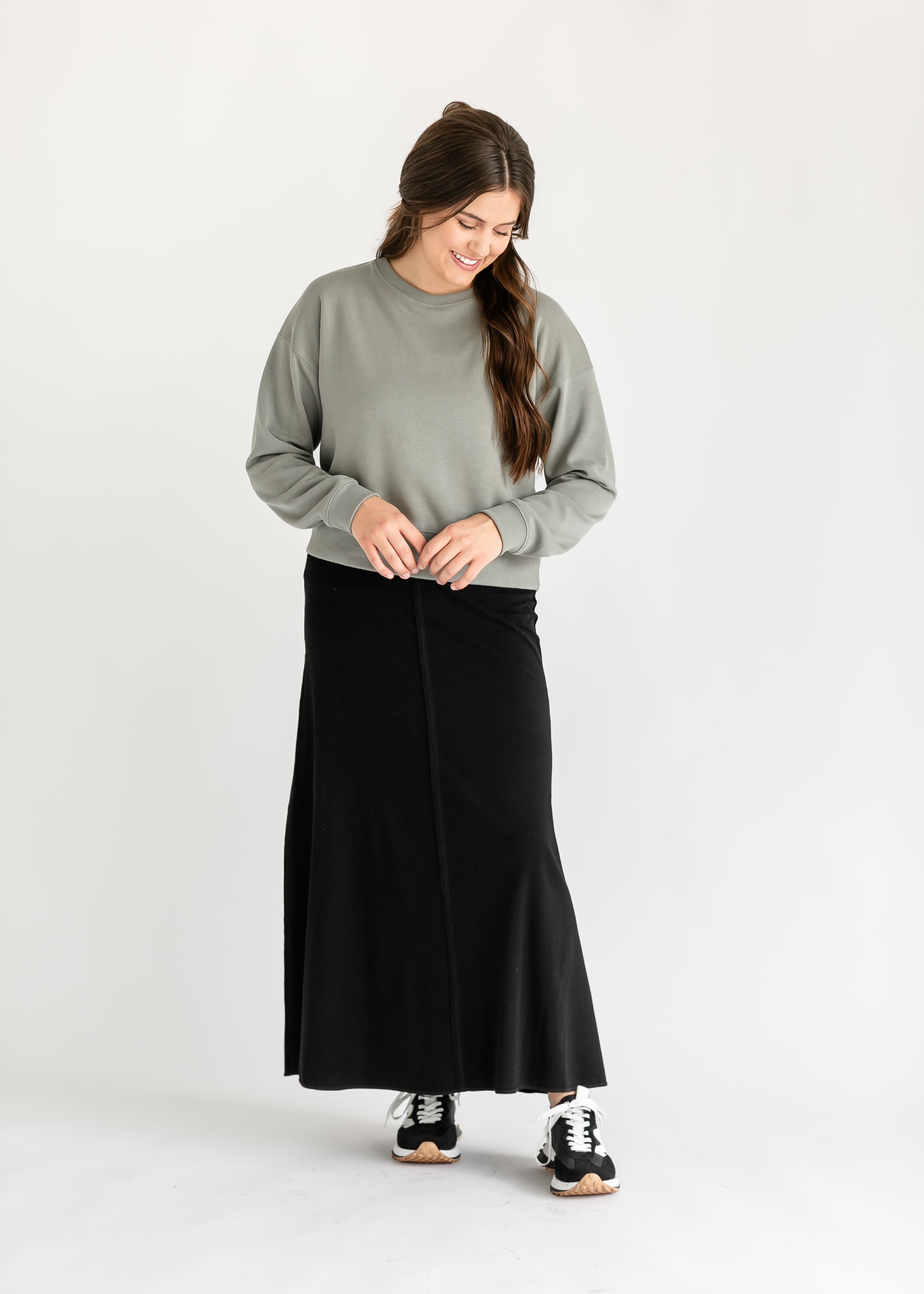 The Allison Knit Maxi Skirt is an Inherit Design made with you in mind. There are raw edge seam details running down the skirt with a finished bottom hem. It is tailored in an a-line fit with a wide, stretch waistband that will keep you comfortable! As you're walking, the skirt will effortlessly flow with you! This skirt has great stretch so you can do all the things while feeling feminine and confident in your outfit!