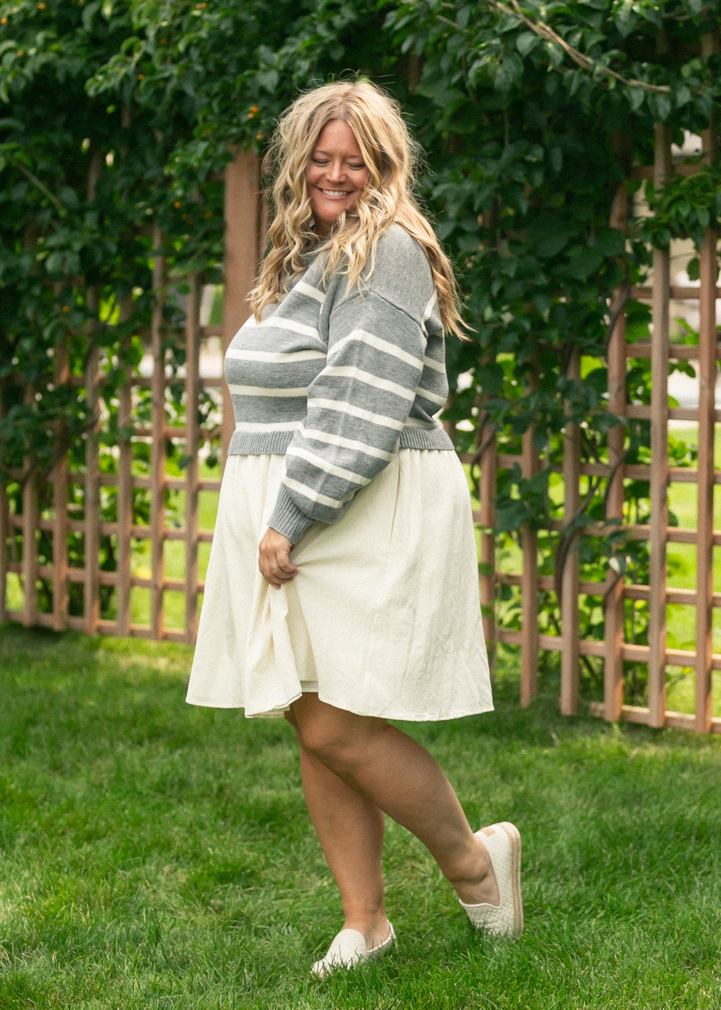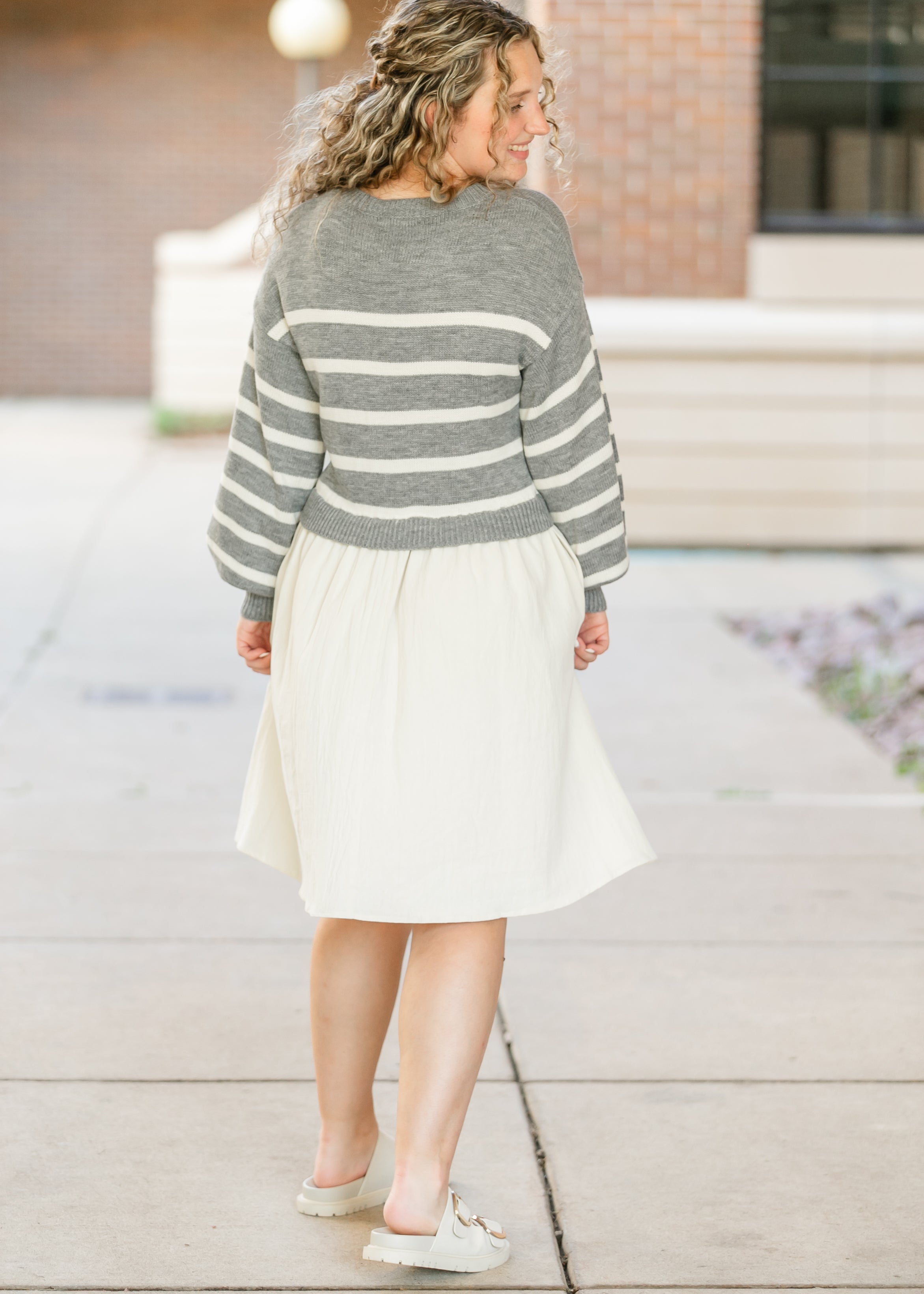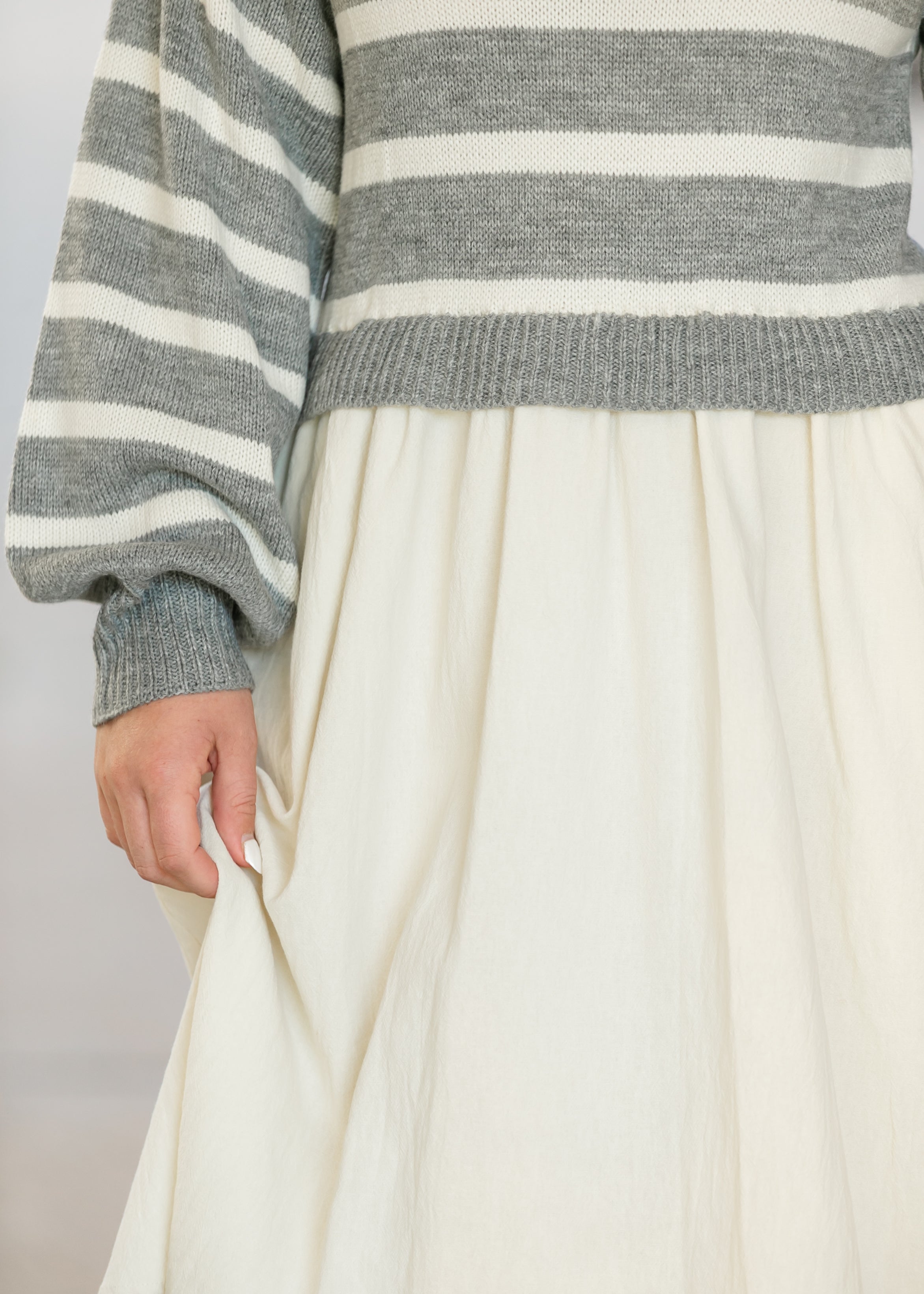 - Product Details | Sweater Bodice, Striped, knit, Lined, Drop Shoulder Sleeves, Gathered Skirt