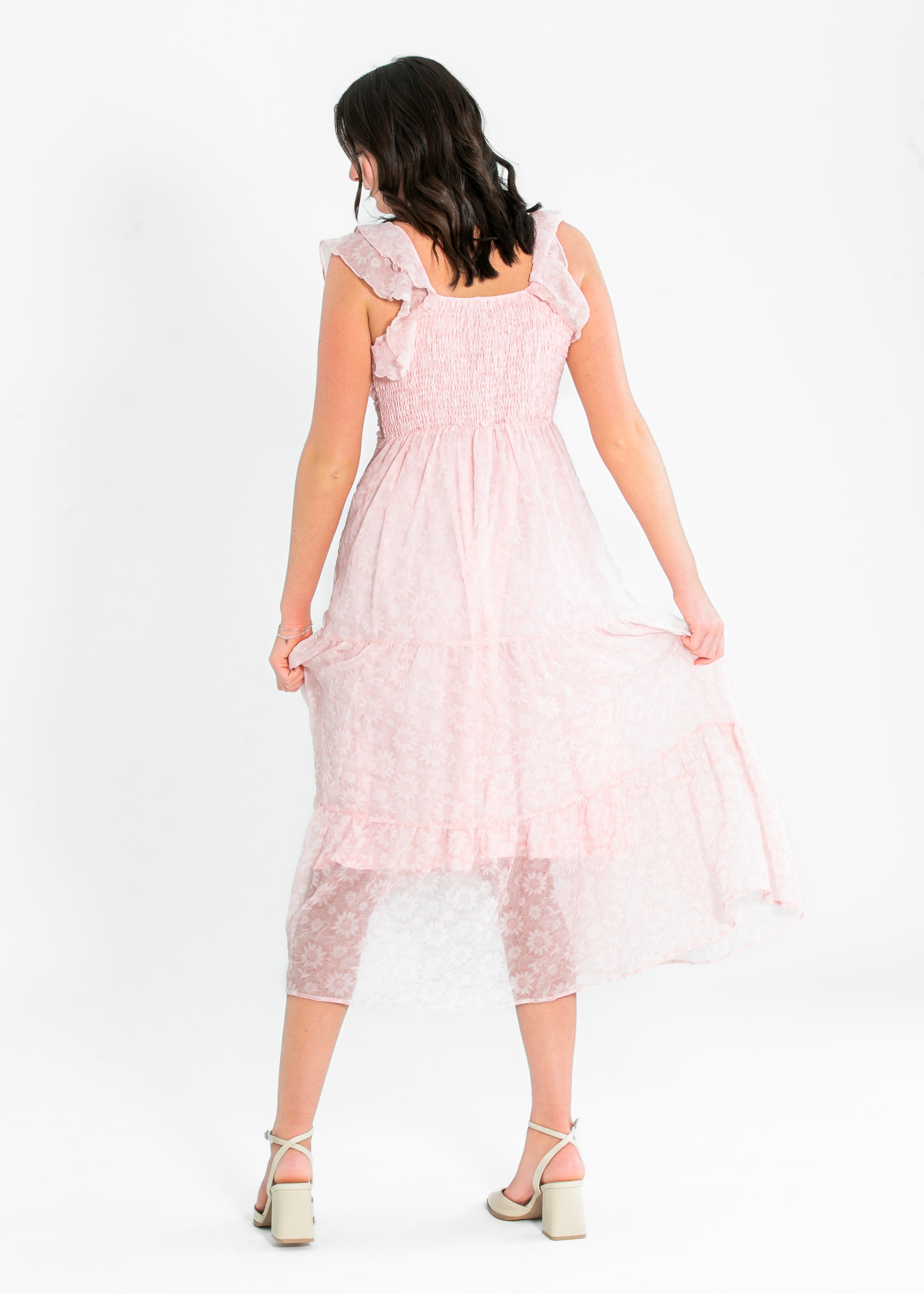 The Carrie Ruffle Sleeve Floral Maxi Dress is the perfect blend of elegance and femininity. This tea-length dress features a tiered skirt, a gathered bodice with a soft sweetheart neckline, and delicate flutter sleeves. Its allover floral texture adds a romantic charm, making it ideal for special occasions or everyday wear. Light, breathable, and effortlessly graceful!